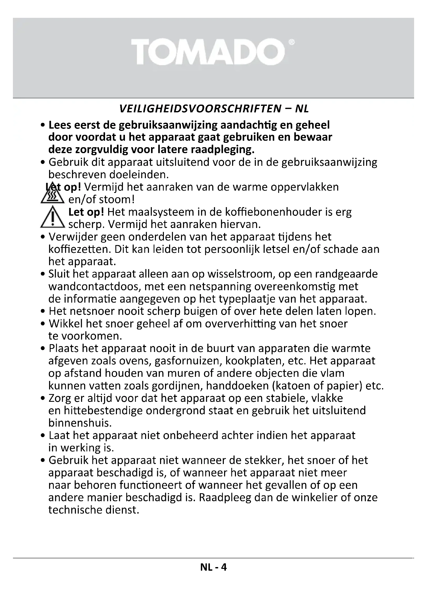 - Gebruik het apparaat niet wanneer de stekker, het snoer of het apparaat beschadigd is, of wanneer het apparaat niet meer naar behoren funconeert of wanneer het gevallen of op een andere manier beschadigd is. Raadpleeg dan de winkelier of onze technische dienst. VEILIGHEIDSVOORSCHRIFTEN – NL NL - 4• Als het aansluitsnoer van dit apparaat beschadigd raakt, moet deze door de fabrikant, diens klantenservice of een vergelijkbaar gekwaliceerd persoon worden vervangen om gevaarlijke situaes te voorkomen.