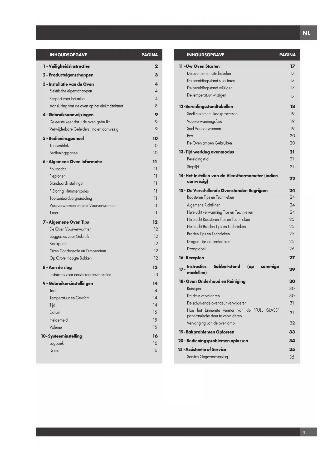 Controleer het volgende, alvorens contact op te nemen met de technische dienst, om onnodige kosten te vermijden. Ovenproblemen Stappen voor Probleemoplossing Een andere F__ foutcode verschijnt op het beeldscherm. Schakel de stroom uit en vervolgens na een paar seconden weer in. Noteer de foutcode (in het LOGBOEK) als het probleem zich blijft voordoen en neem contact op met de technische dienst. Het beeldscherm van de oven blijft UIT Schakel de stroom uit op de hoofdelektriciteitsvoorziening (zekering of stroomonderbreker). Schakel de stroomonderbreker weer in. Schakel een geautoriseerde dienst in als het probleem zich blijft voordoen. De koelventilator blijft draaien als de oven uitgeschakeld is De ventilator gaat automatisch uit als de elektronische componenten voldoende afgekoeld zijn. Oven wordt niet warm Controleer de stroomonderbreker of zekeringkast van uw huis. Zorg ervoor dat de oven op correcte wijze op de netvoeding is aangesloten. Zorg ervoor dat de oventemperatuur geselecteerd is. Oven bakt niet gelijkmatig. Raadpleeg de bereidingstabellen voor de aanbevolen rekstand. Verlaag de temperatuur altijd met 25 °F (15 °C) bij het bakken in de Hetelucht Bakken stand. Ovenlamp werkt niet goed Vervang de lamp als deze defect is of draai de lamp aan als deze los zit. Zie pagina