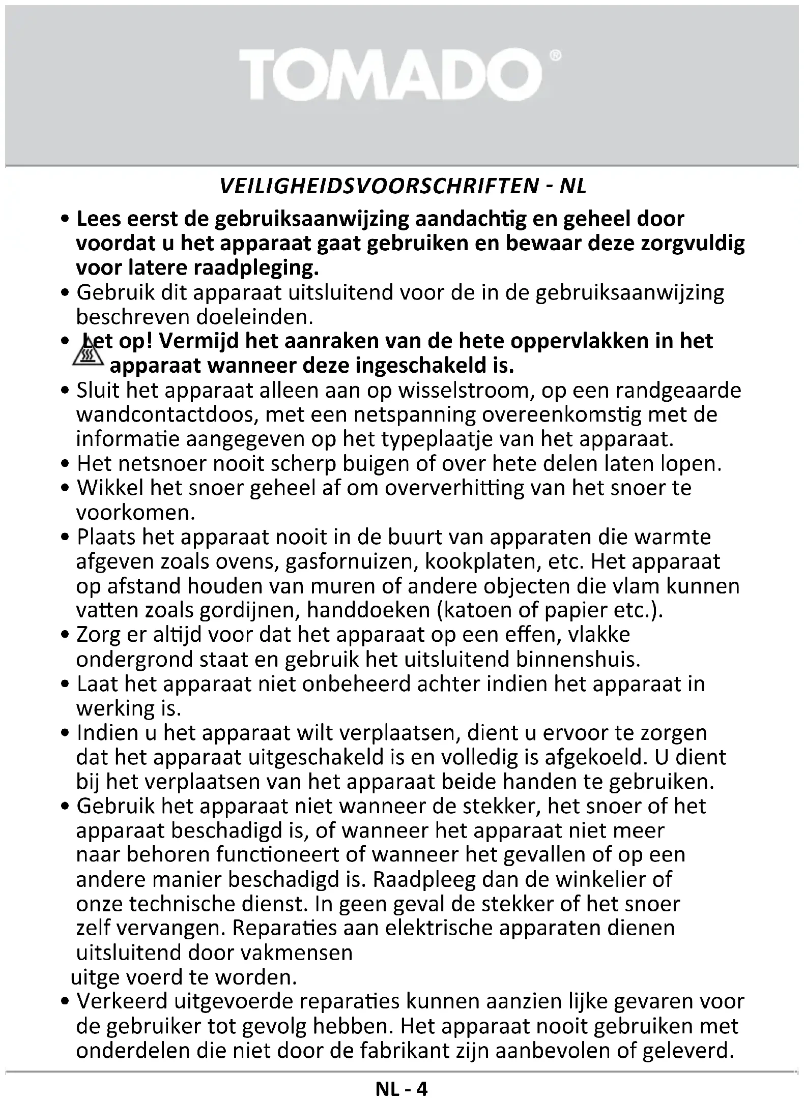 NL - 4• Niet aan het snoer c.q. het apparaat trekken om de stekker uit de wandcontactdoos te halen. Het apparaat nooit met nae of vochge handen aanraken.