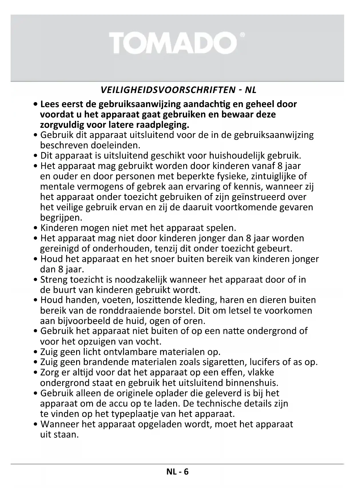 - De borstel en stofzuiger zijn speciaal ontworpen voor gebruik op tapijtenhardevloeren.Inbeperktegevallen,enaankelijkvan de soort vloer, kan het voorkomen dat er krassen ontstaan aan het te stofzuigen oppervlak. Tomado is niet verantwoordelijk voor schade ontstaan aan de vloer.