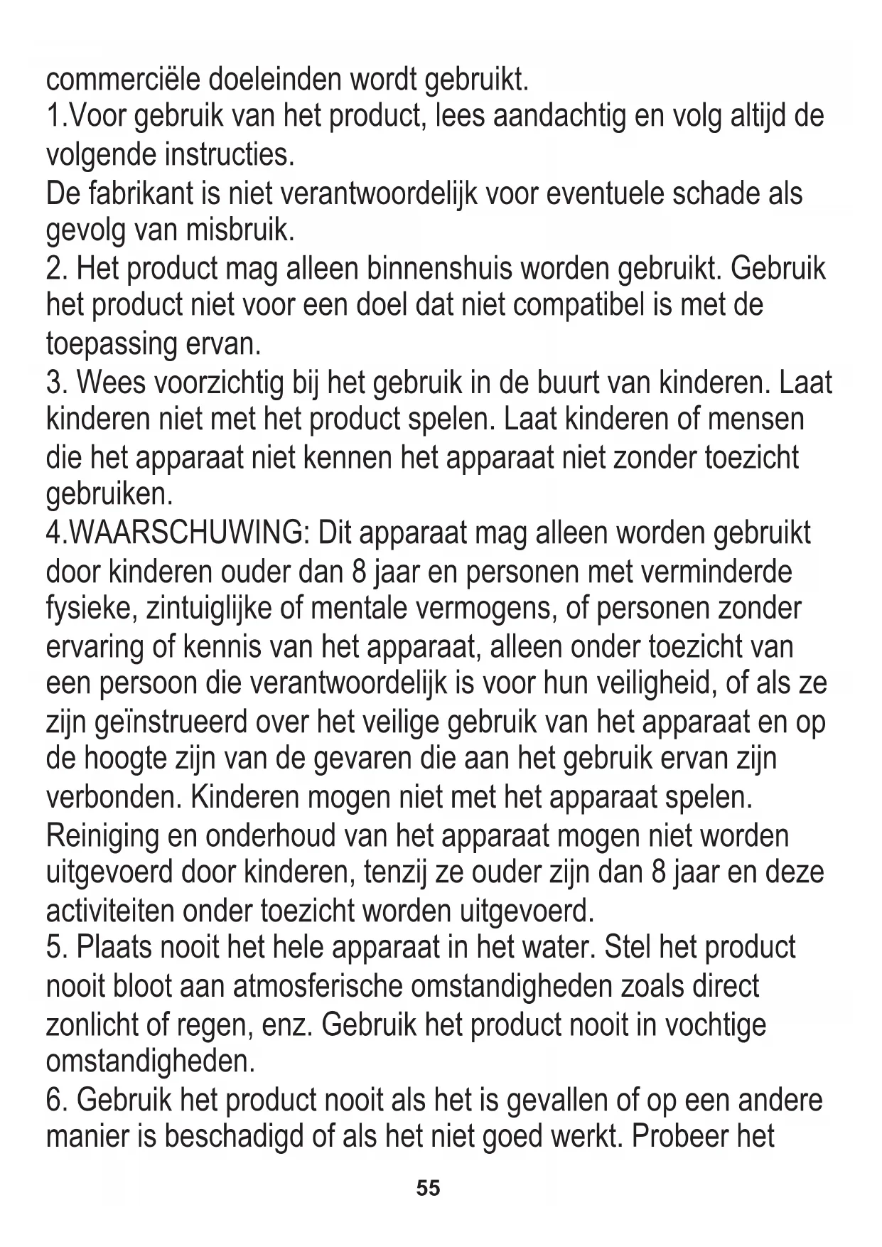 nooit bloot aan atmosferische omstandigheden zoals direct zonlicht of regen, enz. Gebruik het product nooit in vochtige omstandigheden. 1.Voor gebruik van het product, lees aandachtig en volg altijd de volgende instructies. 4.WAARSCHUWING: Dit apparaat mag alleen worden gebruikt door kinderen ouder dan 8 jaar en personen met verminderde fysieke, zintuiglijke of mentale vermogens, of personen zonder ervaring of kennis van het apparaat, alleen onder toezicht van een persoon die verantwoordelijk is voor hun veiligheid, of als ze zijn geïnstrueerd over het veilige gebruik van het apparaat en op de hoogte zijn van de gevaren die aan het gebruik ervan zijn verbonden. Kinderen mogen niet met het apparaat spelen. Reiniging en onderhoud van het apparaat mogen niet worden uitgevoerd door kinderen, tenzij ze ouder zijn dan 8 jaar en deze activiteiten onder toezicht worden uitgevoerd.56