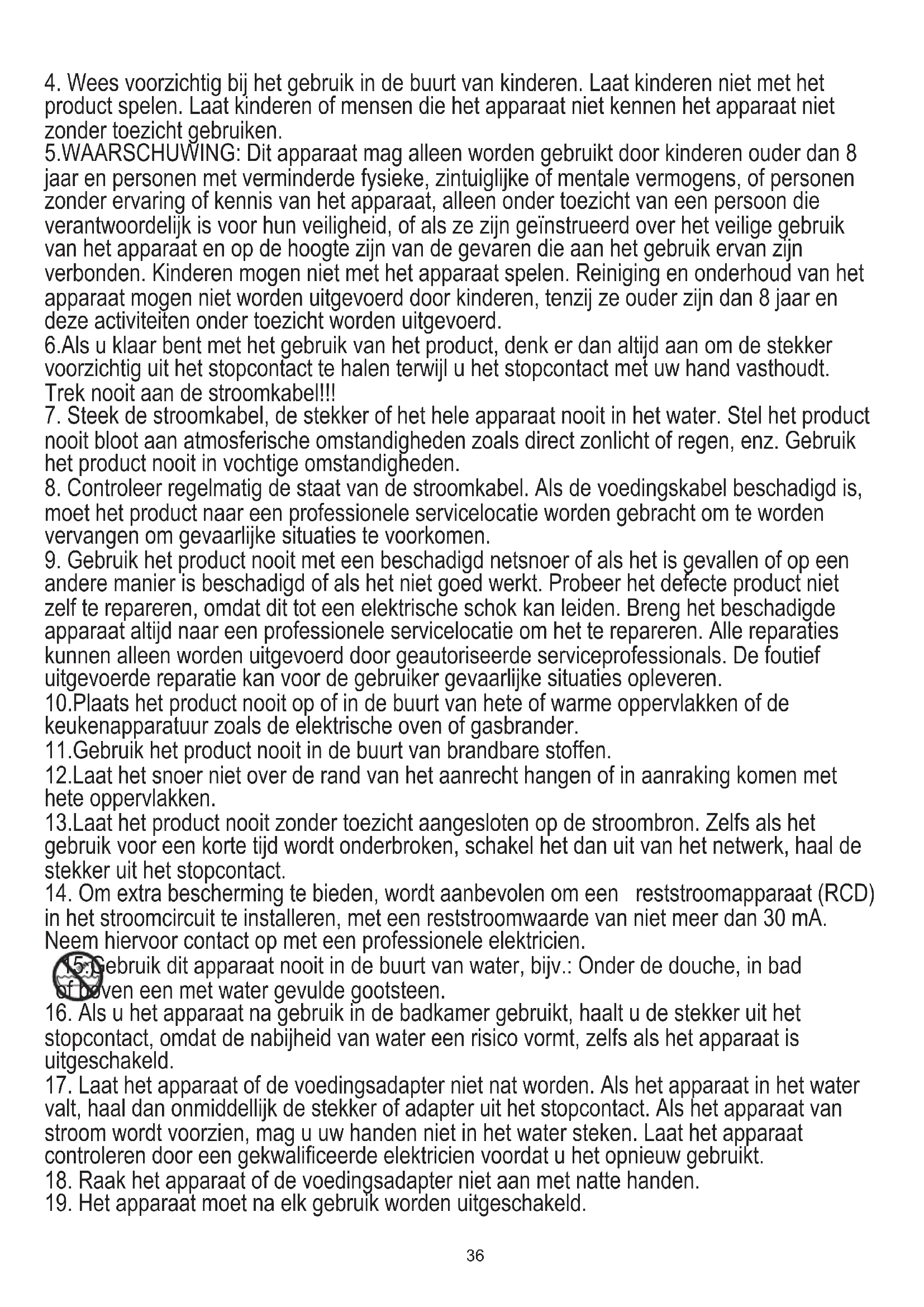 in het stroomcircuit te installeren, met een reststroomwaarde van niet meer dan 30 mA. Neem hiervoor contact op met een professionele elektricien. 15.Gebruik dit apparaat nooit in de buurt van water, bijv.: Onder de douche, in bad of boven een met water gevulde gootsteen.