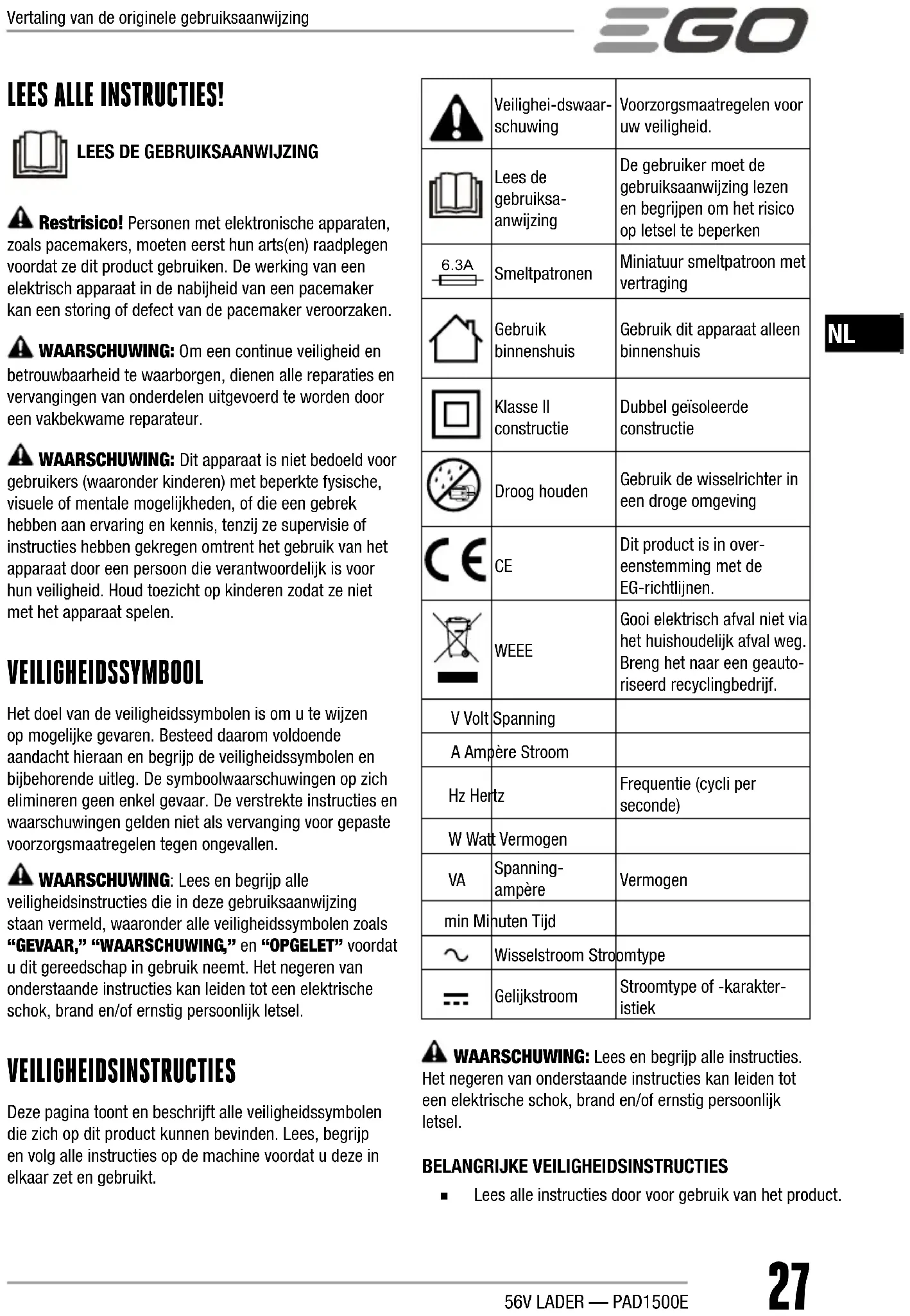 Restrisico! Personen met elektronische apparaten, zoals pacemakers, moeten eerst hun arts(en) raadplegen voordat ze dit product gebruiken. De werking van een elektrisch apparaat in de nabijheid van een pacemaker kan een storing of defect van de pacemaker veroorzaken. WAARSCHUWING: Om een continue veiligheid en betrouwbaarheid te waarborgen, dienen alle reparaties en vervangingen van onderdelen uitgevoerd te worden door een vakbekwame reparateur. WAARSCHUWING: Dit apparaat is niet bedoeld voor gebruikers (waaronder kinderen) met beperkte fysische, visuele of mentale mogelijkheden, of die een gebrek hebben aan ervaring en kennis, tenzij ze supervisie of instructies hebben gekregen omtrent het gebruik van het apparaat door een persoon die verantwoordelijk is voor hun veiligheid. Houd toezicht op kinderen zodat ze niet met het apparaat spelen. VEILIGHEIDSSYMBOOL Het doel van de veiligheidssymbolen is om u te wijzen op mogelijke gevaren. Besteed daarom voldoende aandacht hieraan en begrijp de veiligheidssymbolen en bijbehorende uitleg. De symboolwaarschuwingen op zich elimineren geen enkel gevaar. De verstrekte instructies en waarschuwingen gelden niet als vervanging voor gepaste voorzorgsmaatregelen tegen ongevallen. WAARSCHUWING: Lees en begrijp alle veiligheidsinstructies die in deze gebruiksaanwijzing staan vermeld, waaronder alle veiligheidssymbolen zoals “GEVAAR,” “WAARSCHUWING,” en “OPGELET” voordat u dit gereedschap in gebruik neemt. Het negeren van onderstaande instructies kan leiden tot een elektrische schok, brand en/of ernstig persoonlijk letsel. VEILIGHEIDSINSTRUCTIES Deze pagina toont en beschrijft alle veiligheidssymbolen die zich op dit product kunnen bevinden. Lees, begrijp en volg alle instructies op de machine voordat u deze in elkaar zet en gebruikt.Veilighei-dswaar-schuwingVoorzorgsmaatregelen voor uw veiligheid.Lees de gebruiksa-anwijzingDe gebruiker moet de gebruiksaanwijzing lezen en begrijpen om het risico op letsel te beperken 6.3A SmeltpatronenMiniatuur smeltpatroon met vertragingGebruik binnenshuisGebruik dit apparaat alleen binnenshuisKlasse II constructieDubbel geïsoleerde constructieDroog houdenGebruik de wisselrichter in een droge omgeving Dit product is in over-eenstemming met de EG-richtlijnen. WEEE Gooi elektrisch afval niet via het huishoudelijk afval weg. Breng het naar een geauto-riseerd recyclingbedrijf.V Volt SpanningA Ampère StroomHz HertzFrequentie (cycli per seconde)W Watt Vermogen Spanning-ampèreVermogenmin Minuten TijdWisselstroom StroomtypeGelijkstroomStroomtype of -karakter-istiek WAARSCHUWING: Lees en begrijp alle instructies. Het negeren van onderstaande instructies kan leiden tot een elektrische schok, brand en/of ernstig persoonlijk letsel. BELANGRIJKE VEILIGHEIDSINSTRUCTIES ◾ Lees alle instructies door voor gebruik van het product. Vertaling van de originele gebruiksaanwijzing56V LADER — PAD1500E28