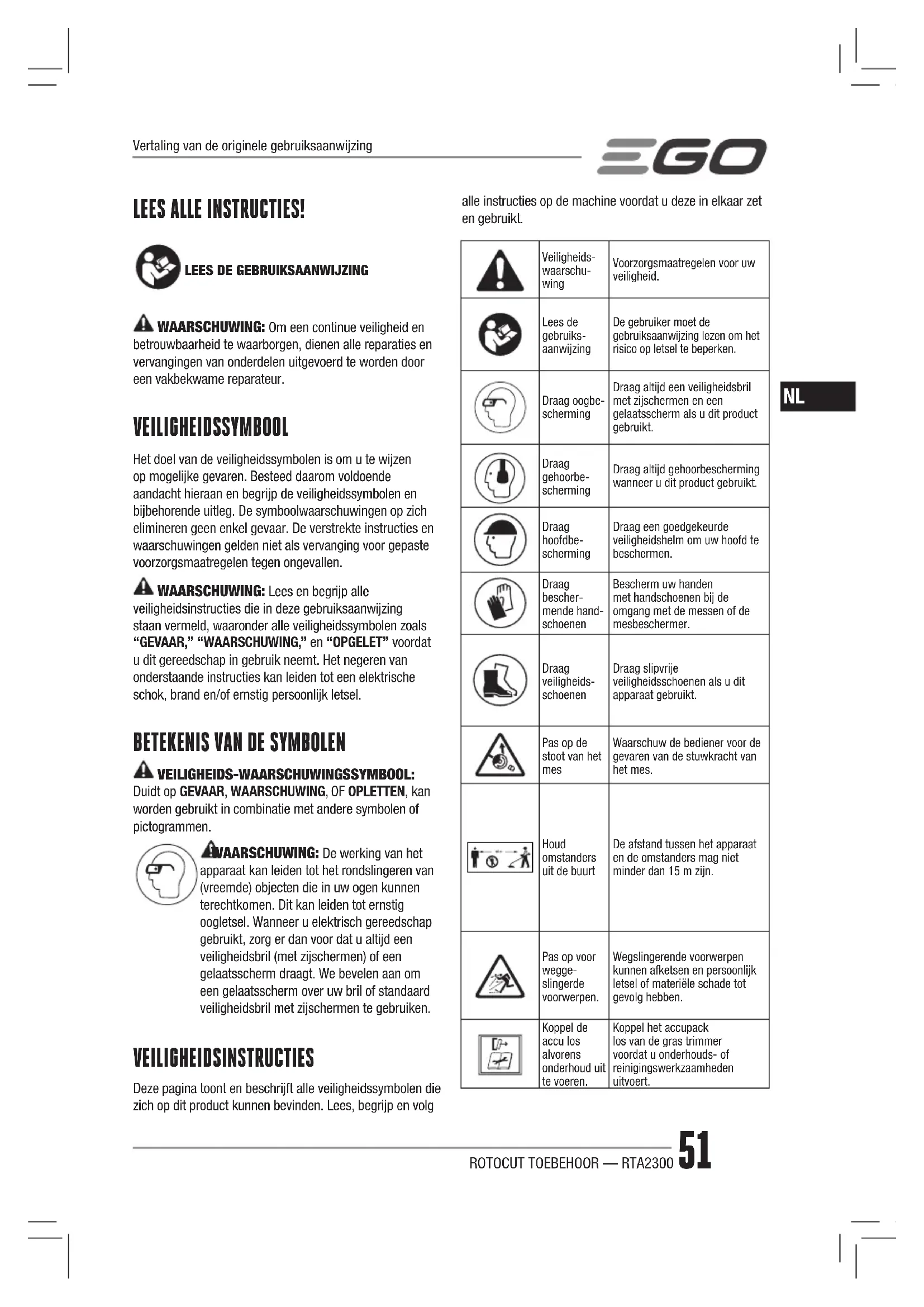 VEILIGHEIDS-WAARSCHUWINGSSYMBOOL: Duidt op GEVAAR, WAARSCHUWING, OF OPLETTEN, kan worden gebruikt in combinatie met andere symbolen of pictogrammen. WAARSCHUWING: De werking van het apparaat kan leiden tot het rondslingeren van (vreemde) objecten die in uw ogen kunnen terechtkomen. Dit kan leiden tot ernstig oogletsel. Wanneer u elektrisch gereedschap gebruikt, zorg er dan voor dat u altijd een veiligheidsbril (met zijschermen) of een gelaatsscherm draagt. We bevelen aan om een gelaatsscherm over uw bril of standaard veiligheidsbril met zijschermen te gebruiken. VEILIGHEIDSINSTRUCTIES Deze pagina toont en beschrijft alle veiligheidssymbolen die zich op dit product kunnen bevinden. Lees, begrijp en volg alle instructies op de machine voordat u deze in elkaar zet en gebruikt. Veiligheids-waarschu- wing Voorzorgsmaatregelen voor uw veiligheid.Lees de gebruiks-aanwijzingDe gebruiker moet de gebruiksaanwijzing lezen om het risico op letsel te beperken.Draag oogbe-schermingDraag altijd een veiligheidsbril met zijschermen en een gelaatsscherm als u dit product gebruikt.Draag gehoorbe-schermingDraag altijd gehoorbescherming wanneer u dit product gebruikt.Draag hoofdbe-schermingDraag een goedgekeurde veiligheidshelm om uw hoofd te beschermen.Draag bescher-mende hand-schoenenBescherm uw handen met handschoenen bij de omgang met de messen of de mesbeschermer.Draag veiligheids-schoenenDraag slipvrije veiligheidsschoenen als u dit apparaat gebruikt.Pas op de stoot van het mes Waarschuw de bediener voor de gevaren van de stuwkracht van het mes.Houd omstanders uit de buurtDe afstand tussen het apparaat en de omstanders mag niet minder dan 15 m zijn.Pas op voor wegge-slingerde voorwerpen.Wegslingerende voorwerpen kunnen afketsen en persoonlijk letsel of materiële schade tot gevolg hebben.Koppel de accu los alvorens onderhoud uit te voeren.Koppel het accupack los van de gras trimmer voordat u onderhouds- of reinigingswerkzaamheden uitvoert. Vertaling van de originele gebruiksaanwijzingROTOCUT TOEBEHOOR — RTA230052