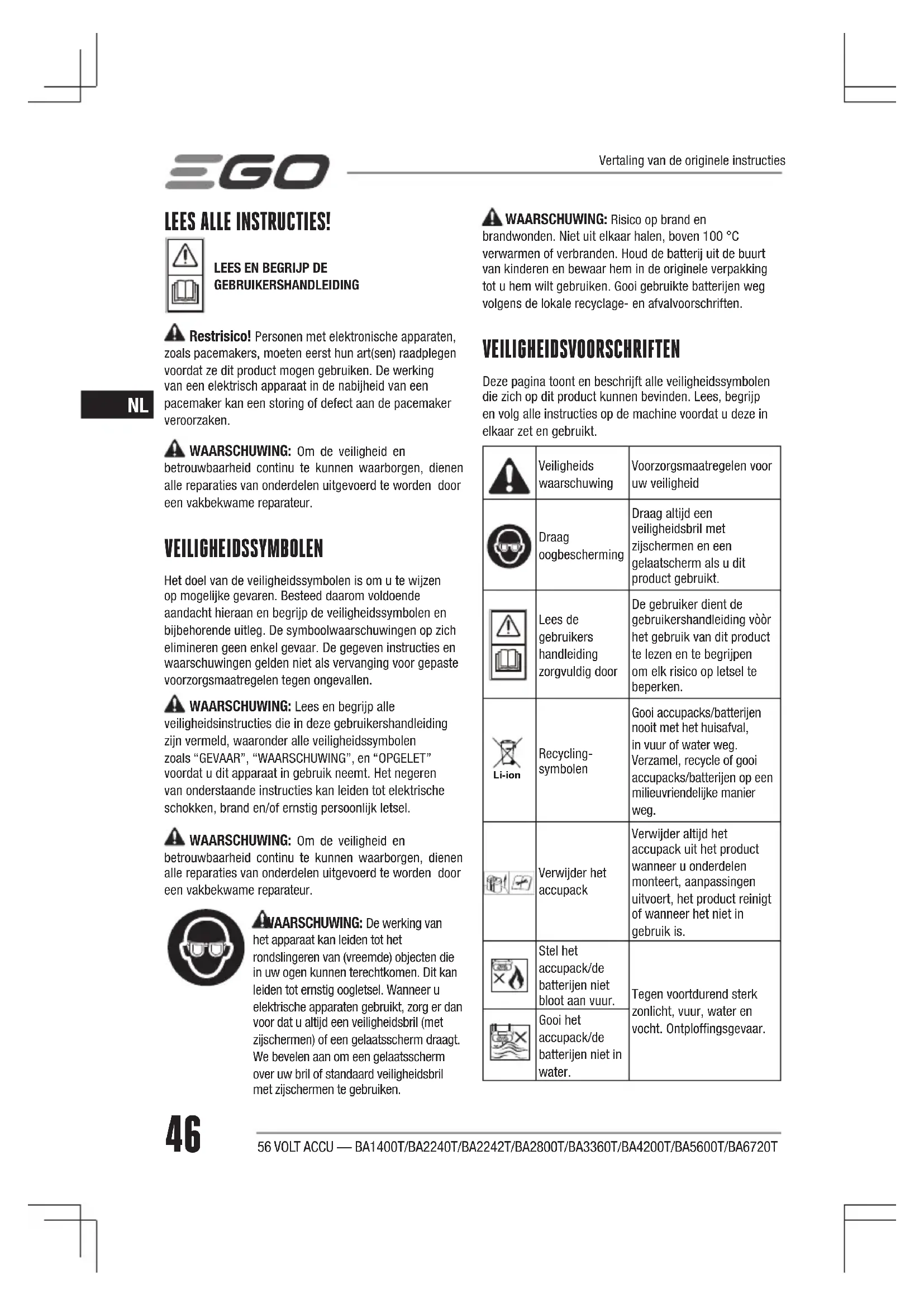 GEBRUIKERSHANDLEIDING Restrisico! Personen met elektronische apparaten, zoals pacemakers, moeten eerst hun art(sen) raadplegen voordat ze dit product mogen gebruiken. De werking van een elektrisch apparaat in de nabijheid van een pacemaker kan een storing of defect aan de pacemaker veroorzaken. WAARSCHUWING: Om de veiligheid en betrouwbaarheid continu te kunnen waarborgen, dienen alle reparaties van onderdelen uitgevoerd te worden door een vakbekwame reparateur. VEILIGHEIDSSYMBOLEN Het doel van de veiligheidssymbolen is om u te wijzen op mogelijke gevaren. Besteed daarom voldoende aandacht hieraan en begrijp de veiligheidssymbolen en bijbehorende uitleg. De symboolwaarschuwingen op zich elimineren geen enkel gevaar. De gegeven instructies en waarschuwingen gelden niet als vervanging voor gepaste voorzorgsmaatregelen tegen ongevallen. WAARSCHUWING: Lees en begrijp alle veiligheidsinstructies die in deze gebruikershandleiding zijn vermeld, waaronder alle veiligheidssymbolen zoals “GEVAAR”, “WAARSCHUWING”, en “OPGELET” voordat u dit apparaat in gebruik neemt. Het negeren van onderstaande instructies kan leiden tot elektrische schokken, brand en/of ernstig persoonlijk letsel. WAARSCHUWING: Om de veiligheid en betrouwbaarheid continu te kunnen waarborgen, dienen alle reparaties van onderdelen uitgevoerd te worden door een vakbekwame reparateur. WAARSCHUWING: De werking van het apparaat kan leiden tot het rondslingeren van (vreemde) objecten die in uw ogen kunnen terechtkomen. Dit kan leiden tot ernstig oogletsel. Wanneer u elektrische apparaten gebruikt, zorg er dan voor dat u altijd een veiligheidsbril (met zijschermen) of een gelaatsscherm draagt. We bevelen aan om een gelaatsscherm over uw bril of standaard veiligheidsbril met zijschermen te gebruiken. WAARSCHUWING: Risico op brand en brandwonden. Niet uit elkaar halen, boven 100 °C verwarmen of verbranden. Houd de batterij uit de buurt van kinderen en bewaar hem in de originele verpakking tot u hem wilt gebruiken. Gooi gebruikte batterijen weg volgens de lokale recyclage- en afvalvoorschriften. VEILIGHEIDSVOORSCHRIFTEN Deze pagina toont en beschrijft alle veiligheidssymbolen die zich op dit product kunnen bevinden. Lees, begrijp en volg alle instructies op de machine voordat u deze in elkaar zet en gebruikt. Veiligheids waarschuwing Voorzorgsmaatregelen voor uw veiligheid Draag oogbescherming Draag altijd een veiligheidsbril met zijschermen en een gelaatscherm als u dit product gebruikt. Lees de gebruikers handleiding zorgvuldig door De gebruiker dient de gebruikershandleiding vòòr het gebruik van dit product te lezen en te begrijpen om elk risico op letsel te beperken. Li-ion Recycling- symbolen Gooi accupacks/batterijen nooit met het huisafval, in vuur of water weg. Verzamel, recycle of gooi accupacks/batterijen op een milieuvriendelijke manier weg. Verwijder het accupack Verwijder altijd het accupack uit het product wanneer u onderdelen monteert, aanpassingen uitvoert, het product reinigt of wanneer het niet in gebruik is. Stel het accupack/de batterijen niet bloot aan vuur. Tegen voortdurend sterk zonlicht, vuur, water en vocht. Ontploffingsgevaar. Gooi het accupack/de batterijen niet in water. Vertaling van de originele instructies56 VOLT ACCU — BA1400T/BA2240T/BA2242T/BA2800T/BA3360T/BA4200T/BA5600T/BA6720T 47