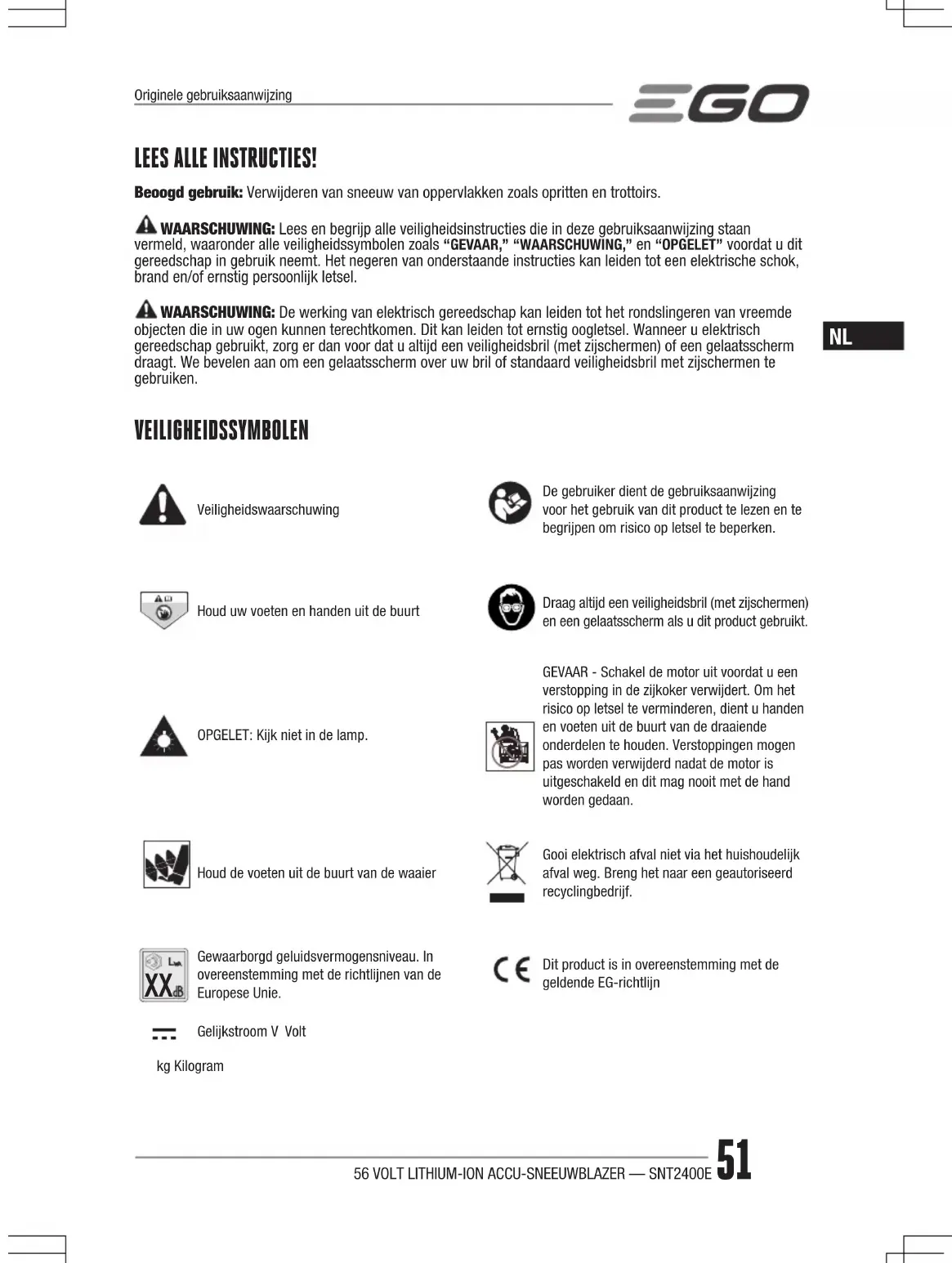 PROBLEEMOPLOSSING WAARSCHUWING: Verwijder altijd het accupack (de accupacks) tijdens onderhoud of transport van de sneeuwblazer. Bescherm altijd uw handen door handschoenen te dragen als u onderhoud aan de sneeuwblazer boor of schraper uitvoert.PROBLEEM OORZAAK OPLOSSINGDe sneeuwblazer start niet. ◾ De accu is bijna leeg. ◾ Laad de accu op. ◾ De boor-trekkerschakelaar is niet ingedrukt op het moment dat de led indicator groen knippert. ◾ Druk de boor-trekkerschakelaar als de led indicator knippert. Als de led indicator niet meer knippert, reageert de sneeuwblazer niet op het drukken op de boor-trekkerschakelaar. ◾ De boor is bevroren door sneeuw of ijs. ◾ Verwijder het accupack (de accupacks) eerst, gebruik het meegeleverde koker-reinigingsgereedschap om sneeuw of ijs te verwijderen dat de boor blokkeert. Herstart de sneeuwblazer. ◾ De accu is oververhit. De led indicator op de accu knippert oranje of brandt rood (zie alinea „ACCUBEVEILIGING TEGEN HOGE TEMPERATUREN“ in deze gebruiksaanwijzing). ◾ Verwijder de oververhitte accu uit de sneeuwblazer en wacht totdat het accupack is afgekoeld tot ongeveer 67°C. Plaats de accu vervolgens terug en start de sneeuwblazer opnieuw.De motor is ingeschakeld maar de boor gaat niet aan. ◾ De breekbout is gebroken. ◾ Vervang de breekbout overeenkomstig de alinea „DE BREEKBOUT VERVANGEN“ in deze gebruiksaanwijzing.De led-lichtknop reageert niet op de eerste keer drukken. ◾ Het interne zelfcontrolerende proces veroorzaakt een lichte vertraging bij de eerste activering van de knoppen. ◾ Druk op de led lichtknop en houd hem 1 seconde ingedrukt.de led indicator op de accu blijft aan nadat de boor van de sneeuwblazer is gestopt of het zelfaangedreven systeem uit gaat. ◾ Het elektrisch circuit bevindt zich in stand-by voor de volgende start. De led gaat automatisch uit als de sneeuwblazer gedurende 5 à 10 minuten niet wordt gebruikt. ◾ Laat het zo of verwijder de accu‘s uit het accuvak. GARANTIE Bezoek alstublieft de website egopowerplus.com voor de volledige voorwaarden van het EGO garantiebeleid.56 VOLT LITIUM-ION LEDNINGSFRI SNEBLÆSER — SNT2400E 59