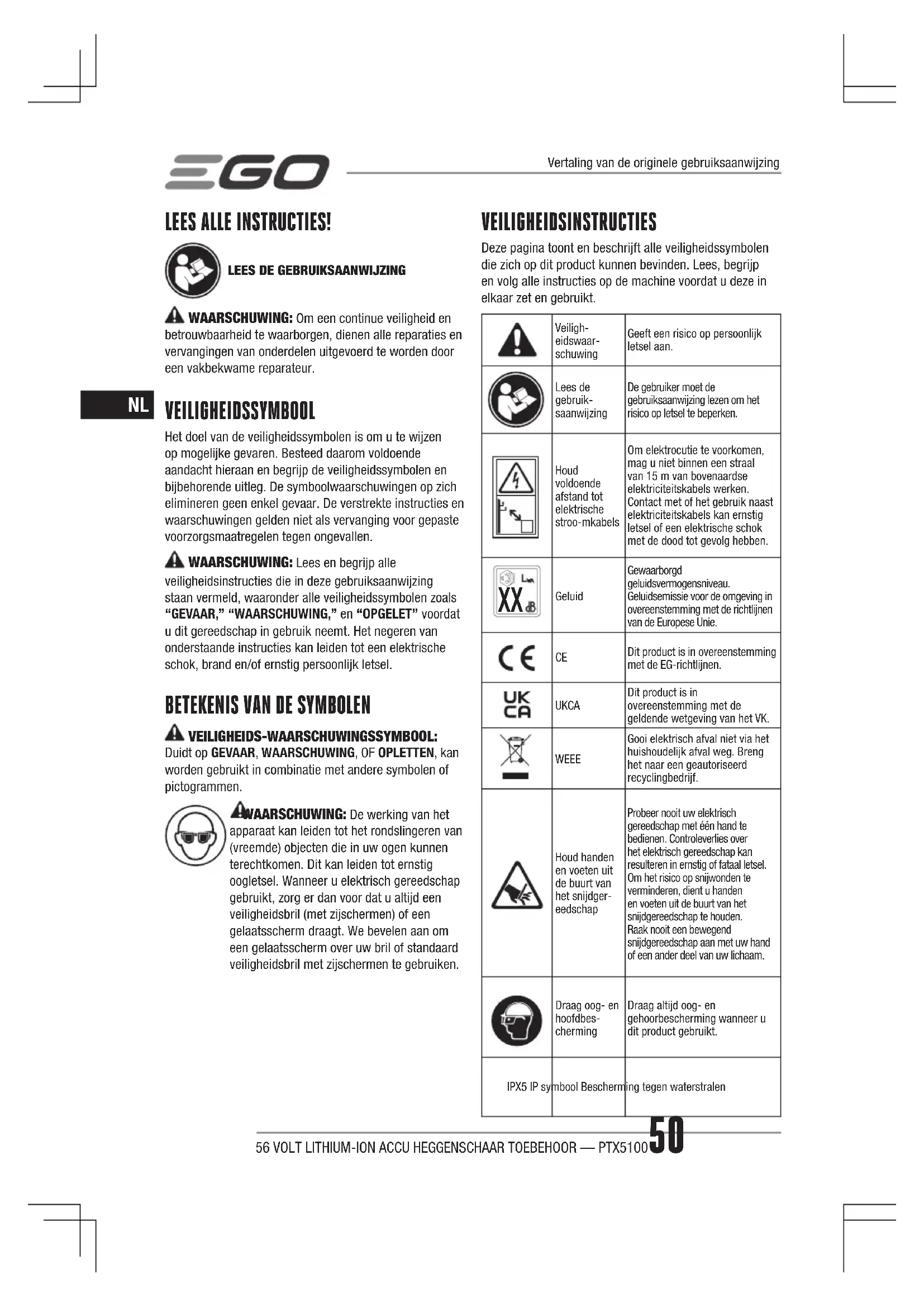 WEEE Gooi elektrisch afval niet via het huishoudelijk afval weg. Breng het naar een geautoriseerd recyclingbedrijf.Houd handen en voeten uit de buurt van het snijdger-eedschapProbeer nooit uw elektrisch gereedschap met één hand te bedienen. Controleverlies over het elektrisch gereedschap kan resulteren in ernstig of fataal letsel. Om het risico op snijwonden te verminderen, dient u handen en voeten uit de buurt van het snijdgereedschap te houden. Raak nooit een bewegend snijdgereedschap aan met uw hand of een ander deel van uw lichaam.Draag oog- en hoofdbes-chermingDraag altijd oog- en gehoorbescherming wanneer u dit product gebruikt.IPX5 IP symbool Bescherming tegen waterstralenVertaling van de originele gebruiksaanwijzing56 VOLT LITHIUM-ION ACCU HEGGENSCHAAR TOEBEHOOR — PTX5100 51