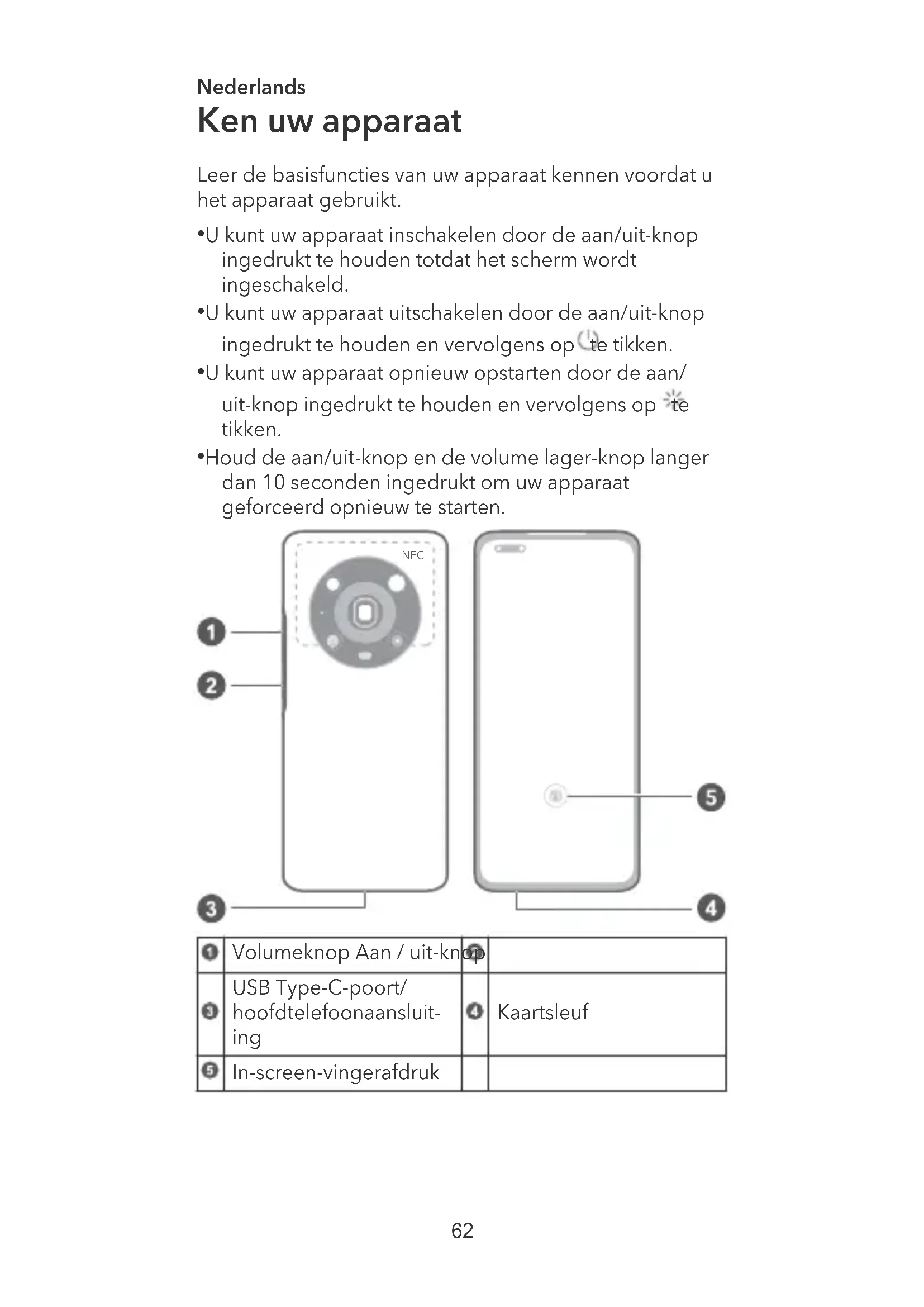 - Houd de aan/uit-knop en de volume lager-knop langer dan 10 seconden ingedrukt om uw apparaat geforceerd opnieuw te starten. NFC Volumeknop Aan / uit-knop USB Type-C-poort/ hoofdtelefoonaansluit- ing Kaartsleuf In-screen-vingerafdruk 62• Houd het NFC-gedeelte dicht bij andere apparaten of objecten wanneer u de NFC-functie gebruikt.