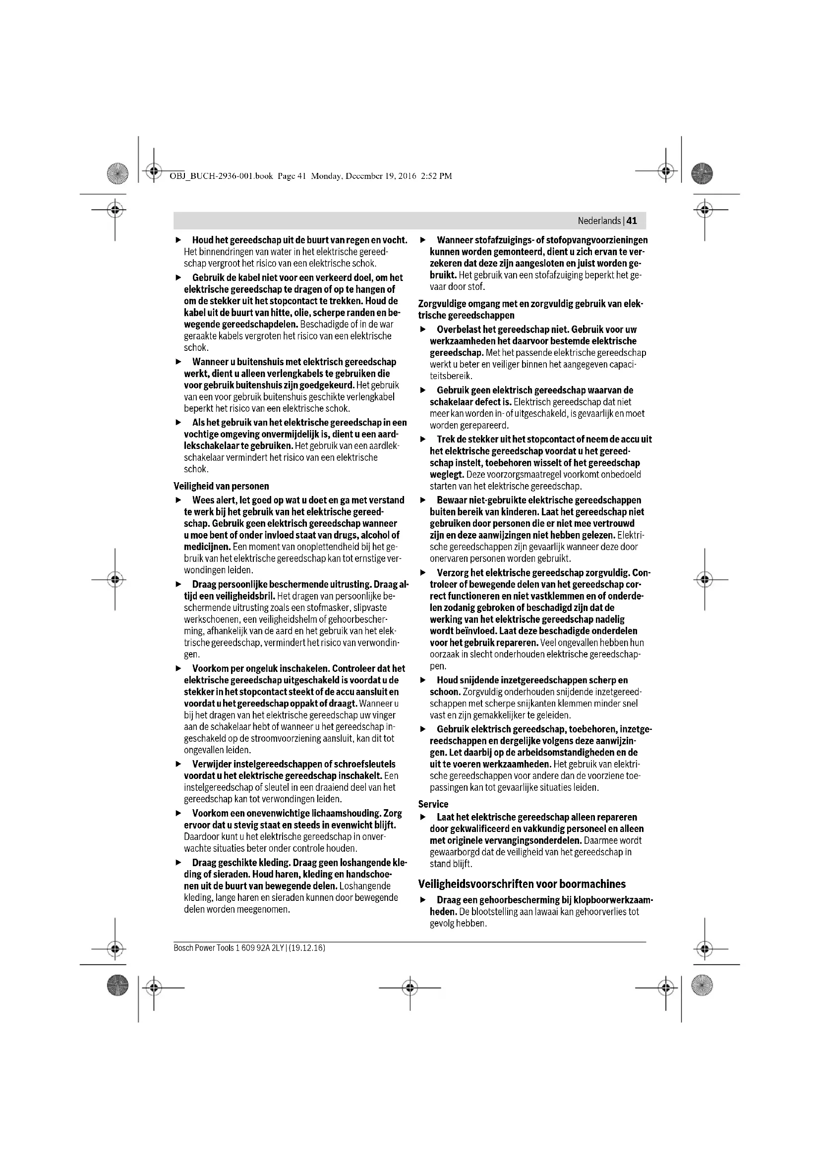 Il disinserimento rapido (Kickback Control) consente un migliore controllo sull’elettroutensile, migliorando così anche la protezione dell’utilizzatore rispetto agli elettroutensili senza Kickback Control. In caso di rota- zione improvvisa ed imprevista dell’elettroutensile at- torno all’asse della punta, l’elettroutensile si arresta automaticamente. Per la rimessa in funzione rilasciare l’interruttore di avvio/ar- resto ed azionarlo di nuovo. Se la funzione KickBack Control è difettosa, non sarà più possibile accendere il trapano. Far riparare l’elet- troutensile esclusivamente da personale specializzato e solo impiegando parti di ricambio originali. Regolazione della velocità/frequenza colpi È possibile regolare a variazione continua la velocità/frequen- za di colpi dell’elettroutensile in funzione operando con la pressione che si esercita sull’interruttore avvio/arresto 6. Esercitando una leggera pressione sull’interruttore di av- vio/arresto 6 si ha una riduzione della velocità/numero fre- quenza colpi. Aumentando la pressione si aumenta la veloci- tà/numero frequenza colpi. Preselezione della velocità/frequenza colpi Tramite la rotellina per la selezione del numero di giri 7 è pos- sibile preselezionare la richiesta velocità/frequenza colpi an- che durante la fase di funzionamento. La velocità/frequenza colpi richiesta dipende dal tipo di mate- riale in lavorazione e dalle specifiche condizioni operative e può essere dunque determinata a seconda del caso eseguen- do delle prove pratiche. OBJ_BUCH-2936-001.book Page 39 Monday, December 19, 2016 2:52 PM40 | Nederlands 1 609 92A 2LY | (19.12.16) Bosch Power Tools Indicazioni operative Prima di qualunque intervento sull’elettroutensile estrarre la spina di rete dalla presa. Applicare l’elettroutensile sul dado/vite solo quando è spento. Utensili accessori in rotazione possono scivolare. In seguito a lunghe operazioni di lavoro a bassa velocità, per farlo raffreddare, lasciar ruotare l’elettroutensile in funziona- mento a vuoto per ca. 3 minuti alla massima velocità. Manutenzione ed assistenza Manutenzione e pulizia Prima di qualunque intervento sull’elettroutensile estrarre la spina di rete dalla presa. Per poter garantire buone e sicure operazioni di lavoro, tenere sempre puliti l’elettroutensile e le prese di ven- tilazione. Qualora si rendesse necessaria una sostituzione del cavo di collegamento, la stessa deve essere effettuata dalla Bosch oppure da un centro di assistenza clienti autorizzato per elet- troutensili Bosch per evitare pericoli per la sicurezza. Assistenza clienti e consulenza impieghi Il servizio di assistenza risponde alle Vostre domande relative alla riparazione ed alla manutenzione del Vostro prodotto nonché concernenti le parti di ricambio. Disegni in vista esplosa ed informazioni relative alle parti di ricambio sono consultabili anche sul sito: www.bosch-pt.com Il team Bosch che si occupa della consulenza impieghi vi aiu- terà in caso di domande relative ai nostri prodotti ed ai loro accessori. In caso di richieste o di ordinazione di pezzi di ricambio, comunicare sempre il codice prodotto a 10 cifre riportato sulla targhetta di fabbricazione del prodotto. Italia Officina Elettroutensili Robert Bosch S.p.A. Corso Europa 2/A 20020 LAINATE (MI) Tel.: (02) 3696 2663 Fax: (02) 3696 2662 Fax: (02) 3696 8677 E-Mail: officina.elettroutensili@it.bosch.com Svizzera Sul sito www.bosch-pt.com/ch/it è possible ordinare diretta- mente on-line i ricambi. Tel.: (044) 8471513 Fax: (044) 8471553 E-Mail: Aftersales.Service@de.bosch.com Smaltimento Avviare ad un riciclaggio rispettoso dell’ambiente gli imballag- gi, gli elettroutensili e gli accessori dismessi. Non gettare elettroutensili dismessi tra i rifiuti domestici! Solo per i Paesi della CE: Conformemente alla norma della direttiva 2012/19/UE sui rifiuti di apparecchiature elettriche ed elettroniche (RAEE) ed all’at- tuazione del recepimento nel diritto nazio- nale, gli elettroutensili diventati inservibili devono essere raccolti separatamente ed es- sere inviati ad una riutilizzazione ecologica. Con ogni riserva di modifiche tecniche. Nederlands Veiligheidsvoorschriften Algemene veiligheidswaarschuwingen voor elektrische gereedschappen Lees alle veiligheidswaar- schuwingen en alle voor- schriften. Als de waarschuwingen en voorschriften niet worden opgevolgd, kan dit een elektrische schok, brand of ernstig letsel tot gevolg hebben. Bewaar alle waarschuwingen en voorschriften voor toe- komstig gebruik. Het in de waarschuwingen gebruikte begrip „elektrisch ge- reedschap” heeft betrekking op elektrische gereedschappen voor gebruik op het stroomnet (met netsnoer) en op elektri- sche gereedschappen voor gebruik met een accu (zonder net- snoer). Veiligheid van de werkomgeving Houd uw werkomgeving schoon en goed verlicht. Een rommelige of onverlichte werkomgeving kan tot ongeval- len leiden. Werk met het elektrische gereedschap niet in een om- geving met explosiegevaar waarin zich brandbare vloeistoffen, brandbare gassen of brandbaar stof be- vinden. Elektrische gereedschappen veroorzaken vonken die het stof of de dampen tot ontsteking kunnen brengen. Houd kinderen en andere personen tijdens het gebruik van het elektrische gereedschap uit de buurt. Wanneer u wordt afgeleid, kunt u de controle over het gereedschap verliezen. Elektrische veiligheid De aansluitstekker van het elektrische gereedschap moet in het stopcontact passen. De stekker mag in geen geval worden veranderd. Gebruik geen adapter- stekkers in combinatie met geaarde elektrische ge- reedschappen. Onveranderde stekkers en passende stopcontacten beperken het risico van een elektrische schok. Voorkom aanraking van het lichaam met geaarde op- pervlakken, bijvoorbeeld van buizen, verwarmingen, fornuizen en koelkasten. Er bestaat een verhoogd risico door een elektrische schok wanneer uw lichaam geaard is. WAARSCHUWING OBJ_BUCH-2936-001.book Page 40 Monday, December 19,