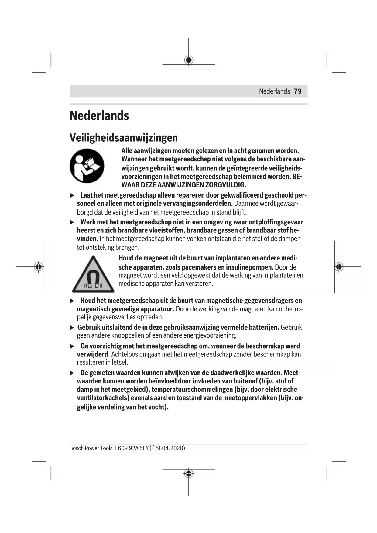 Voorbeelden Aan alle kanten gesloten bouwwer- ken met verwarming 9 ± 3 bijv. tafels, stoelen, kasten in woon- kamer/keuken (bij verwarming in de winter) Aan alle kanten gesloten bouwwer- ken zonder verwarming 12 ± 3 bijv. kelderschappen (zonder ver- warming) Overdekte, open bouwwerken 15 ± 3 bijv. carports Constructies die aan alle kanten aan weersinvloeden zijn blootgesteld 18 ± 6 bijv. buitenmuren van tuinhuizen Andere houtvochtwaarden: – Bouw van houten huizen: max. 18% 1 609 92A 5EY | (29.04.2020) Bosch Power ToolsNederlands | 87 – Parket: 9% ± 2% – Vloeren: max. 12% – Blinde vloeren: max. 20% – Ondervloeren: max. 15% – Trappen: 9% ± 3% – Brandhout: max. 22% (optimaal <17%) Zelftestfunctie De zelftestfunctie controleert de werking van het meetgereedschap. Schakel het meetgereedschap in (zie „In-/uitschakelen“, Pagina84). Verwijder de beschermkap (6). Houd de pennen (5) bij de metalen contacten (12) op de achterkant van de bescherm- kap (6) (zie afbeelding C). Vergelijk de waarde op het display met de waarden die op de beschermkap (6) zijn ge- drukt overeenkomstig uw ingestelde houtgroep: – houtgroep A: 11,1%–11,9% – houtgroep B: 9,8%–10,4% Als de waarden niet overeenstemmen, laat het meetgereedschap dan via uw leverancier naar de Bosch-klantenservice sturen. Aanwijzingen voor werkzaamheden Invloeden op het meetresultaat De nauwkeurigheid van de meetwaarden is het grootste, wanneer de omgevingstempe- ratuur overeenstemt met de temperatuur van het te meten stuk hout. Het meetresultaat kan worden beïnvloed door: – houtgroep en houtsubgroep – temperatuur van het te meten stuk hout – indeling van het te meten stuk hout in kernhout en spinthout – insteekdiepte van de pennen in het te meten stuk hout – oppervlaktebehandeling van het te meten stuk hout (bijv. olie of lak) – meting parallel of loodrecht op structuur of nerf van het te meten stuk hout – verdeling van het vocht – meetpunt (bijv. in het midden of uiteinde van het stuk hout) – toestand en aard van het stuk hout: hout moet vrij zijn van rotting, knoesten en andere gebreken Bosch Power Tools 1 609 92A 5EY | (29.04.2020)88 | Nederlands Let op: Wanneer exacte waarden nodig zijn, moet een meting volgens de thermogravi- metrische methode worden uitgevoerd (exacte laboratoriumprocedure conform DIN 52183). Storingen – oorzaken en oplossingen Oorzaak Verhelpen Waarschuwingssymbool (c), temperatuuraanduiding (d) en „Err“ op het display Omgevingstemperatuur bevindt zich buiten de gebruikstemperatuur van –5 °C tot +50 °C. Wachten tot het meetgereedschap de ge- bruikstemperatuur bereikt. Bij houtgroep A: > 74,7 % en „HI“ op het display Bij houtgroep B: > 61,9 % en „HI“ op het display Houtvocht buiten het meetbereik (te hoog) Hernieuwde meting op andere plek in het hout. Aanduiding „– –.–“ op het display Houtvocht buiten het meetbereik (te laag) of meting niet correct uitgevoerd Hernieuwde meting op andere plek in het hout. Het meetgereedschap bewaakt de correcte werking bij elke meting. Als een defect wordt vastgesteld, verschijnen „Err" en het waarschuwingssymbool (c) op het display. Schakel het meetgereedschap uit en weer in. Als de fout blijft bestaan, verwijder dan de batterij- en en plaats deze na enkele seconden weer. Wanneer een fout niet met de bovenge- noemde maatregelen kan worden verholpen, laat u het meetgereedschap via uw leveran- cier naar de Bosch-klantenservice sturen. Onderhoud en service Onderhoud en reiniging Controleer het meetgereedschap altijd voor het gebruik. Bij zichtbare beschadigingen of losse delen binnenin het meetgereedschap is de veilige werking niet meer gewaarborgd. Bewaar en transporteer het meetgereedschap alleen in een geschikte houder zoals de originele verpakking. Stuur het meetgereedschap voor reparatie in de originele verpakking op. Plak geen stickers over de pennen. Houd het meetgereedschap altijd schoon. Dompel het meetgereedschap niet in water of andere vloeistoffen. 1 609 92A 5EY | (29.04.2020) Bosch Power ToolsNederlands | 89 Verwijder vuil met een vochtige, zachte doek. Gebruik geen reinigings- of oplosmiddelen. Tijdens het reinigen mag geen vloeistof in het meetgereedschap binnendringen. Klantenservice en gebruiksadvies Onze klantenservice beantwoordt uw vragen over reparatie en onderhoud van uw pro- duct en over vervangingsonderdelen. Explosietekeningen en informatie over vervan- gingsonderdelen vindt u ook op: www.bosch-pt.com Het Bosch-gebruiksadviesteam helpt u graag bij vragen over onze producten en acces- soires. Vermeld bij vragen en bestellingen van vervangingsonderdelen altijd het uit tien cijfers bestaande productnummer volgens het typeplaatje van het product. België Tel.: (02) 588 0589 Fax: (02) 588 0595 E-Mail : outillage.gereedschap@be.bosch.com Nederland Tel.: (076) 579 54 54 Fax: (076) 579 54 94 E-mail: gereedschappen@nl.bosch.com Afvalverwijdering Meetgereedschappen, accessoires en verpakkingen dienen op een voor het milieu ver- antwoorde manier te worden gerecycled. Gooi meetgereedschappen en batterijen niet bij het huisvuil! Alleen voor landen van de EU: Volgens de Europese richtlijn 2012/19/EU moeten niet meer bruikbare meetgereed- schappen en volgens de Europese richtlijn 2006/66/EG moeten defecte of verbruikte accu’s/batterijen apart worden ingezameld en op een voor het milieu verantwoorde wijze worden gerecycled. Bosch Power Tools 1 609 92A 5EY | (29.04.2020)90 | Dansk Dansk Sikkerhedsinstrukser Læs og følg samtlige anvisninger. Hvis måleværktøjet ikke anvendes i overensstemmelse med de foreliggende anvisninger, kan funktionen af de integrerede beskyttelsesforanstaltninger i måleværktøjet blive forringet. OPBEVAR ANVISNINGERNE ET SIKKERT STED. u Sørg for, at reparationer på måleværktøjet kun udføres af kvalificerede fagfolk, og at der kun benyttes originale reservedele. Dermed sikres størst mulig sikkerhed i forbindelse med måleværktøjet. u Brug ikke måleværktøjet i ekspl