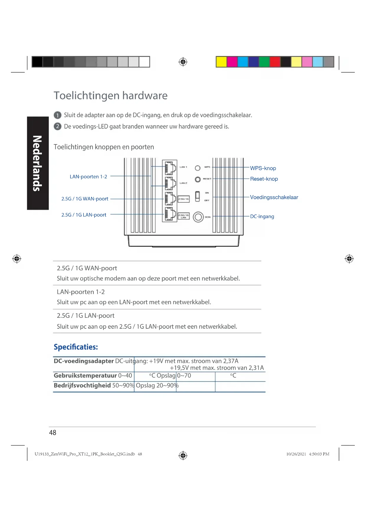 Bedrijfsvochtigheid 50~90% Opslag 20~90% Specicaties: LAN-poorten 1-22.5G / 1G WAN-poort2.5G / 1G LAN-poortWPS-knopReset-knopVoedingsschakelaarDC-ingang U19133_ZenWiFi_Pro_XT12_1PK_Booklet_QSG.indb 48U19133_ZenWiFi_Pro_XT12_1PK_Booklet_QSG.indb 48 10/26/2021 4:50:03 PM10/26/2021 4:50:03 PM49 Nederlands Bezig met instellen van een onafhankelijke router