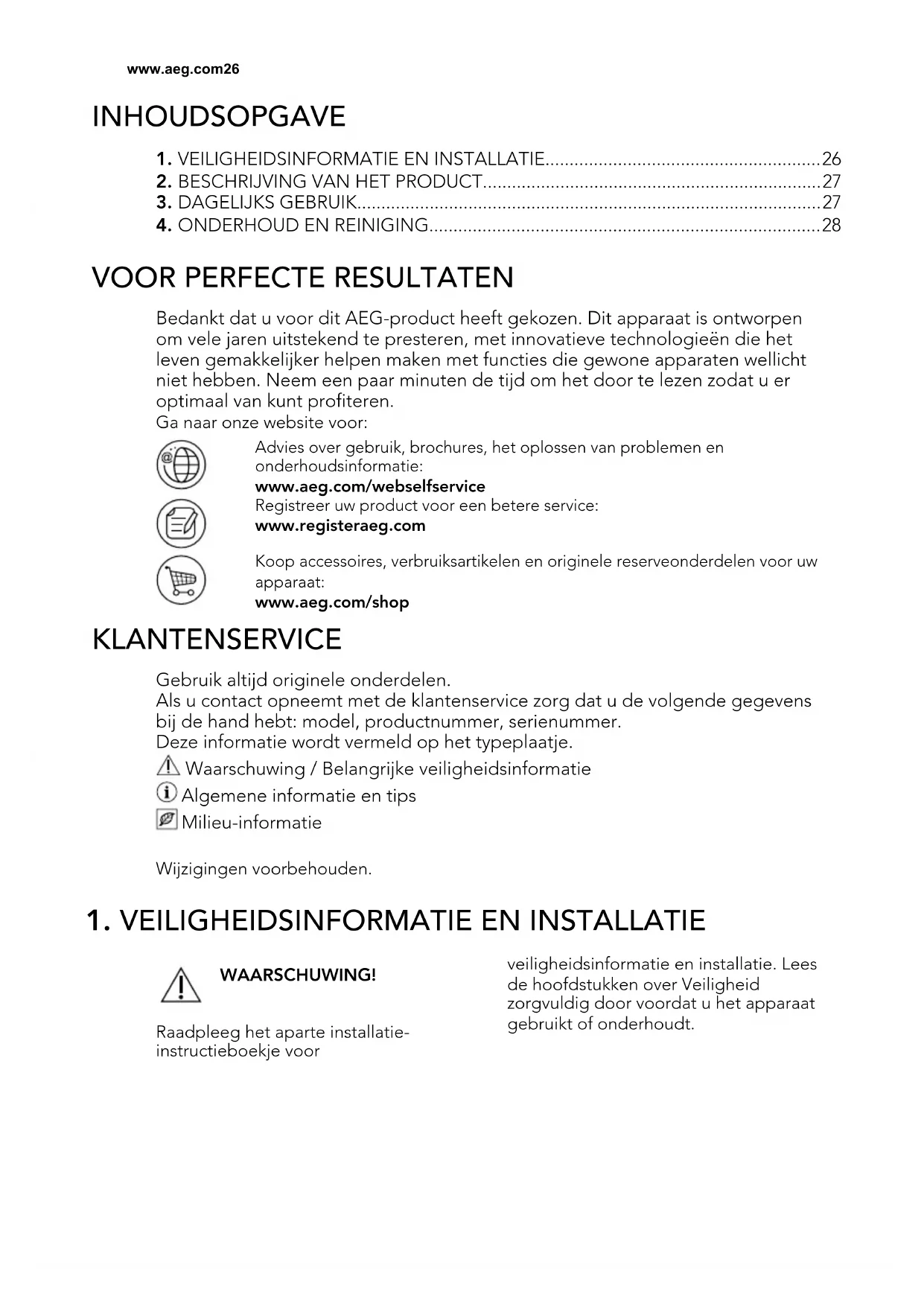 Bedankt dat u voor dit AEG-product heeft gekozen. Dit apparaat is ontworpen om vele jaren uitstekend te presteren, met innovatieve technologieën die het leven gemakkelijker helpen maken met functies die gewone apparaten wellicht niet hebben. Neem een paar minuten de tijd om het door te lezen zodat u er optimaal van kunt profiteren. Ga naar onze website voor: Advies over gebruik, brochures, het oplossen van problemen en onderhoudsinformatie: www.aeg.com/webselfservice Registreer uw product voor een betere service: www.registeraeg.com Koop accessoires, verbruiksartikelen en originele reserveonderdelen voor uw apparaat: www.aeg.com/shop KLANTENSERVICE Gebruik altijd originele onderdelen. Als u contact opneemt met de klantenservice zorg dat u de volgende gegevens bij de hand hebt: model, productnummer, serienummer. Deze informatie wordt vermeld op het typeplaatje. Waarschuwing / Belangrijke veiligheidsinformatie Algemene informatie en tips Milieu-informatie Wijzigingen voorbehouden.