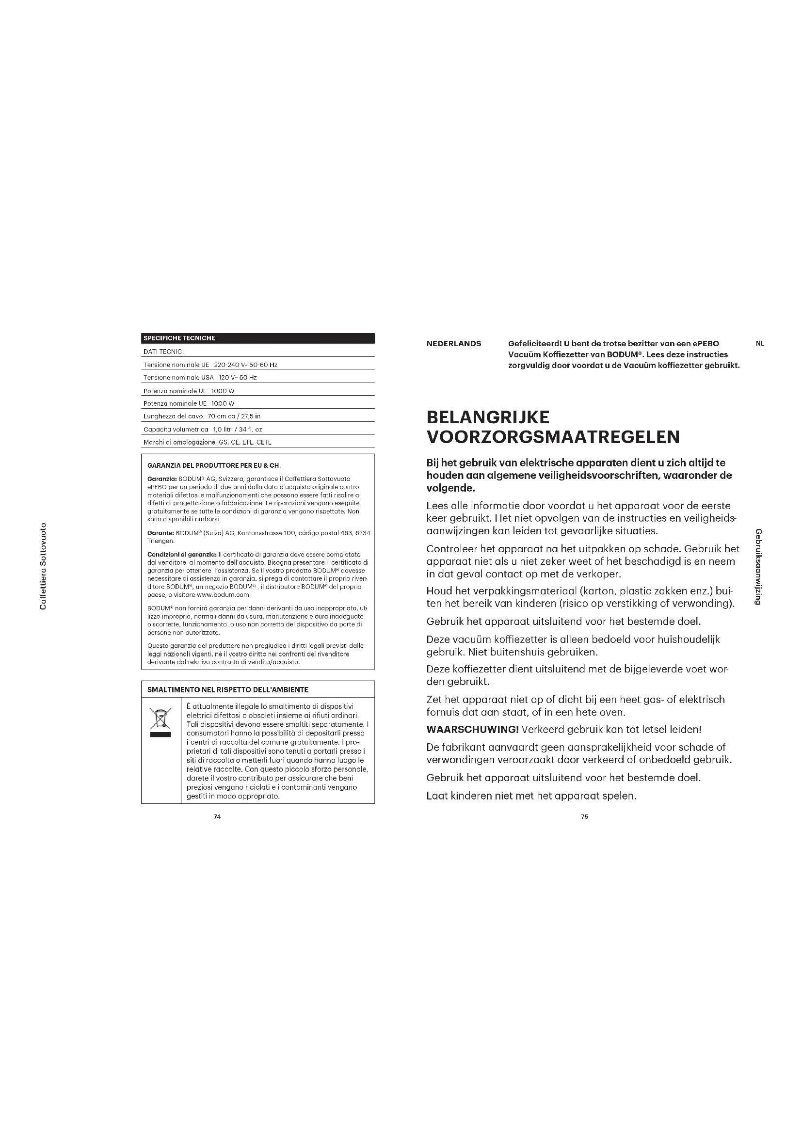 Gebruiksaanwijzing Vacuüm koiezetter 821 Deksel trechter 12 Maatschepje 2 Filter 15 Roerlepel 3 Trechter 16 Borstel 4 Klep trechter Controleer of het ilter (2) geen gemalen koie meer bevat voordat u het in de vaatwasser zet. Spoel de kan schoon onder stromend, warm, schoon water. Schrob daarna de binnenkant van de kan met de weergege- ven borstel (16) en zeep. Goed afspoelen. ONDERHOUD EN VERZORGING De vacuüm koiezetter ontkalken U dient het apparaat kalkvrij te houden om ervoor te zorgen dat de vacuüm koiezetter naar behoren kan functioneren. De optimale cyclus is ahankelijk van de hardheid van het water, die per land verschilt. Het is raadzaam het apparaat na 100 koiezetprocessen te ontkalken. Belangrijk: Als u de vacuüm koiezetter niet ontkalkt kan dit tot schade leiden! Regelmatig ontkalken kan de levensduur van het product ver- lengen en garandeert een foutloze functionaliteit. Bovendien leidt regelmatig ontkalken tot minder stoomvorming, een kortere zettijd en energiebesparing. Kalkafzetting moet worden verwijderd met een in de winkel verkrijgbaar ontkalkingsmiddel voor koiemachines of met een oplossing van azijn en water (20% azijn en 80% water). Wanneer u een in de winkel verkrijgbaar ontkalkingsmiddel gebruikt, controleer dan of dit geschikt is voor gebruik met verwarmingselementen van koper en met silicone materiaal. (Controleer de speciicaties en doseringsaanwijzingen van de fabrikant zorgvuldig). Vul de kan (11) met een ontkalkingsmiddel of met een oplos- sing van azijn en water (niet vullen tot boven het maximale waterniveau (13)) en laat even inwerken. Spoel de kan dan minimaal tweemaal zorgvuldig af met koud, schoon water. Laat ander onderhoud of reparaties over aan erkend servicecentrum. TECHNISCHE SPECIFICATIES TECHNISCHE GEGEVENS EU netspanning 220240 V~ 5060 Hz VS netspanning 120 V~ 60 Hz EU nominaal vermogen 1000 W VS nominaal vermogen 1000 W Snoerlengte Circa 70 cm Inhoud 1 liter Keurmerken GS, CE, ETL, CETL MILIEUVRIENDELIJKE AFVALAFVOER Deze markering geeft aan dat dit product niet mag worden weggegooid met ander huishoudelijk afval in de EU. Om mogelijke schade aan het milieu of de menselijke gezondheid door ongecontroleerde afvalverwijdering te voorko- men, moet het verantwoord gerecycled worden om het duurzaam hergebruik van materialen te bevorderen. Om uw gebruikte apparaat in te leveren, kunt u gebruik maken van teruggave- en inzamelsystemen of neem contact op met de winkel waar het product is gekocht. Zij kunnen dit product innemen voor milieu- vriendelijk recycling. FABRIEKSGARANTIE VOOR DE VS & CAN, DE EU EN CH. Garantie: BODUM® AG, Zwitserland, garandeert de ePEBO Vacuüm Koiezetter voor een periode van twee jaar gerekend vanaf de datum van de originele aankoop voor gebrekkig materiaal en storingen die terug zijn te voeren op defecten in ontwerp of fabricage. Reparaties worden kosteloos uitgevoerd als aan alle garantievoorwaarden wordt voldaan Terugbetalingen worden niet gedaan. Garantiegever: BODUM® (Schweiz) AG, Kantonsstrasse 100, Postfach 463, 6234 Triengen. Garantievoorwaarden: Het garantiecertiicaat moet door de verkoper worden ingevuld op het moment van verkoop. U moet het garantiecertiicaat tonen om aanspraak te kunnen maken op garantieservices. Mocht uw BODUM® product garantieservice nodig hebben, neem dan contact op met uw BODUM® verkooppunt, een BODUM® winkel, uw landelijke BODUM® distributeur, of bezoek www.bodum.com. BODUM® geeft geen garantie af voor schade als gevolg van onjuist gebruik, onjuiste behandeling, normale slijtage, onvoldoende of verkeerd onderhoud of verzorging, verkeerde bediening of gebruik van het apparaat door onbevoegde personen. Deze fabrieksgarantie heeft geen invloed op uw wettelijke rechten onder de toepasselijke nationale wet- geving, noch op uw rechten ten opzichte van de dealer als gevolg van de verkoop/aankoopovereenkomst. OPSLAG Haal de stekker van de vacuüm koiezetter altijd uit het stop- contact wanneer het apparaat niet in gebruik is.