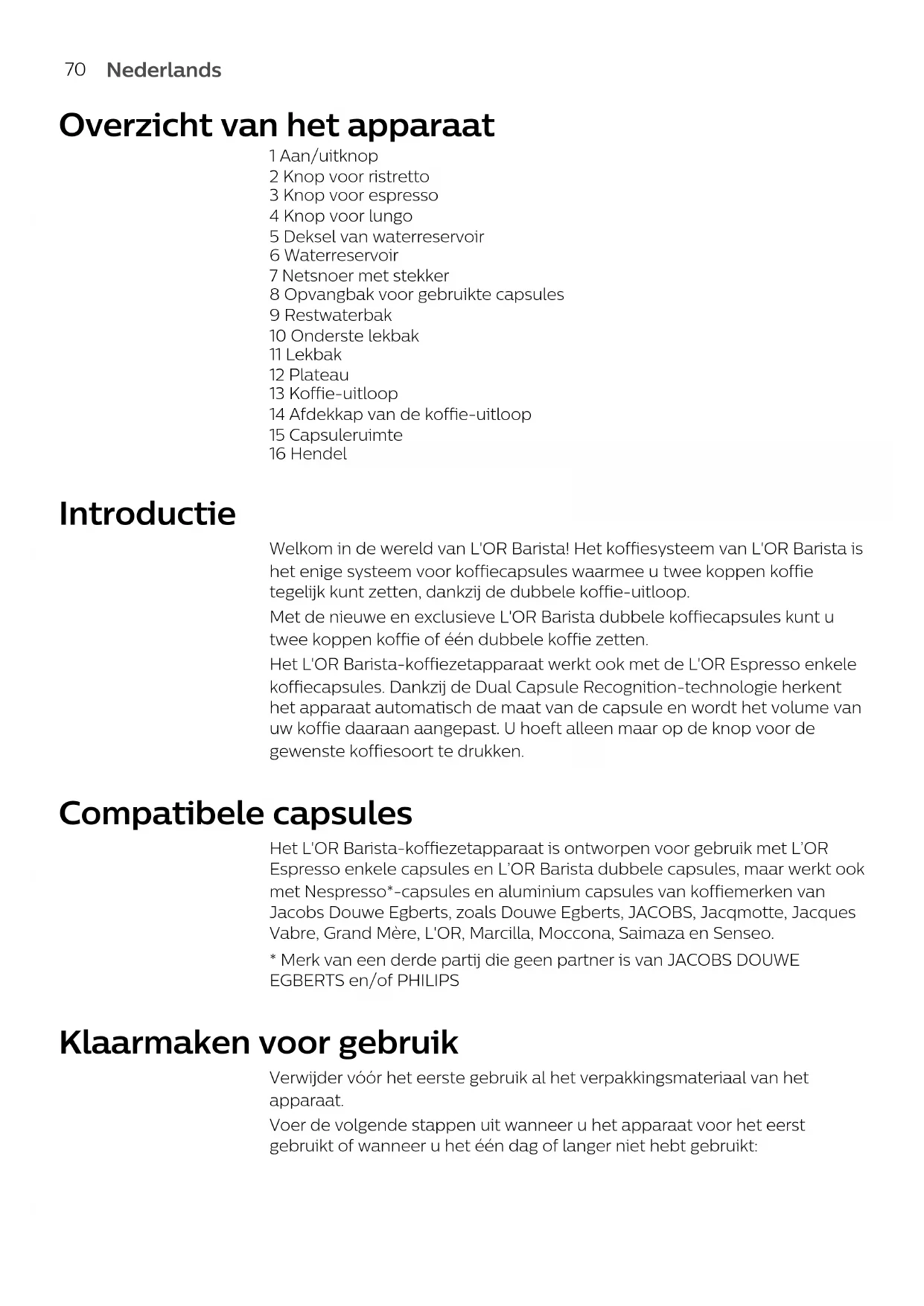 FrançaisNederlands Overzicht van het apparaat 1 Aan/uitknop 2 Knop voor ristretto 3 Knop voor espresso 4 Knop voor lungo 5 Deksel van waterreservoir 6 Waterreservoir 7 Netsnoer met stekker 8 Opvangbak voor gebruikte capsules 9 Restwaterbak 10 Onderste lekbak 11 Lekbak 12 Plateau 13 Koffie-uitloop 14 Afdekkap van de koffie-uitloop 15 Capsuleruimte 16 Hendel Introductie Welkom in de wereld van L'OR Barista! Het koffiesysteem van L'OR Barista is het enige systeem voor koffiecapsules waarmee u twee koppen koffie tegelijk kunt zetten, dankzij de dubbele koffie-uitloop. Met de nieuwe en exclusieve L'OR Barista dubbele koffiecapsules kunt u twee koppen koffie of één dubbele koffie zetten. Het L'OR Barista-koffiezetapparaat werkt ook met de L'OR Espresso enkele koffiecapsules. Dankzij de Dual Capsule Recognition-technologie herkent het apparaat automatisch de maat van de capsule en wordt het volume van uw koffie daaraan aangepast. U hoeft alleen maar op de knop voor de gewenste koffiesoort te drukken. Compatibele capsules Het L'OR Barista-koffiezetapparaat is ontworpen voor gebruik met L’OR Espresso enkele capsules en L’OR Barista dubbele capsules, maar werkt ook met Nespresso*-capsules en aluminium capsules van koffiemerken van Jacobs Douwe Egberts, zoals Douwe Egberts, JACOBS, Jacqmotte, Jacques Vabre, Grand Mère, L'OR, Marcilla, Moccona, Saimaza en Senseo.