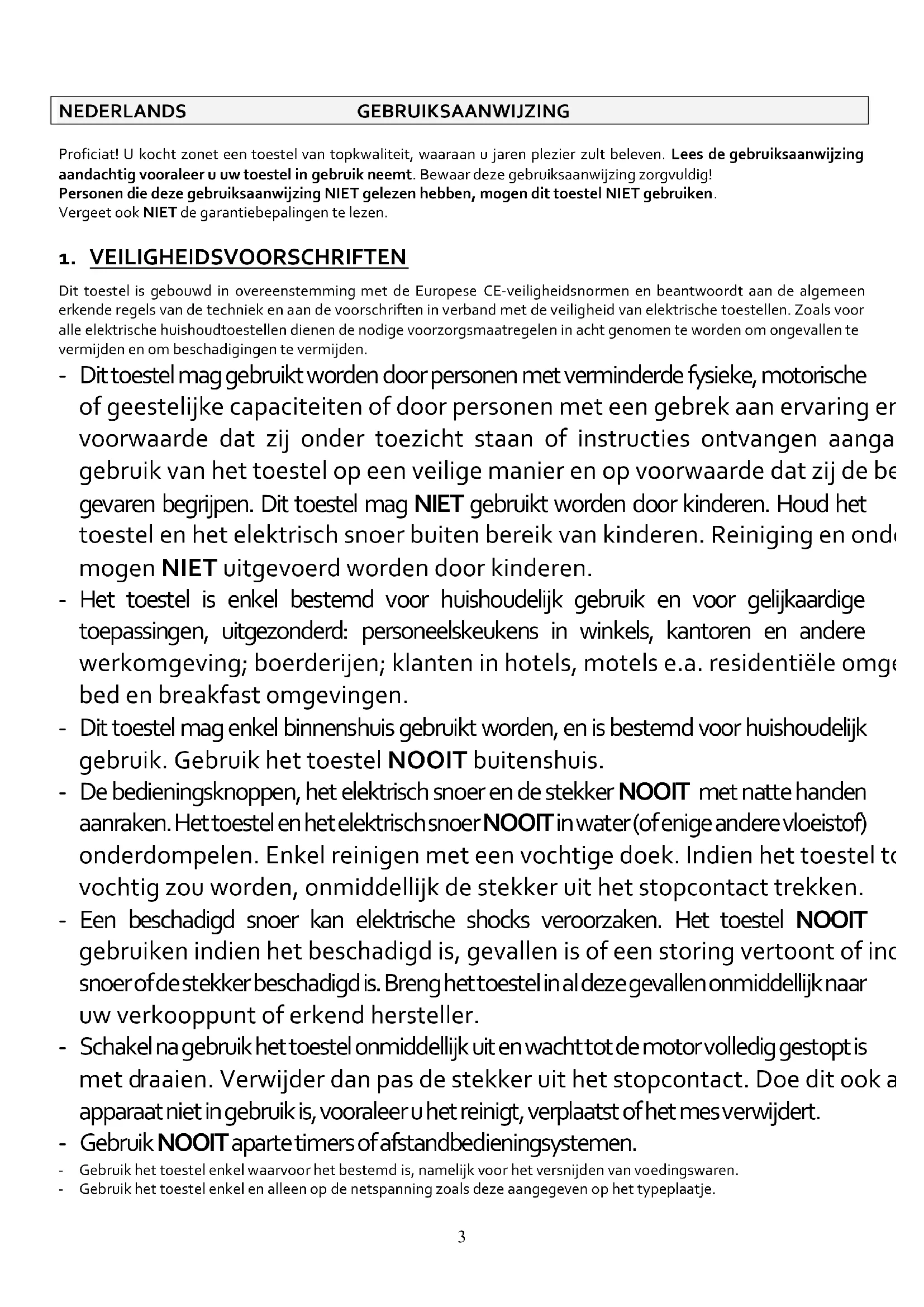 Dit toestel is gebouwd in overeenstemming met de Europese CE-veiligheidsnormen en beantwoordt aan de algemeen erkende regels van de techniek en aan de voorschriften in verband met de veiligheid van elektrische toestellen. Zoals voor alle elektrische huishoudtoestellen dienen de nodige voorzorgsmaatregelen in acht genomen te worden om ongevallen te vermijden en om beschadigingen te vermijden. - Dit toestel mag gebruikt worden door personen met verminderde fysieke, motorische of geestelijke capaciteiten of door personen met een gebrek aan ervaring en kennis, op voorwaarde dat zij onder toezicht staan of instructies ontvangen aangaande het gebruik van het toestel op een veilige manier en op voorwaarde dat zij de betreffende gevaren begrijpen. Dit toestel mag NIET gebruikt worden door kinderen. Houd het toestel en het elektrisch snoer buiten bereik van kinderen. Reiniging en onderhoud mogen NIET uitgevoerd worden door kinderen. - Het toestel is enkel bestemd voor huishoudelijk gebruik en voor gelijkaardige toepassingen, uitgezonderd: personeelskeukens in winkels, kantoren en andere werkomgeving; boerderijen; klanten in hotels, motels e.a. residentiële omgevingen; bed en breakfast omgevingen. - Dit toestel mag enkel binnenshuis gebruikt worden, en is bestemd voor huishoudelijk gebruik. Gebruik het toestel NOOIT buitenshuis. - De bedieningsknoppen, het elektrisch snoer en de stekker NOOIT met natte handen aanraken. Het toestel en het elektrisch snoer NOOIT in water (of enige andere vloeistof) onderdompelen. Enkel reinigen met een vochtige doek. Indien het toestel toch nat of vochtig zou worden, onmiddellijk de stekker uit het stopcontact trekken. - Een beschadigd snoer kan elektrische shocks veroorzaken. Het toestel NOOIT gebruiken indien het beschadigd is, gevallen is of een storing vertoont of indien het snoer of de stekker beschadigd is. Breng het toestel in al deze gevallen onmiddellijk naar uw verkooppunt of erkend hersteller. - Schakel na gebruik het toestel onmiddellijk uit en wacht tot de motor volledig gestopt is met draaien. Verwijder dan pas de stekker uit het stopcontact. Doe dit ook als het apparaat niet in gebruik is, vooraleer u het reinigt, verplaatst of het mes verwijdert. - Gebruik NOOIT aparte timers of afstandbedieningsystemen. - Gebruik het toestel enkel waarvoor het bestemd is, namelijk voor het versnijden van voedingswaren. - Gebruik het toestel enkel en alleen op de netspanning zoals deze aangegeven op het typeplaatje.4 - Opgelet: het mes is zeer scherp! - NOOIT met de handen aan het mes komen. - Laat het toestel NOOIT zonder toezicht als het aangesloten is op het net. - Gebruik NOOIT verlengsnoeren en rol het elektrisch snoer steeds volledig uit. - Gebruik het elektrisch snoer en het toestel NOOIT in de nabijheid van scherpe voorwerpen en warmtebronnen zoals fornuizen, ovens of verwarming. - Laat het elektrisch snoer NOOIT over de rand van de tafel of het aanrecht hangen. - Gebruik NOOIT accessoires van andere toestellen. - Het toestel beschikt over een veiligheidsstand (= positie 0). De aanslagplaat na gebruik steeds terug in de “0” positie plaatsen. Zo wordt de snijrand van het mes afgeschermd. - Overbelast het toestel niet of gebruik niet te veel kracht. - Indien het toestel niet werkt, dient u het terug te brengen naar uw verkooppunt voor nazicht. - Controleer voor uw veiligheid steeds of de allessnijder correct in elkaar werd gezet. - Het apparaat steeds op een vaste ondergrond plaatsen, zoals een keukentablet of tafel zodat het apparaat niet kan kantelen of schuiven. - NOOIT aan het elektrisch snoer zelf trekken om het uit te trekken. Gebruik de stekker. - NOOIT de behuizing van het toestel openen. NOOIT vreemde voorwerpen in het toestel steken. - NOOIT handen, haren, kleren en andere gebruiksvoorwerpen dicht bij het mes brengen om verwondingen en schade aan het toestel te voorkomen. - Gebruik geen agressieve schoonmaakmiddelen. - Herstellingen mogen alleen door een erkende herstellingsdienst uitgevoerd worden.