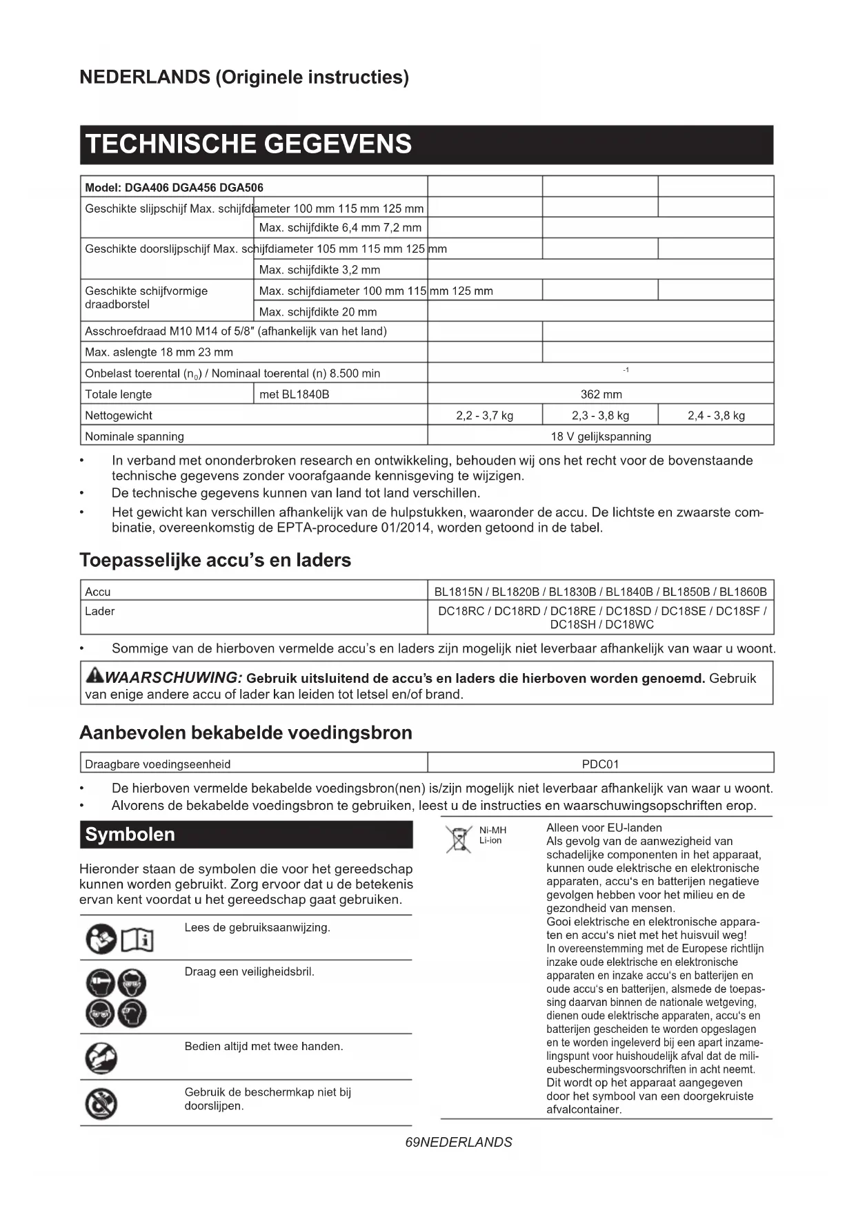 - Alvorens de bekabelde voedingsbron te gebruiken, leest u de instructies en waarschuwingsopschriften erop. Symbolen Hieronder staan de symbolen die voor het gereedschap kunnen worden gebruikt. Zorg ervoor dat u de betekenis ervan kent voordat u het gereedschap gaat gebruiken. Lees de gebruiksaanwijzing. Draag een veiligheidsbril. Bedien altijd met twee handen. Gebruik de beschermkap niet bij doorslijpen. Ni-MH Li-ion Alleen voor EU-landen Als gevolg van de aanwezigheid van schadelijke componenten in het apparaat, kunnen oude elektrische en elektronische apparaten, accu‘s en batterijen negatieve gevolgen hebben voor het milieu en de gezondheid van mensen. Gooi elektrische en elektronische appara- ten en accu‘s niet met het huisvuil weg! In overeenstemming met de Europese richtlijn inzake oude elektrische en elektronische apparaten en inzake accu‘s en batterijen en oude accu‘s en batterijen, alsmede de toepas- sing daarvan binnen de nationale wetgeving, dienen oude elektrische apparaten, accu‘s en batterijen gescheiden te worden opgeslagen en te worden ingeleverd bij een apart inzame- lingspunt voor huishoudelijk afval dat de mili- eubeschermingsvoorschriften in acht neemt. Dit wordt op het apparaat aangegeven door het symbool van een doorgekruiste afvalcontainer.70 NEDERLANDS Gebruiksdoeleinden Het gereedschap is bedoeld voor het slijpen, schuren, draadborstelen, gaten slijpen en doorslijpen van metaal en steen zonder gebruik van water. Geluidsniveau De typische, A-gewogen geluidsniveaus zijn gemeten volgens EN62841-2-3: Model Geluidsdrukniveau