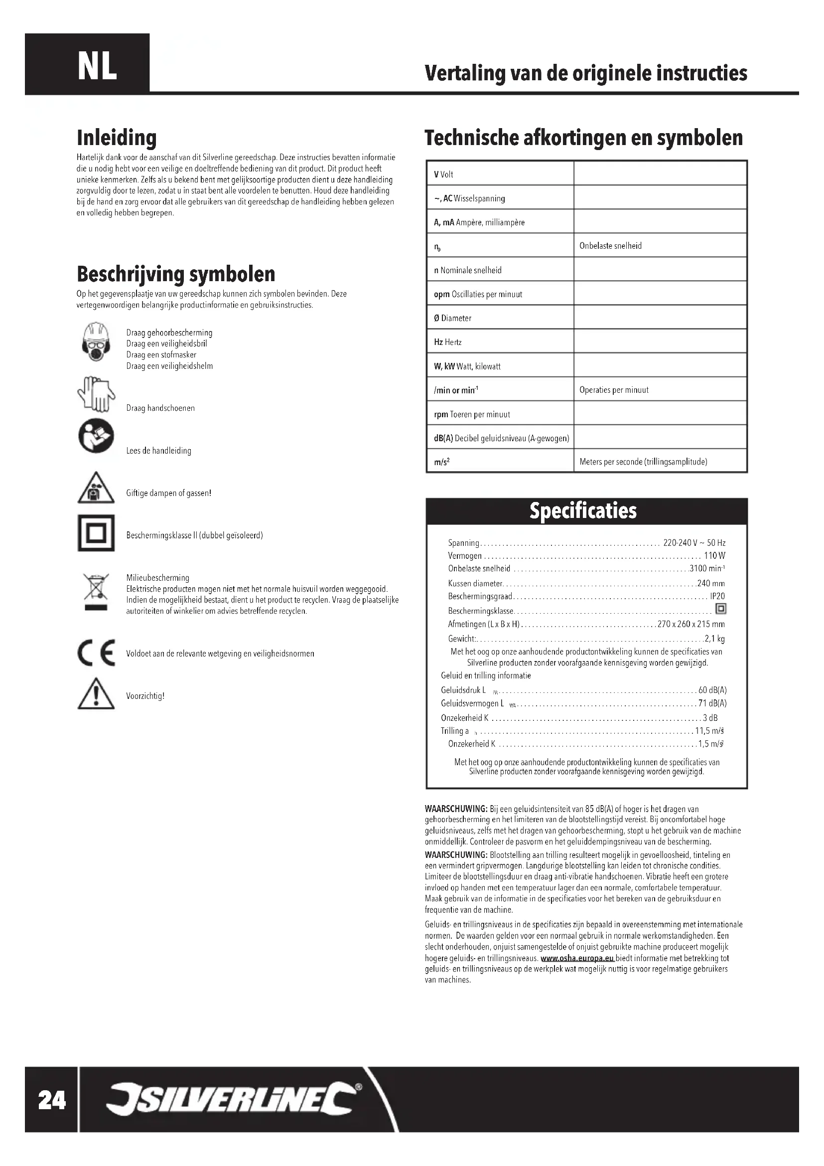 Met het oog op onze aanhoudende productontwikkeling kunnen de specicaties van Silverline producten zonder voorafgaande kennisgeving worden gewijzigd. Inleiding Hartelijk dank voor de aanschaf van dit Silverline gereedschap. Deze instructies bevatten informatie die u nodig hebt voor een veilige en doeltreffende bediening van dit product. Dit product heeft unieke kenmerken. Zelfs als u bekend bent met gelijksoortige producten dient u deze handleiding zorgvuldig door te lezen, zodat u in staat bent alle voordelen te benutten. Houd deze handleiding bij de hand en zorg ervoor dat alle gebruikers van dit gereedschap de handleiding hebben gelezen en volledig hebben begrepen. Specicaties V Volt~, AC WisselspanningA, mA Ampère, milliampère