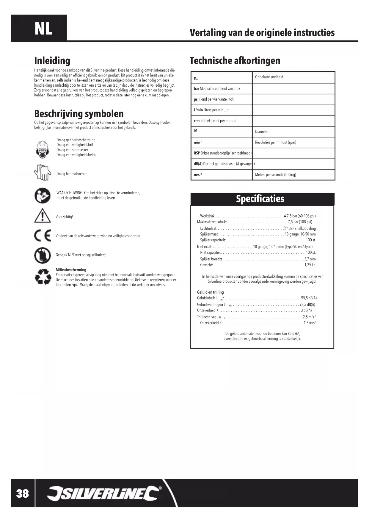 silverlinetools.com Veiligheidswaarschuwingen voor bevestigingsmiddelen WAARSCHUWING: Lees en begrijp de veiligheidsvoorschriften voordat u dit gereedschap installeert, bedient, repareert, onderhoudt, reinigt, toebehoren verwisselt of in de buurt ervan werkt. Als u dit niet doet, kan dit leiden tot ernstig letsel.Bewaar deze voorschriften voor toekomstig gebruik. WAARSCHUWING: Dit gereedschap is niet bedoeld voor gebruik door personen (met inbegrip van kinderen) met beperkte fysieke of mentale capaciteiten, of personen die niet voldoende ervaring of kennis bezitten, tenzij ze onder toezicht of indien ze instructies hebben gekregen met betrekking tot het gebruik van het gereedschap door of van een persoon die verantwoordelijk is voor hun veiligheid. Kinderen dienen onder toezicht blijven om er zeker van te zijn dat ze niet met het gereedschap spelen.• Demachinehoortalleendoorgekwaliceerde/getraindepersonengeïnstalleerd,aangepastofgebruikt worden.• Modiceerdemachineniet.Modicatiesverminderendeeffectiviteitvanveiligheidsmaatregelen en vergroten het risico voor de gebruiker.• Gooi de veiligheidsinstructies niet weg; geef ze aan de gebruiker.• Gebruik de machine niet wanneer deze beschadigd is.• Inspecteer het gereedschap regelmatig om te controleren of de volgens ISO 11148 vereiste bevoegd verklaringen en markeringen (gedetailleerd in de beschrijving van symbolen) leesbaar op het gereedschap zijn aangebracht. De gebruiker (en werkgever indien van toepassing) neemt wanneer nodig contact op met de fabrikant voor het verkrijgen van de juiste markering labels.• Lucht onder druk kan ernstige verwondingen veroorzaken.• Ontkoppel de machine van de luchttoevoer wanneer het niet in gebruik is.• Koppel het gereedschap altijd los van de luchttoevoer voordat u accessoires verwisselt, aanpassingen en/of reparaties uitvoert en wanneer u zich verplaatst van een werkgebied naar een ander gebied.• Houd uw vingers uit de buurt van de trekker wanneer u het apparaat niet bedient en wanneer u van een werkgebied naar de andere gaat.• Richt perslucht nooit op uzelf, anderen of dieren.• Zwepende slangen kunnen ernstig letsel veroorzaken. Check altijd op beschadigde en losse slangen en aansluitingen.• Houdt pneumatisch gereedschap nooit bij de luchtslang vast.• Bij gebruik van pneumatische gereedschap mag de maximale werkdruk niet worden overschreden.• Machinesenaccessoireshorenregelmatiggeïnspecteerdteworden.Nietgebruikenbijbeschadiging of overmatige slijtage.• Pneumatische gereedschap mag alleen worden aangedreven door perslucht bij de laagste druk die voor de taak vereist is, om lawaai en trillingen te beperken en slijtage te minimaliseren.• Gebruik nooit zuivere zuurstof of brandbare gassen om pneumatische gereedschap aan te drijven. Pneumatische gereedschap is niet ontworpen voor deze krachtbronnen en het gebruik ervan levert brand- en explosiegevaar op.• Wees u ervan bewust dat pneumatische gereedschap tijdens het gebruik koud kan worden, hetgeen van invloed kan zijn op de greep, de controle en de gevoeligheid voor verwondingen door trillingen.BELANGRIJK: Zelfs indien men dit gereedschap gebruikt zoals voorgeschreven, is het onmogelijk om alle residuele risicofactoren te elimineren. Indien u twijfels hebt met betrekking tot het veilige gebruik van dit gereedschap, gebruik het dan niet. Rondvliegende gevaren a) Het falen van het werkstuk, accessoires of de machine zelf kan resulteren in rondvliegende delen op hoge snelheid. b) Draag altijd stootbestendige oogbescherming tijdens het gebruik van dit gereedschap. De vereiste beschermingsgraad moet voor elk gebruik worden beoordeeld.c) Beoordeel het risico voor anderen bij het overwegen van het risico op projectielgevaar.d) Zorg ervoor dat het werkstuk goed vastgezet is. e) Het gereedschap moet worden losgekoppeld van de pneumatische lucht wanneer spijkers worden uitgeladen, aanpassingen worden gedaan, klemmen worden verwijderd of accessoires worden verwisseld. f) Zorg ervoor dat de bevestigingsmiddelen correct in het materiaal doordringen en niet kunnen worden afgebogen/afgeschoten in de richting van de bediener en/of omstanders. g) Wees voorzichtig wanneer u bevestigingsmiddelen in dun materiaal of aan de rand van het materiaal aanbrengt. De bevestigingsmiddelen kunnen dwars door het materiaal heen gaan of het materiaal missen en schade of letsel toebrengen aan personen in de buurt. h) Tijdens de werking kunnen brokstukken van het werkstuk en het bevestigingssysteem worden afgevoerd.
