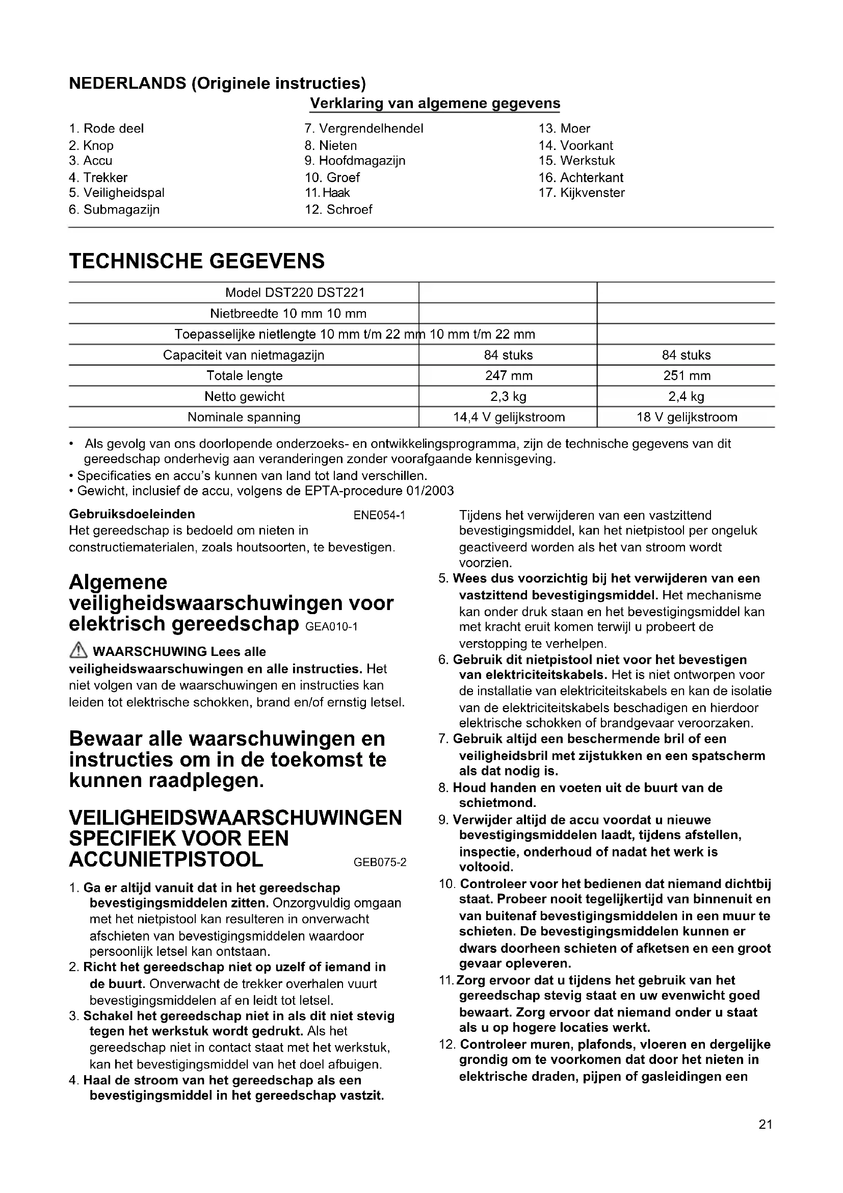 - Gewicht, inclusief de accu, volgens de EPTA-procedure 01/2003 Gebruiksdoeleinden ENE054-1 Het gereedschap is bedoeld om nieten in constructiematerialen, zoals houtsoorten, te bevestigen. Algemene veiligheidswaarschuwingen voor elektrisch gereedschap GEA010-1 WAARSCHUWING Lees alle veiligheidswaarschuwingen en alle instructies. Het niet volgen van de waarschuwingen en instructies kan leiden tot elektrische schokken, brand en/of ernstig letsel. Bewaar alle waarschuwingen en instructies om in de toekomst te kunnen raadplegen. VEILIGHEIDSWAARSCHUWINGEN