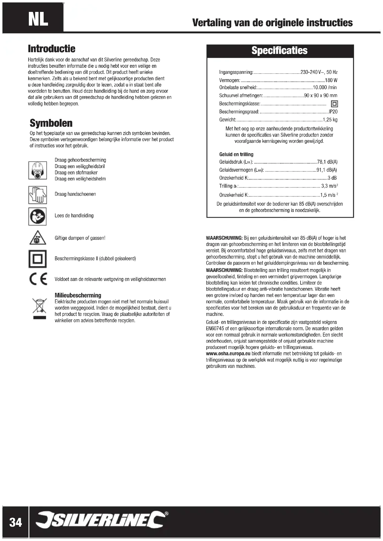 De geluidsintensiteit voor de bediener kan 85 dB(A) overschrijden en de gehoorbescherming is noodzakelijk. WAARSCHUWING: Bij een geluidsintensiteit van 85 dB(A) of hoger is het dragen van gehoorbescherming en het limiteren van de blootstellingstijd vereist. Bij oncomfortabel hoge geluidsniveaus, zelfs met het dragen van gehoorbescherming, stopt u het gebruik van de machine onmiddellijk. Controleer de pasvorm en het geluiddempingsniveau van de bescherming. WAARSCHUWING: Blootstelling aan trilling resulteert mogelijk in gevoelloosheid, tinteling en een vermindert gripvermogen. Langdurige blootstelling kan leiden tot chronische condities. Limiteer de blootstellingsduur en draag anti-vibratie handschoenen. Vibratie heeft een grotere invloed op handen met een temperatuur lager dan een normale, comfortabele temperatuur. Maak gebruik van de informatie in de specificaties voor het bereken van de gebruiksduur en frequentie van de machine. Geluid- en trillingsniveaus in de specificatie zijn vastgesteld volgens EN60745 of een gelijksoortige internationale norm. De waarden gelden voor een normaal gebruik in normale werkomstandigheden. Een slecht onderhouden, onjuist samengestelde of onjuist gebruikte machine produceert mogelijk hogere geluids- en trillingsniveaus. www.osha.europa.eu biedt informatie met betrekking tot geluids- en trillingsniveaus op de werkplek wat mogelijk nuttig is voor regelmatige gebruikers van machines. Vertaling van de originele instructies Introductie Hartelijk dank voor de aanschaf van dit Silverline gereedschap. Deze instructies bevatten informatie die u nodig hebt voor een veilige en doeltreffende bediening van dit product. Dit product heeft unieke kenmerken. Zelfs als u bekend bent met gelijksoortige producten dient u deze handleiding zorgvuldig door te lezen, zodat u in staat bent alle voordelen te benutten. Houd deze handleiding bij de hand en zorg ervoor dat alle gebruikers van dit gereedschap de handleiding hebben gelezen en volledig hebben begrepen. 261345_Z1MANPRO1.indd 34 21/04/2016 17:18www.silverlinetools.com