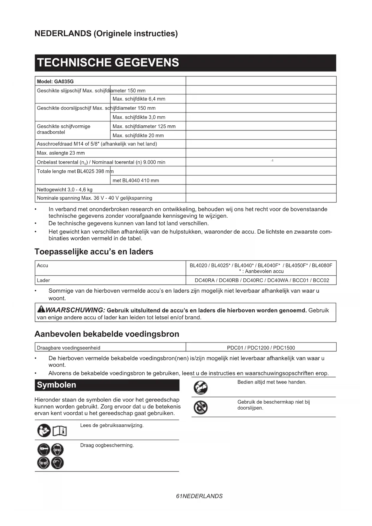 - Alvorens de bekabelde voedingsbron te gebruiken, leest u de instructies en waarschuwingsopschriften erop. Symbolen Hieronder staan de symbolen die voor het gereedschap kunnen worden gebruikt. Zorg ervoor dat u de betekenis ervan kent voordat u het gereedschap gaat gebruiken. Lees de gebruiksaanwijzing. Draag oogbescherming. Bedien altijd met twee handen. Gebruik de beschermkap niet bij doorslijpen.62 NEDERLANDS Ni-MH Li-ion Alleen voor EU-landen Als gevolg van de aanwezigheid van schadelijke componenten in het apparaat, kunnen oude elektrische en elektronische apparaten, accu‘s en batterijen negatieve gevolgen hebben voor het milieu en de gezondheid van mensen. Gooi elektrische en elektronische appara- ten en accu‘s niet met het huisvuil weg! In overeenstemming met de Europese richtlijn inzake oude elektrische en elek- tronische apparaten en inzake accu‘s en batterijen en oude accu‘s en batterijen, alsmede de toepassing daarvan binnen de nationale wetgeving, dienen oude elektrische apparaten, accu‘s en batterijen gescheiden te worden opgeslagen en te worden ingeleverd bij een apart inzame- lingspunt voor huishoudelijk afval dat de milieubeschermingsvoorschriften in acht neemt. Dit wordt op het apparaat aangegeven door het symbool van een doorgekruiste afvalcontainer. Gebruiksdoeleinden Het gereedschap is bedoeld voor het slijpen, schuren, draadborstelen, gaten slijpen en doorslijpen van metaal en steen zonder gebruik van water. Geluidsniveau De typische, A-gewogen geluidsniveaus zijn gemeten volgens EN62841-2-3: Model Geluidsdrukniveau (L