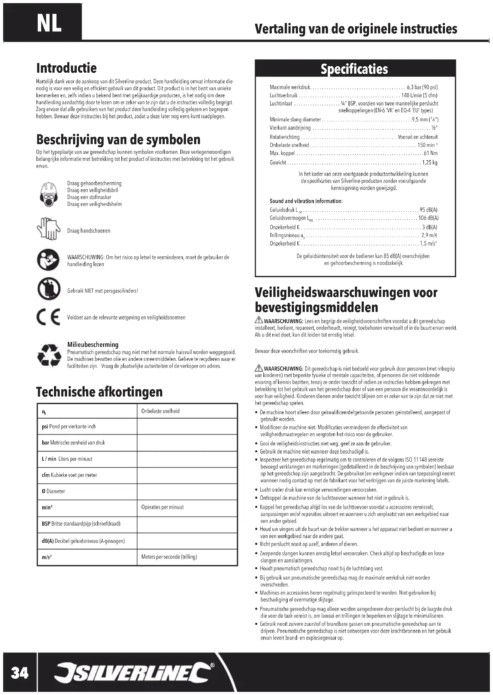 Veiligheidswaarschuwingen voor bevestigingsmiddelen WAARSCHUWING: Lees en begrijp de veiligheidsvoorschriften voordat u dit gereedschap installeert, bedient, repareert, onderhoudt, reinigt, toebehoren verwisselt of in de buurt ervan werkt. Als u dit niet doet, kan dit leiden tot ernstig letsel.Bewaar deze voorschriften voor toekomstig gebruik. WAARSCHUWING: Dit gereedschap is niet bedoeld voor gebruik door personen (met inbegrip van kinderen) met beperkte fysieke of mentale capaciteiten, of personen die niet voldoende ervaring of kennis bezitten, tenzij ze onder toezicht of indien ze instructies hebben gekregen met betrekking tot het gebruik van het gereedschap door of van een persoon die verantwoordelijk is voor hun veiligheid. Kinderen dienen onder toezicht blijven om er zeker van te zijn dat ze niet met het gereedschap spelen.• De machine hoort alleen door gekwaliceerde/getrainde personen geïnstalleerd, aangepast of gebruikt worden.• Modiceer de machine niet. Modicaties verminderen de effectiviteit van veiligheidsmaatregelen en vergroten het risico voor de gebruiker.• Gooi de veiligheidsinstructies niet weg; geef ze aan de gebruiker.• Gebruik de machine niet wanneer deze beschadigd is.• Inspecteer het gereedschap regelmatig om te controleren of de volgens ISO 11148 vereiste bevoegd verklaringen en markeringen (gedetailleerd in de beschrijving van symbolen) leesbaar op het gereedschap zijn aangebracht. De gebruiker (en werkgever indien van toepassing) neemt wanneer nodig contact op met de fabrikant voor het verkrijgen van de juiste markering labels.• Lucht onder druk kan ernstige verwondingen veroorzaken.• Ontkoppel de machine van de luchttoevoer wanneer het niet in gebruik is.• Koppel het gereedschap altijd los van de luchttoevoer voordat u accessoires verwisselt, aanpassingen en/of reparaties uitvoert en wanneer u zich verplaatst van een werkgebied naar een ander gebied.• Houd uw vingers uit de buurt van de trekker wanneer u het apparaat niet bedient en wanneer u van een werkgebied naar de andere gaat.• Richt perslucht nooit op uzelf, anderen of dieren.• Zwepende slangen kunnen ernstig letsel veroorzaken. Check altijd op beschadigde en losse slangen en aansluitingen.• Houdt pneumatisch gereedschap nooit bij de luchtslang vast.• Bij gebruik van pneumatische gereedschap mag de maximale werkdruk niet worden overschreden.• Machines en accessoires horen regelmatig geïnspecteerd te worden. Niet gebruiken bij beschadiging of overmatige slijtage.• Pneumatische gereedschap mag alleen worden aangedreven door perslucht bij de laagste druk die voor de taak vereist is, om lawaai en trillingen te beperken en slijtage te minimaliseren.• Gebruik nooit zuivere zuurstof of brandbare gassen om pneumatische gereedschap aan te drijven. Pneumatische gereedschap is niet ontworpen voor deze krachtbronnen en het gebruik ervan levert brand- en explosiegevaar op. Vertaling van de originele instructies Introductie Hartelijk dank voor de aankoop van dit Silverline-product. Deze handleiding omvat informatie die nodig is voor een veilig en efciënt gebruik van dit product. Dit product is in het bezit van unieke kenmerken en, zelfs indien u bekend bent met gelijkaardige producten, is het nodig om deze handleiding aandachtig door te lezen om er zeker van te zijn dat u de instructies volledig begrijpt. Zorg ervoor dat alle gebruikers van het product deze handleiding volledig gelezen en begrepen hebben. Bewaar deze instructies bij het product, zodat u deze later nog eens kunt raadplegen. Specicaties Beschrijving van de symbolen Op het typeplaatje van uw gereedschap kunnen symbolen voorkomen. Deze vertegenwoordigen belangrijke informatie met betrekking tot het product of instructies met betrekking tot het gebruik ervan.Draag gehoorbescherming Draag een veiligheidsbrilDraag een stofmaskerDraag een veiligheidshelmDraag handschoenenWAARSCHUWING: Om het risico op letsel te verminderen, moet de gebruiker de handleiding lezen Gebruik NIET met persgascilinders!Voldoet aan de relevante wetgeving en veiligheidsnormen Milieubescherming Pneumatisch gereedschap mag niet met het normale huisvuil worden weggegooid. De machines bevatten olie en andere smeermiddelen. Gelieve te recycleren waar er faciliteiten zijn. Vraag de plaatselijke autoriteiten of de verkoper om advies.