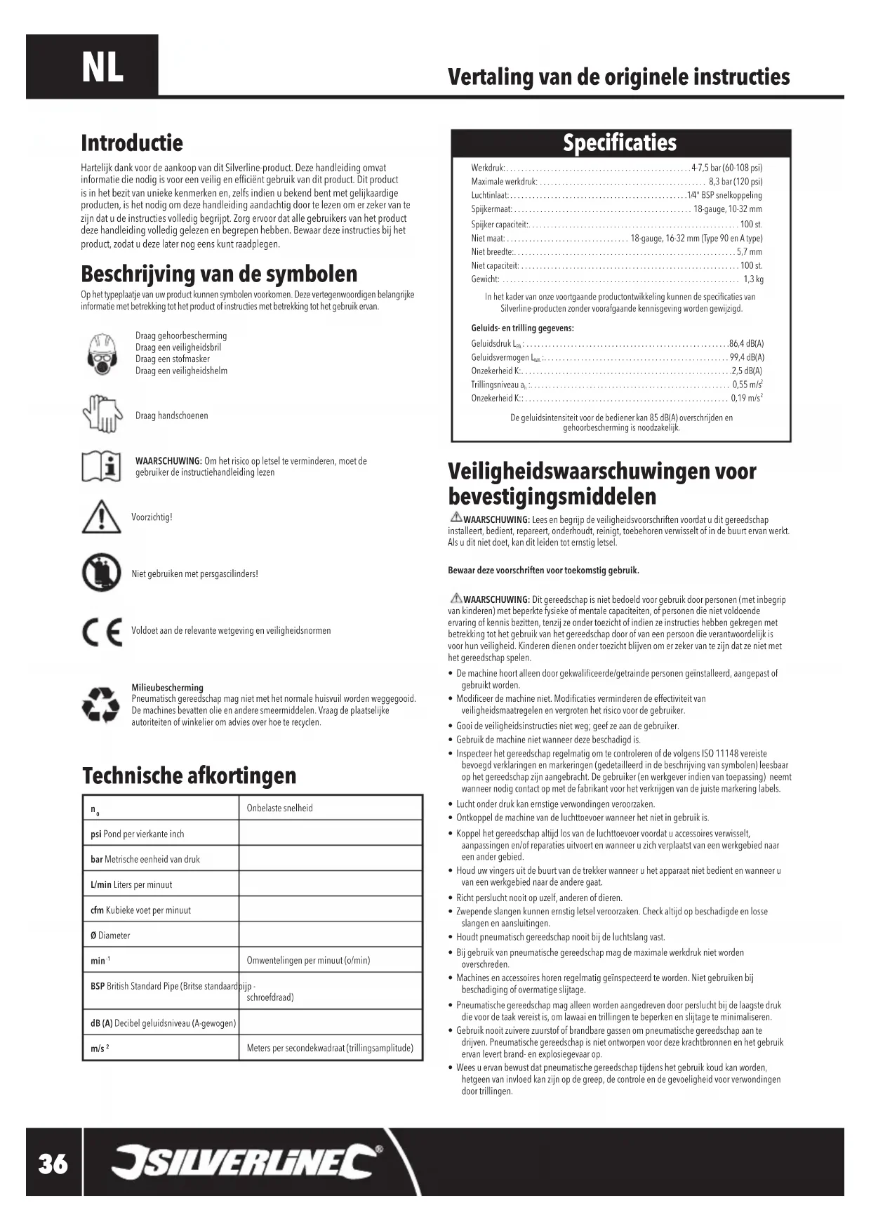 De geluidsintensiteit voor de bediener kan 85 dB(A) overschrijden en gehoorbescherming is noodzakelijk. Specicaties Veiligheidswaarschuwingen voor bevestigingsmiddelen WAARSCHUWING: Leesenbegrijpdeveiligheidsvoorschriftenvoordatuditgereedschap installeert, bedient, repareert, onderhoudt, reinigt, toebehoren verwisselt of in de buurt ervan werkt. Als u dit niet doet, kan dit leiden tot ernstig letsel.Bewaar deze voorschriften voor toekomstig gebruik. WAARSCHUWING: Dit gereedschap is niet bedoeld voor gebruik door personen (met inbegrip van kinderen) met beperkte fysieke of mentale capaciteiten, of personen die niet voldoende ervaring of kennis bezitten, tenzij ze onder toezicht of indien ze instructies hebben gekregen met betrekking tot het gebruik van het gereedschap door of van een persoon die verantwoordelijk is voor hun veiligheid. Kinderen dienen onder toezicht blijven om er zeker van te zijn dat ze niet met het gereedschap spelen.• Demachinehoortalleendoorgekwaliceerde/getraindepersonengeïnstalleerd,aangepastofgebruikt worden.• Modiceerdemachineniet.Modicatiesverminderendeeffectiviteitvanveiligheidsmaatregelen en vergroten het risico voor de gebruiker.• Gooi de veiligheidsinstructies niet weg; geef ze aan de gebruiker.• Gebruik de machine niet wanneer deze beschadigd is.• Inspecteer het gereedschap regelmatig om te controleren of de volgens ISO 11148 vereiste bevoegd verklaringen en markeringen (gedetailleerd in de beschrijving van symbolen) leesbaar op het gereedschap zijn aangebracht. De gebruiker (en werkgever indien van toepassing) neemt wanneer nodig contact op met de fabrikant voor het verkrijgen van de juiste markering labels.• Luchtonderdrukkanernstigeverwondingenveroorzaken.• Ontkoppel de machine van de luchttoevoer wanneer het niet in gebruik is.• Koppel het gereedschap altijd los van de luchttoevoer voordat u accessoires verwisselt, aanpassingen en/of reparaties uitvoert en wanneer u zich verplaatst van een werkgebied naar een ander gebied.• Houd uw vingers uit de buurt van de trekker wanneer u het apparaat niet bedient en wanneer u van een werkgebied naar de andere gaat.• Richt perslucht nooit op uzelf, anderen of dieren.• Zwepende slangen kunnen ernstig letsel veroorzaken. Check altijd op beschadigde en losse slangen en aansluitingen.• Houdt pneumatisch gereedschap nooit bij de luchtslang vast.• Bij gebruik van pneumatische gereedschap mag de maximale werkdruk niet worden overschreden.• Machinesenaccessoireshorenregelmatiggeïnspecteerdteworden.Nietgebruikenbijbeschadiging of overmatige slijtage.• Pneumatische gereedschap mag alleen worden aangedreven door perslucht bij de laagste druk die voor de taak vereist is, om lawaai en trillingen te beperken en slijtage te minimaliseren.• Gebruik nooit zuivere zuurstof of brandbare gassen om pneumatische gereedschap aan te drijven. Pneumatische gereedschap is niet ontworpen voor deze krachtbronnen en het gebruik ervan levert brand- en explosiegevaar op.• Wees u ervan bewust dat pneumatische gereedschap tijdens het gebruik koud kan worden, hetgeen van invloed kan zijn op de greep, de controle en de gevoeligheid voor verwondingen door trillingen. Introductie Hartelijk dank voor de aankoop van dit Silverline-product. Deze handleiding omvat informatie die nodig is voor een veilig en efficiënt gebruik van dit product. Dit product is in het bezit van unieke kenmerken en, zelfs indien u bekend bent met gelijkaardige producten, is het nodig om deze handleiding aandachtig door te lezen om er zeker van te zijn dat u de instructies volledig begrijpt. Zorg ervoor dat alle gebruikers van het product deze handleiding volledig gelezen en begrepen hebben. Bewaar deze instructies bij het product, zodat u deze later nog eens kunt raadplegen. Beschrijving van de symbolen Op het typeplaatje van uw product kunnen symbolen voorkomen. Deze vertegenwoordigen belangrijke informatie met betrekking tot het product of instructies met betrekking tot het gebruik ervan.Draag gehoorbescherming Draag een veiligheidsbril Draag een stofmasker Draag een veiligheidshelmDraag handschoenenWAARSCHUWING: Om het risico op letsel te verminderen, moet de gebruiker de instructiehandleiding lezen Voorzichtig! Niet gebruiken met persgascilinders!Voldoetaanderelevantewetgevingenveiligheidsnormen Milieubescherming Pneumatisch gereedschap mag niet met het normale huisvuil worden weggegooid. Demachinesbevattenolieenanderesmeermiddelen.Vraagdeplaatselijkeautoriteiten of winkelier om advies over hoe te recyclen. Technische afkortingen