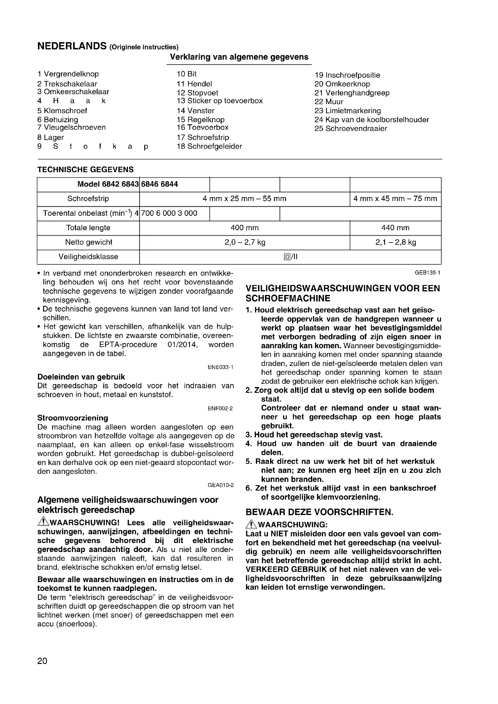 - Het gewicht kan verschillen, afhankelijk van de hulp- stukken. De lichtste en zwaarste combinatie, overeen- komstig de EPTA-procedure 01/2014, worden aangegeven in de tabel. ENE033-1 Doeleinden van gebruik Dit gereedschap is bedoeld voor het indraaien van schroeven in hout, metaal en kunststof. ENF002-2 Stroomvoorziening De machine mag alleen worden aangesloten op een stroombron van hetzelfde voltage als aangegeven op de naamplaat, en kan alleen op enkel-fase wisselstroom worden gebruikt. Het gereedschap is dubbel-geïsoleerd en kan derhalve ook op een niet-geaard stopcontact wor- den aangesloten. GEA010-2 Algemene veiligheidswaarschuwingen voor elektrisch gereedschap WAARSCHUWING! Lees alle veiligheidswaar- schuwingen, aanwijzingen, afbeeldingen en techni- sche gegevens behorend bij dit elektrische gereedschap aandachtig door. Als u niet alle onder- staande aanwijzingen naleeft, kan dat resulteren in brand, elektrische schokken en/of ernstig letsel. Bewaar alle waarschuwingen en instructies om in de toekomst te kunnen raadplegen. De term “elektrisch gereedschap” in de veiligheidsvoor- schriften duidt op gereedschappen die op stroom van het lichtnet werken (met snoer) of gereedschappen met een accu (snoerloos). GEB135-1