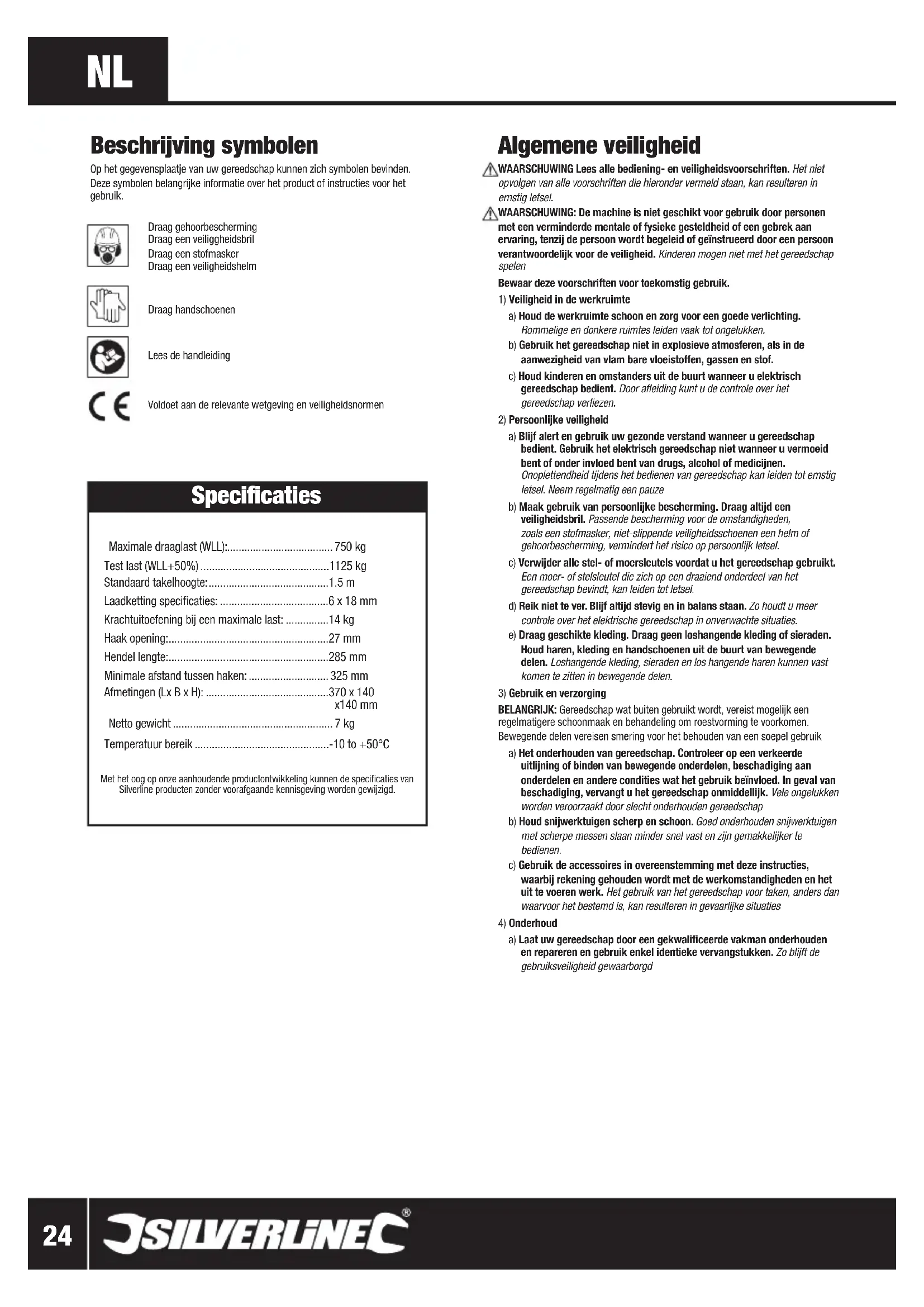 Voldoet aan de relevante wetgeving en veiligheidsnormen Specificaties Maximale draaglast (WLL):..................................... 750 kg Test last (WLL+50%) .............................................1125 kg Standaard takelhoogte: ..........................................1.5 m Laadketting specificaties: ......................................6 x 18 mm Krachtuitoefening bij een maximale last: ...............14 kg Haak opening: ........................................................27 mm Hendel lengte: ........................................................285 mm Minimale afstand tussen haken: ............................ 325 mm Afmetingen (Lx B x H): ...........................................370 x 140 x140 mm Netto gewicht ........................................................ 7 kg Temperatuur bereik ...............................................-10 to +50°C Met het oog op onze aanhoudende productontwikkeling kunnen de specificaties van Silverline producten zonder voorafgaande kennisgeving worden gewijzigd. Algemene veiligheid WAARSCHUWING Lees alle bediening- en veiligheidsvoorschriften. Het niet opvolgen van alle voorschriften die hieronder vermeld staan, kan resulteren in ernstig letsel.WAARSCHUWING: De machine is niet geschikt voor gebruik door personen met een verminderde mentale of fysieke gesteldheid of een gebrek aan ervaring, tenzij de persoon wordt begeleid of geïnstrueerd door een persoon verantwoordelijk voor de veiligheid. Kinderen mogen niet met het gereedschap spelenBewaar deze voorschriften voor toekomstig gebruik.1) Veiligheid in de werkruimtea) Houd de werkruimte schoon en zorg voor een goede verlichting. Rommelige en donkere ruimtes leiden vaak tot ongelukken.b) Gebruik het gereedschap niet in explosieve atmosferen, als in de aanwezigheid van vlam bare vloeistoffen, gassen en stof. c) Houd kinderen en omstanders uit de buurt wanneer u elektrisch gereedschap bedient. Door afleiding kunt u de controle over het gereedschap verliezen.2) Persoonlijke veiligheida) Blijf alert en gebruik uw gezonde verstand wanneer u gereedschap bedient. Gebruik het elektrisch gereedschap niet wanneer u vermoeid bent of onder invloed bent van drugs, alcohol of medicijnen. Onoplettendheid tijdens het bedienen van gereedschap kan leiden tot ernstig letsel. Neem regelmatig een pauzeb) Maak gebruik van persoonlijke bescherming. Draag altijd een veiligheidsbril. Passende bescherming voor de omstandigheden, zoals een stofmasker, niet-slippende veiligheidsschoenen een helm of gehoorbescherming, vermindert het risico op persoonlijk letsel.c) Verwijder alle stel- of moersleutels voordat u het gereedschap gebruikt. Een moer- of stelsleutel die zich op een draaiend onderdeel van het gereedschap bevindt, kan leiden tot letsel. d) Reik niet te ver. Blijf altijd stevig en in balans staan. Zo houdt u meer controle over het elektrische gereedschap in onverwachte situaties.e) Draag geschikte kleding. Draag geen loshangende kleding of sieraden. Houd haren, kleding en handschoenen uit de buurt van bewegende delen. Loshangende kleding, sieraden en los hangende haren kunnen vast komen te zitten in bewegende delen.3) Gebruik en verzorgingBELANGRIJK: Gereedschap wat buiten gebruikt wordt, vereist mogelijk een regelmatigere schoonmaak en behandeling om roestvorming te voorkomen. Bewegende delen vereisen smering voor het behouden van een soepel gebruika) Het onderhouden van gereedschap. Controleer op een verkeerde uitlijning of binden van bewegende onderdelen, beschadiging aan onderdelen en andere condities wat het gebruik beïnvloed. In geval van beschadiging, vervangt u het gereedschap onmiddellijk. Vele ongelukken worden veroorzaakt door slecht onderhouden gereedschap b) Houd snijwerktuigen scherp en schoon. Goed onderhouden snijwerktuigen met scherpe messen slaan minder snel vast en zijn gemakkelijker te bedienen.c) Gebruik de accessoires in overeenstemming met deze instructies, waarbij rekening gehouden wordt met de werkomstandigheden en het uit te voeren werk. Het gebruik van het gereedschap voor taken, anders dan waarvoor het bestemd is, kan resulteren in gevaarlijke situaties4) Onderhouda) Laat uw gereedschap door een gekwalificeerde vakman onderhouden en repareren en gebruik enkel identieke vervangstukken. Zo blijft de gebruiksveiligheid gewaarborgd 633809_Z1MANPRO1.indd 24 20/12/2013 11:09www.silverlinetools.com