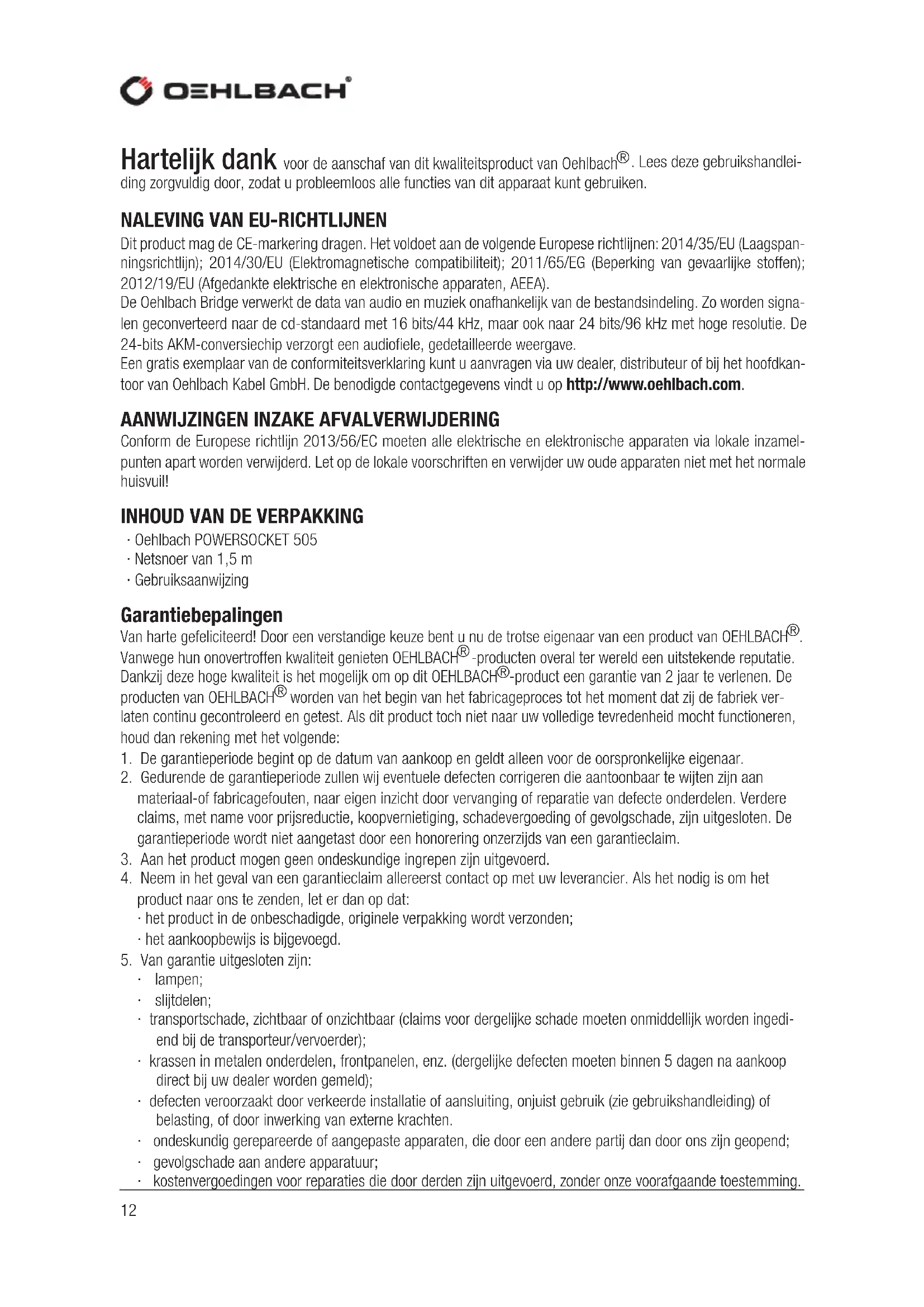 ∙ Oehlbach POWERSOCKET 505 ∙ Netsnoer van 1,5 m ∙ Gebruiksaanwijzing Garantiebepalingen Van harte gefeliciteerd! Door een verstandige keuze bent u nu de trotse eigenaar van een product van OEHLBACH