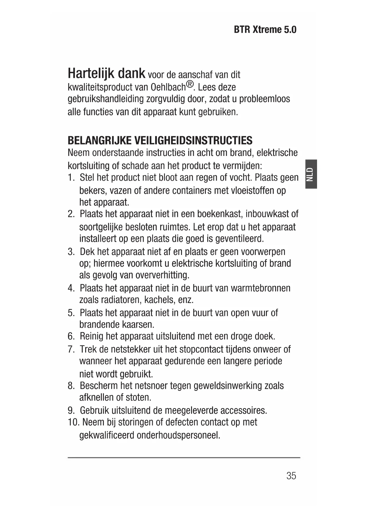 - Remboursement en cas de réparation par des tiers sans notre accord préalabl35 BTR Xtreme 5.0 NLD Hartelijk dank voor de aanschaf van dit kwaliteitsproduct van Oehlbach
