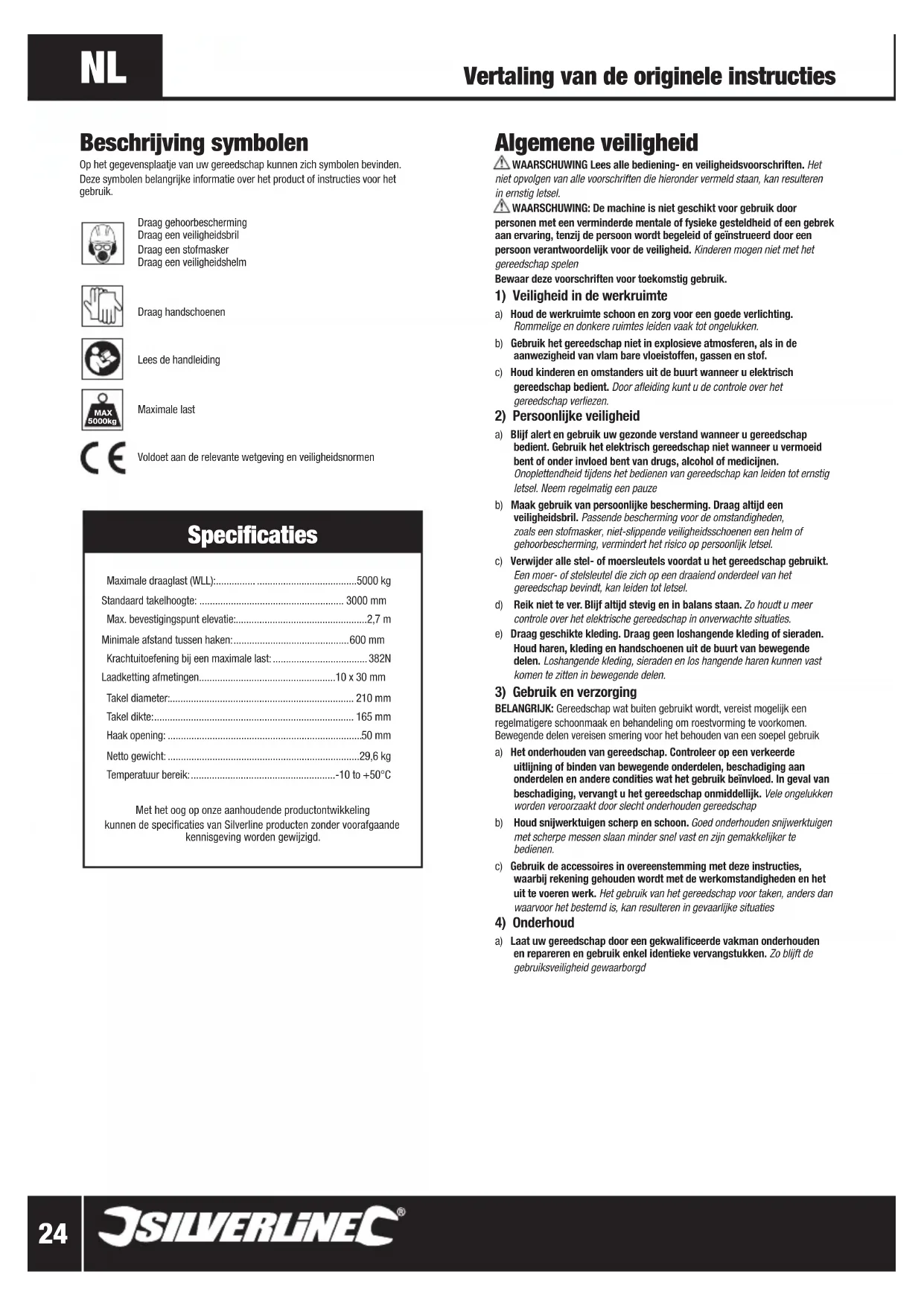 a) Laat uw gereedschap door een gekwalificeerde vakman onderhouden en repareren en gebruik enkel identieke vervangstukken. Zo blijft de gebruiksveiligheid gewaarborgd Beschrijving symbolen Op het gegevensplaatje van uw gereedschap kunnen zich symbolen bevinden. Deze symbolen belangrijke informatie over het product of instructies voor het gebruik. Draag gehoorbescherming Draag een veiligheidsbril Draag een stofmaskerDraag een veiligheidshelmDraag handschoenenLees de handleidingMaximale lastVoldoet aan de relevante wetgeving en veiligheidsnormen Specificaties Maximale draaglast (WLL):............... ......................................5000 kg Standaard takelhoogte: ....................................................... 3000 mm Max. bevestigingspunt elevatie: ..................................................2,7 m Minimale afstand tussen haken: ............................................ 600 mm Krachtuitoefening bij een maximale last: .................................... 382N Laadketting afmetingen ....................................................10 x 30 mm Takel diameter: ...................................................................... 210 mm Takel dikte: ............................................................................ 165 mm Haak opening: ..........................................................................50 mm Netto gewicht: .........................................................................29,6 kg Temperatuur bereik: .......................................................-10 to +50°C Met het oog op onze aanhoudende productontwikkeling kunnen de specificaties van Silverline producten zonder voorafgaande kennisgeving worden gewijzigd. Vertaling van de originele instructies MAX 5000kg 282517_Z1MANPRO1.indd 24 04/08/2015 14:58www.silverlinetools.com