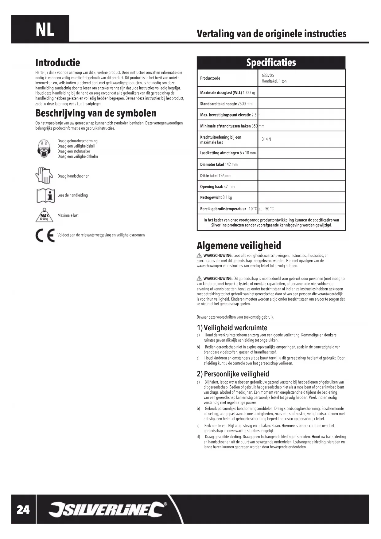 a) Blijfalert,letopwatudoetengebruikuwgezondverstandbijhetbedienenofgebruikenvanditgereedschap.Bedienofgebruikhetgereedschapnietalsumoebentofonderinvloedbentvandrugs,alcoholofmedicijnen.Eenmomentvanonoplettendheidtijdensdebedieningvaneengereedschapkanernstigpersoonlijkletseltotgevolghebben.Werkindiennodigverstandigmetregelmatigepauzes.b) Gebruikpersoonlijkebeschermingsmiddelen.Draagsteedsoogbescherming.Beschermendeuitrusting,aangepastaandeomstandigheden,zoalseenstofmasker,veiligheidsschoenenmetantislip,eenhelm,ofgehoorbeschermingbeperkthetrisicooppersoonlijkletsel.c) Reikniettever.Blijfaltijdstevigeninbalansstaan.Hiermeeisbeterecontroleoverhetgereedschapinonverwachtesituatiesmogelijk.d) Draaggeschiktekleding.Draaggeenloshangendekledingofsieraden.Houduwhaar,kledingenhandschoenenuitdebuurtvanbewegendeonderdelen.Loshangendekleding,sieradenenlangeharenkunnengegrepenwordendoorbewegendeonderdelen. Vertaling van de originele instructies Beschrijving van de symbolen Ophettypeplaatjevanuwgereedschapkunnenzichsymbolenbevinden.Dezevertegenwoordigenbelangrijkeproductinformatieengebruiksinstructies.Draaggehoorbescherming Draageenveiligheidsbril Draageenstofmasker DraageenveiligheidshelmDraaghandschoenenLees de handleidingMaximalelastVoldoetaanderelevantewetgevingenveiligheidsnormen Introductie HartelijkdankvoordeaankoopvanditSilverlineproduct.Dezeinstructiesomvatteninformatiedienodigisvooreenveiligenefciëntgebruikvanditproduct.Ditproductisinhetbezitvanuniekekenmerkenen,zelfsindienubekendbentmetgelijkaardigeproducten,ishetnodigomdezehandleidingaandachtigdoortelezenomerzekervantezijndatudeinstructiesvolledigbegrijpt.Houddezehandleidingbijdehandenzorgervoordatallegebruikersvanditgereedschapdehandleidinghebbengelezenenvolledighebbenbegrepen.Bewaardezeinstructiesbijhetproduct,zodat u deze later nog eens kunt raadplegen. MAX 1000kg Specicaties Productcode633705Handtakel,1tonMaximale draaglast (WLL) 1000 kgStandaard takelhoogte 2500 mmMax. bevestigingspunt elevatie 2,5mMinimale afstand tussen haken 350 mmKrachtuitoefening bij een maximale last314NLaadketting afmetingen 6x18mmDiameter takel 142 mmDikte takel 126 mmOpening haak 32 mmNettogewicht 8,1kgBereik gebruikstemperatuur -10°Ctot+50°CIn het kader van onze voortgaande productontwikkeling kunnen de specicaties van Silverline producten zonder voorafgaande kennisgeving worden gewijzigd. 633705_OwnerManual.indd 24633705_OwnerManual.indd 24 18/10/2023 08:1218/10/2023 08:12Handtakel