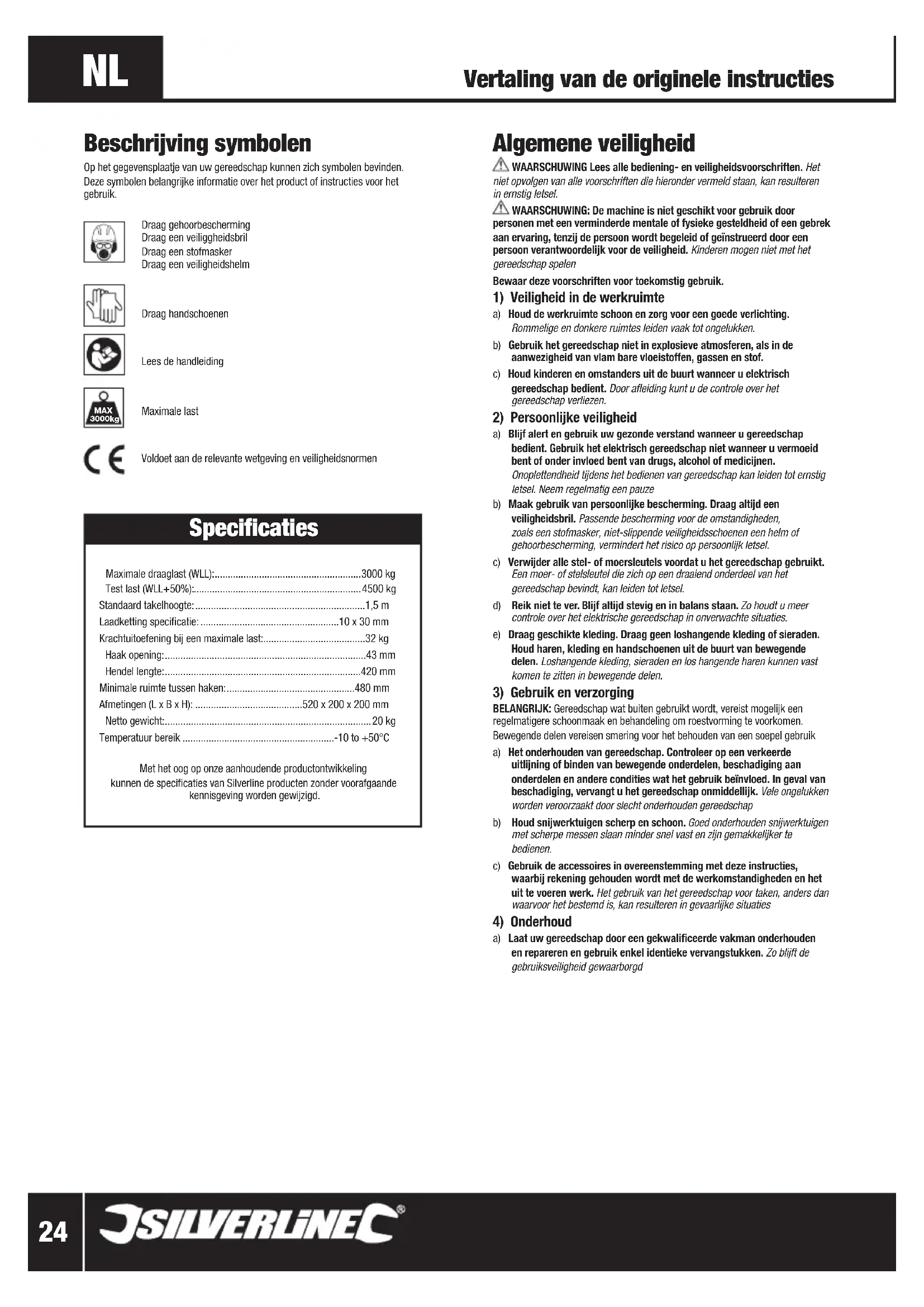 a) Laat uw gereedschap door een gekwalificeerde vakman onderhouden en repareren en gebruik enkel identieke vervangstukken. Zo blijft de gebruiksveiligheid gewaarborgd Vertaling van de originele instructies Beschrijving symbolen Op het gegevensplaatje van uw gereedschap kunnen zich symbolen bevinden. Deze symbolen belangrijke informatie over het product of instructies voor het gebruik. Draag gehoorbescherming Draag een veiliggheidsbril Draag een stofmaskerDraag een veiligheidshelmDraag handschoenenLees de handleidingMaximale lastVoldoet aan de relevante wetgeving en veiligheidsnormen Specificaties Maximale draaglast (WLL): ........................................................ 3000 kg Test last (WLL+50%): ................................................................4500 kg Standaard takelhoogte: .................................................................1,5 m Laadketting specificatie: .....................................................10 x 30 mm Krachtuitoefening bij een maximale last:.......................................32 kg Haak opening: .............................................................................43 mm Hendel lengte: ...........................................................................420 mm Minimale ruimte tussen haken: .................................................480 mm Afmetingen (L x B x H): .........................................520 x 200 x 200 mm Netto gewicht: ...............................................................................20 kg Temperatuur bereik ..........................................................-10 to +50°CMet het oog op onze aanhoudende productontwikkeling kunnen de specificaties van Silverline producten zonder voorafgaande kennisgeving worden gewijzigd. MAX 3000kg 245051_Z1MANPRO1.indd 24 24/07/2015 16:03www.silverlinetools.com