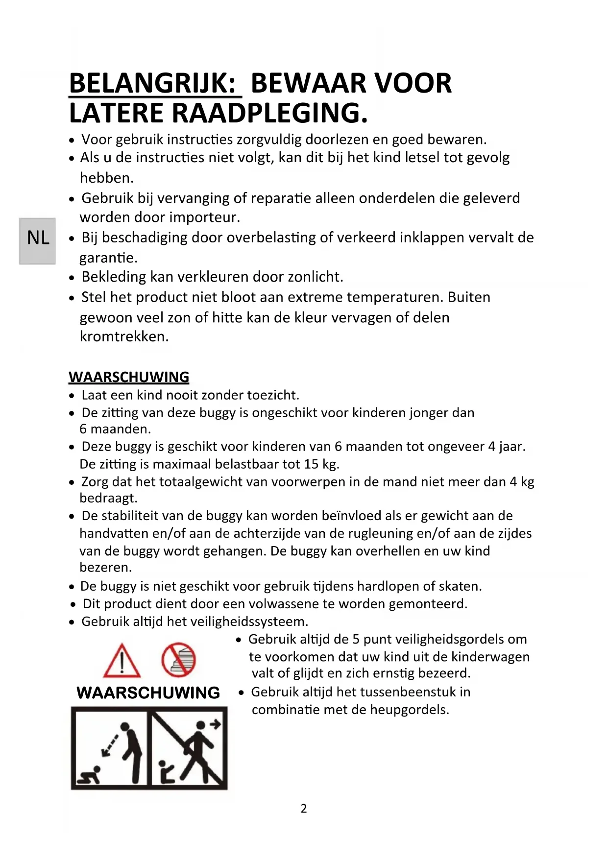 - Dit product dient door een volwassene te worden gemonteerd. • Gebruik aljd het veiligheidssysteem. • Gebruik aljd de 5 punt veiligheidsgordels om te voorkomen dat uw kind uit de kinderwagen valt of glijdt en zich ernsg bezeerd. • Gebruik aljd het tussenbeenstuk in combinae met de heupgordels. WAARSCHUWING NL3