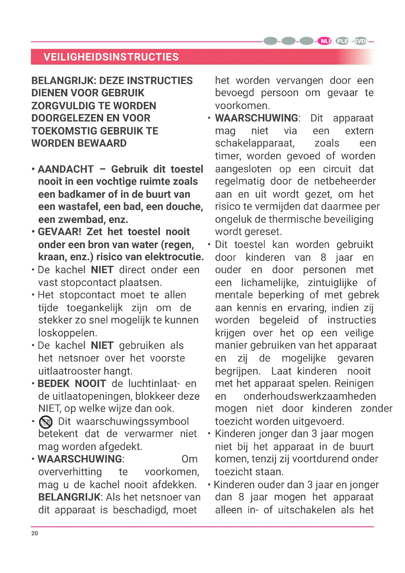- WAARSCHUWING: Om oververhitting te voorkomen, mag u de kachel nooit afdekken. BELANGRIJK: Als het netsnoer van dit apparaat is beschadigd, moet het worden vervangen door een bevoegd persoon om gevaar te voorkomen.