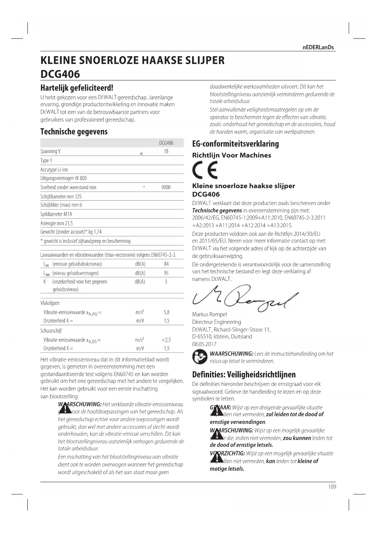 DEWALT verkaart dat deze producten zoals beschreiben onder Technische gegevens in overeenstemming zich met: 2006/42/EG, EN60745-1:2009+A11:2010, EN60745-2-3:2011 +A2:2013 +A11:2014 +A12:2014 +A13:2015.