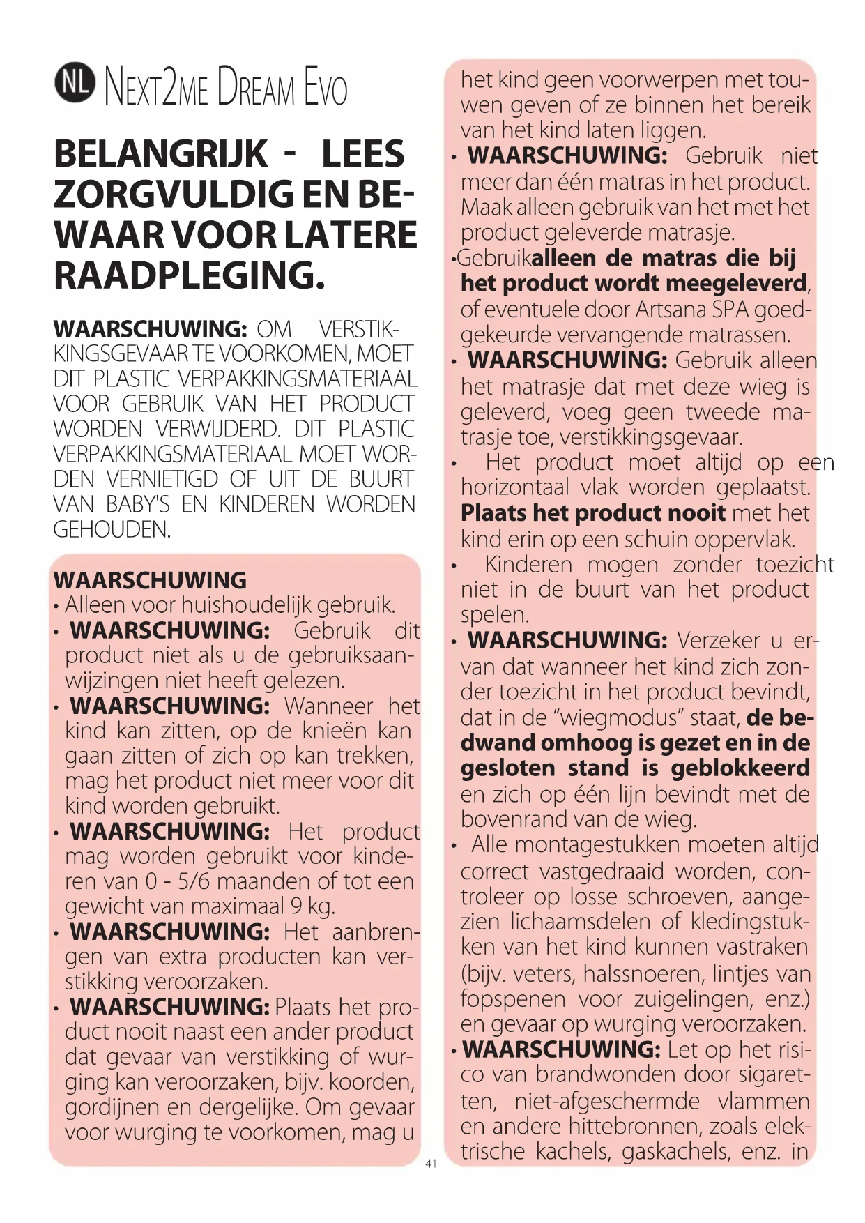 WAARSCHUWING: GEBRUIK het product NIET in de "wiegmodus" en/of in de modus "Co-Sleeping" als een onderdeel ontbreekt, beschadigd of kapot is. Neem indien nodig contact op met Artsana SPA voor verwangingsonderdelen of de gebruiksaanwijzing. VERVANG ontbekende, beschadigde of kapotte onderdelen uitsluitend door originele verwangingsonderdelen die door Artsana SPA� goedgekeurd.