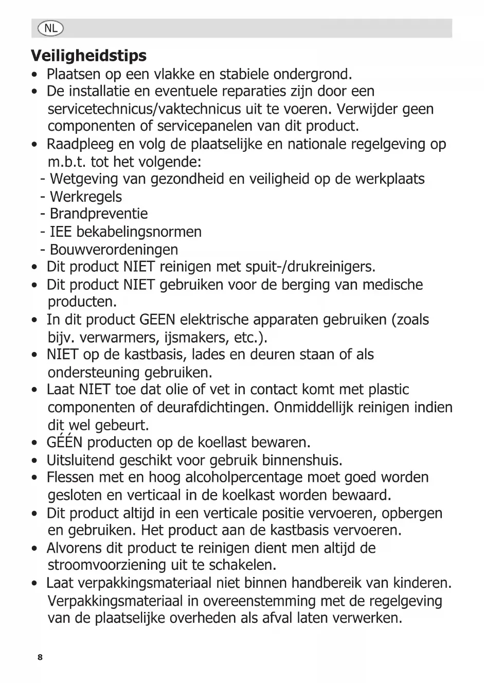 - In dit product GEEN elektrische apparaten gebruiken (zoals bijv. verwarmers, ijsmakers, etc.).