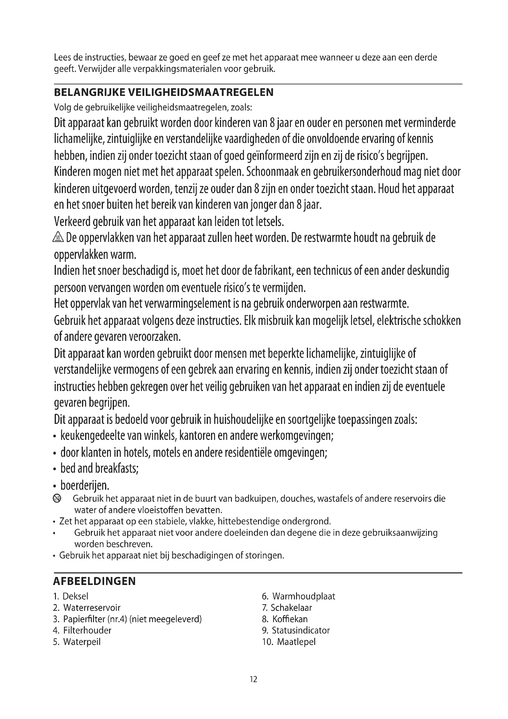 AE12 Lees de instructies, bewaar ze goed en geef ze met het apparaat mee wanneer u deze aan een derde geeft. Verwijder alle verpakkingsmaterialen voor gebruik. BELANGRIJKE VEILIGHEIDSMAATREGELEN Volg de gebruikelijke veiligheidsmaatregelen, zoals: Dit apparaat kan gebruikt worden door kinderen van 8 jaar en ouder en personen met verminderde lichamelijke, zintuiglijke en verstandelijke vaardigheden of die onvoldoende ervaring of kennis hebben, indien zij onder toezicht staan of goed geïnformeerd zijn en zij de risico’s begrijpen. Kinderen mogen niet met het apparaat spelen. Schoonmaak en gebruikersonderhoud mag niet door kinderen uitgevoerd worden, tenzij ze ouder dan 8 zijn en onder toezicht staan. Houd het apparaat en het snoer buiten het bereik van kinderen van jonger dan 8 jaar. Verkeerd gebruik van het apparaat kan leiden tot letsels. h De oppervlakken van het apparaat zullen heet worden. De restwarmte houdt na gebruik de oppervlakken warm. Indien het snoer beschadigd is, moet het door de fabrikant, een technicus of een ander deskundig persoon vervangen worden om eventuele risico’s te vermijden. Het oppervlak van het verwarmingselement is na gebruik onderworpen aan restwarmte. Gebruik het apparaat volgens deze instructies. Elk misbruik kan mogelijk letsel, elektrische schokken of andere gevaren veroorzaken. Dit apparaat kan worden gebruikt door mensen met beperkte lichamelijke, zintuiglijke of verstandelijke vermogens of een gebrek aan ervaring en kennis, indien zij onder toezicht staan of instructies hebben gekregen over het veilig gebruiken van het apparaat en indien zij de eventuele gevaren begrijpen. Dit apparaat is bedoeld voor gebruik in huishoudelijke en soortgelijke toepassingen zoals: