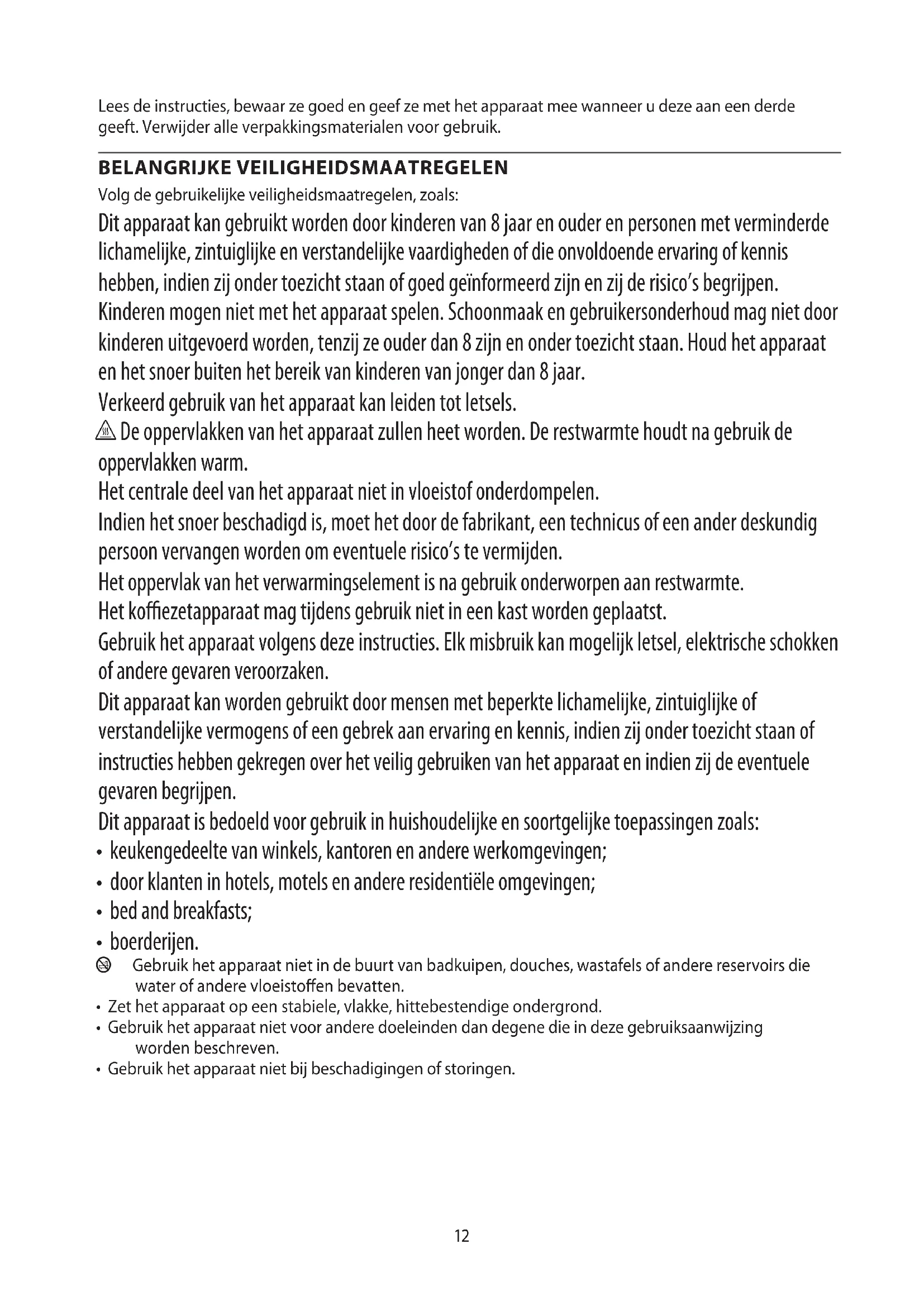 AE12 Lees de instructies, bewaar ze goed en geef ze met het apparaat mee wanneer u deze aan een derde geeft. Verwijder alle verpakkingsmaterialen voor gebruik. BELANGRIJKE VEILIGHEIDSMAATREGELEN Volg de gebruikelijke veiligheidsmaatregelen, zoals: Dit apparaat kan gebruikt worden door kinderen van 8 jaar en ouder en personen met verminderde lichamelijke, zintuiglijke en verstandelijke vaardigheden of die onvoldoende ervaring of kennis hebben, indien zij onder toezicht staan of goed geïnformeerd zijn en zij de risico’s begrijpen. Kinderen mogen niet met het apparaat spelen. Schoonmaak en gebruikersonderhoud mag niet door kinderen uitgevoerd worden, tenzij ze ouder dan 8 zijn en onder toezicht staan. Houd het apparaat en het snoer buiten het bereik van kinderen van jonger dan 8 jaar. Verkeerd gebruik van het apparaat kan leiden tot letsels. h De oppervlakken van het apparaat zullen heet worden. De restwarmte houdt na gebruik de oppervlakken warm. Het centrale deel van het apparaat niet in vloeistof onderdompelen. Indien het snoer beschadigd is, moet het door de fabrikant, een technicus of een ander deskundig persoon vervangen worden om eventuele risico’s te vermijden. Het oppervlak van het verwarmingselement is na gebruik onderworpen aan restwarmte. Het koezetapparaat mag tijdens gebruik niet in een kast worden geplaatst. Gebruik het apparaat volgens deze instructies. Elk misbruik kan mogelijk letsel, elektrische schokken of andere gevaren veroorzaken. Dit apparaat kan worden gebruikt door mensen met beperkte lichamelijke, zintuiglijke of verstandelijke vermogens of een gebrek aan ervaring en kennis, indien zij onder toezicht staan of instructies hebben gekregen over het veilig gebruiken van het apparaat en indien zij de eventuele gevaren begrijpen. Dit apparaat is bedoeld voor gebruik in huishoudelijke en soortgelijke toepassingen zoals: