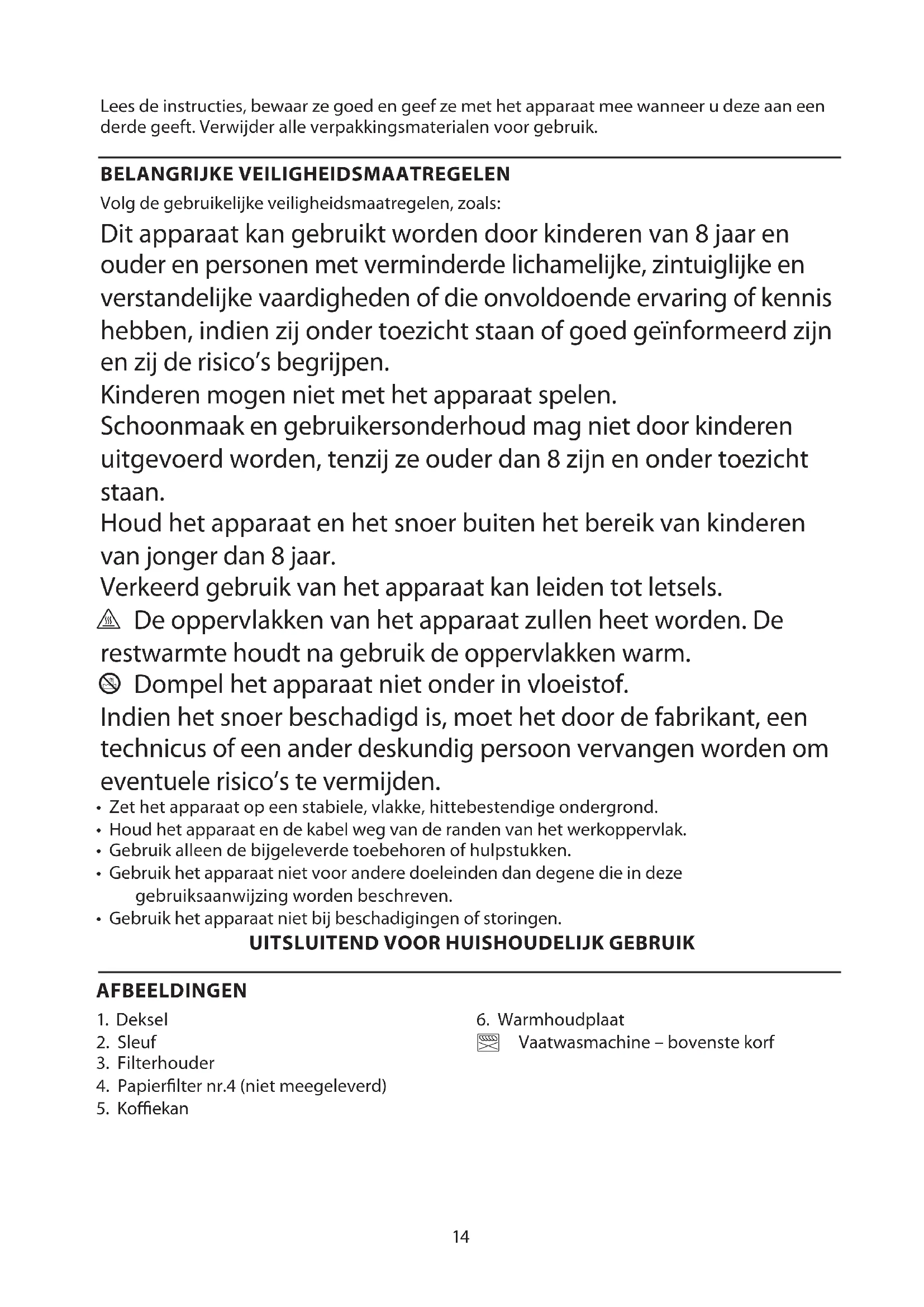 AE14 Lees de instructies, bewaar ze goed en geef ze met het apparaat mee wanneer u deze aan een derde geeft. Verwijder alle verpakkingsmaterialen voor gebruik. BELANGRIJKE VEILIGHEIDSMAATREGELEN Volg de gebruikelijke veiligheidsmaatregelen, zoals: Dit apparaat kan gebruikt worden door kinderen van 8 jaar en ouder en personen met verminderde lichamelijke, zintuiglijke en verstandelijke vaardigheden of die onvoldoende ervaring of kennis hebben, indien zij onder toezicht staan of goed geïnformeerd zijn en zij de risico’s begrijpen. Kinderen mogen niet met het apparaat spelen. Schoonmaak en gebruikersonderhoud mag niet door kinderen uitgevoerd worden, tenzij ze ouder dan 8 zijn en onder toezicht staan. Houd het apparaat en het snoer buiten het bereik van kinderen van jonger dan 8 jaar. Verkeerd gebruik van het apparaat kan leiden tot letsels. h De oppervlakken van het apparaat zullen heet worden. De restwarmte houdt na gebruik de oppervlakken warm. l Dompel het apparaat niet onder in vloeistof. Indien het snoer beschadigd is, moet het door de fabrikant, een technicus of een ander deskundig persoon vervangen worden om eventuele risico’s te vermijden.