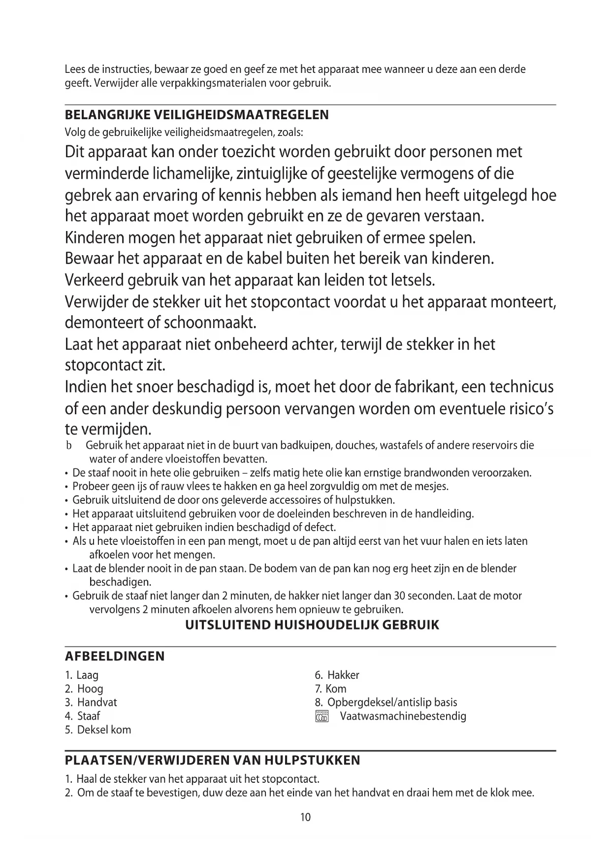AE10 Lees de instructies, bewaar ze goed en geef ze met het apparaat mee wanneer u deze aan een derde geeft. Verwijder alle verpakkingsmaterialen voor gebruik. BELANGRIJKE VEILIGHEIDSMAATREGELEN Volg de gebruikelijke veiligheidsmaatregelen, zoals: Dit apparaat kan onder toezicht worden gebruikt door personen met verminderde lichamelijke, zintuiglijke of geestelijke vermogens of die gebrek aan ervaring of kennis hebben als iemand hen heeft uitgelegd hoe het apparaat moet worden gebruikt en ze de gevaren verstaan. Kinderen mogen het apparaat niet gebruiken of ermee spelen. Bewaar het apparaat en de kabel buiten het bereik van kinderen. Verkeerd gebruik van het apparaat kan leiden tot letsels. Verwijder de stekker uit het stopcontact voordat u het apparaat monteert, demonteert of schoonmaakt. Laat het apparaat niet onbeheerd achter, terwijl de stekker in het stopcontact zit. Indien het snoer beschadigd is, moet het door de fabrikant, een technicus of een ander deskundig persoon vervangen worden om eventuele risico’s te vermijden. b Gebruik het apparaat niet in de buurt van badkuipen, douches, wastafels of andere reservoirs die water of andere vloeistoffen bevatten.