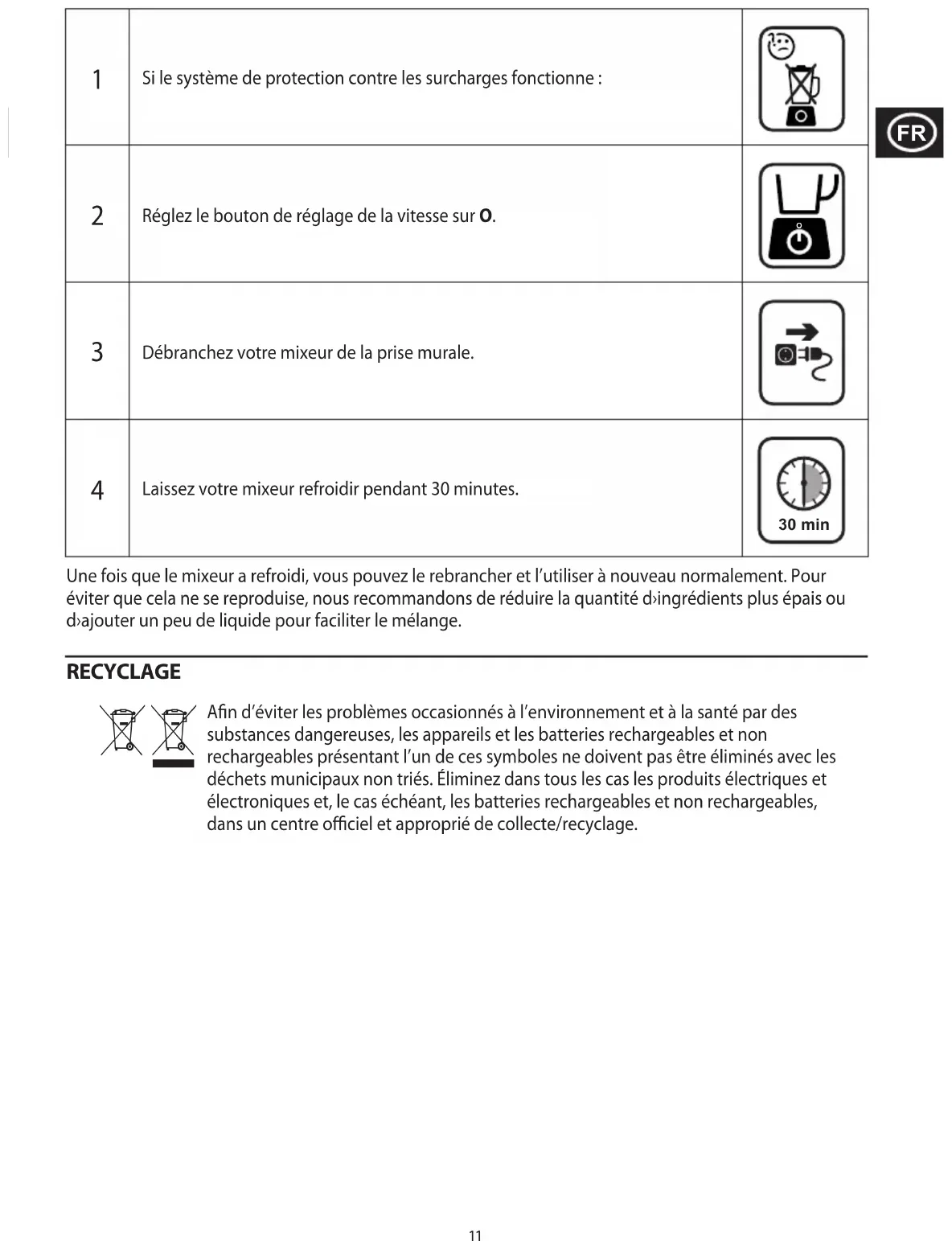 Laat uw blender 30 minuten afkoelen. 30 min Nadat uw blender is afgekoeld, kunt u deze opnieuw aansluiten en weer normaal gebruiken. Om te voorkomen dat dit opnieuw gebeurt, raden we aan om de hoeveelheid dikkere ingrediënten te verminderen of een beetje vloeistof toe te voegen om ze gemakkelijker te kunnen mengen. RECYCLING