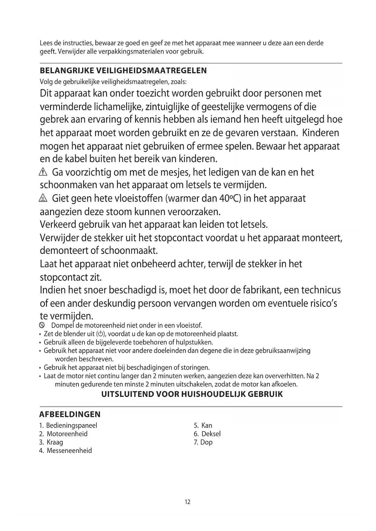 AE12 Lees de instructies, bewaar ze goed en geef ze met het apparaat mee wanneer u deze aan een derde geeft. Verwijder alle verpakkingsmaterialen voor gebruik. BELANGRIJKE VEILIGHEIDSMAATREGELEN Volg de gebruikelijke veiligheidsmaatregelen, zoals: Dit apparaat kan onder toezicht worden gebruikt door personen met verminderde lichamelijke, zintuiglijke of geestelijke vermogens of die gebrek aan ervaring of kennis hebben als iemand hen heeft uitgelegd hoe het apparaat moet worden gebruikt en ze de gevaren verstaan. Kinderen mogen het apparaat niet gebruiken of ermee spelen. Bewaar het apparaat en de kabel buiten het bereik van kinderen. c Ga voorzichtig om met de mesjes, het ledigen van de kan en het schoonmaken van het apparaat om letsels te vermijden. h Giet geen hete vloeistoen (warmer dan 40ºC) in het apparaat aangezien deze stoom kunnen veroorzaken. Verkeerd gebruik van het apparaat kan leiden tot letsels. Verwijder de stekker uit het stopcontact voordat u het apparaat monteert, demonteert of schoonmaakt. Laat het apparaat niet onbeheerd achter, terwijl de stekker in het stopcontact zit. Indien het snoer beschadigd is, moet het door de fabrikant, een technicus of een ander deskundig persoon vervangen worden om eventuele risico’s te vermijden. l Dompel de motoreenheid niet onder in een vloeistof.