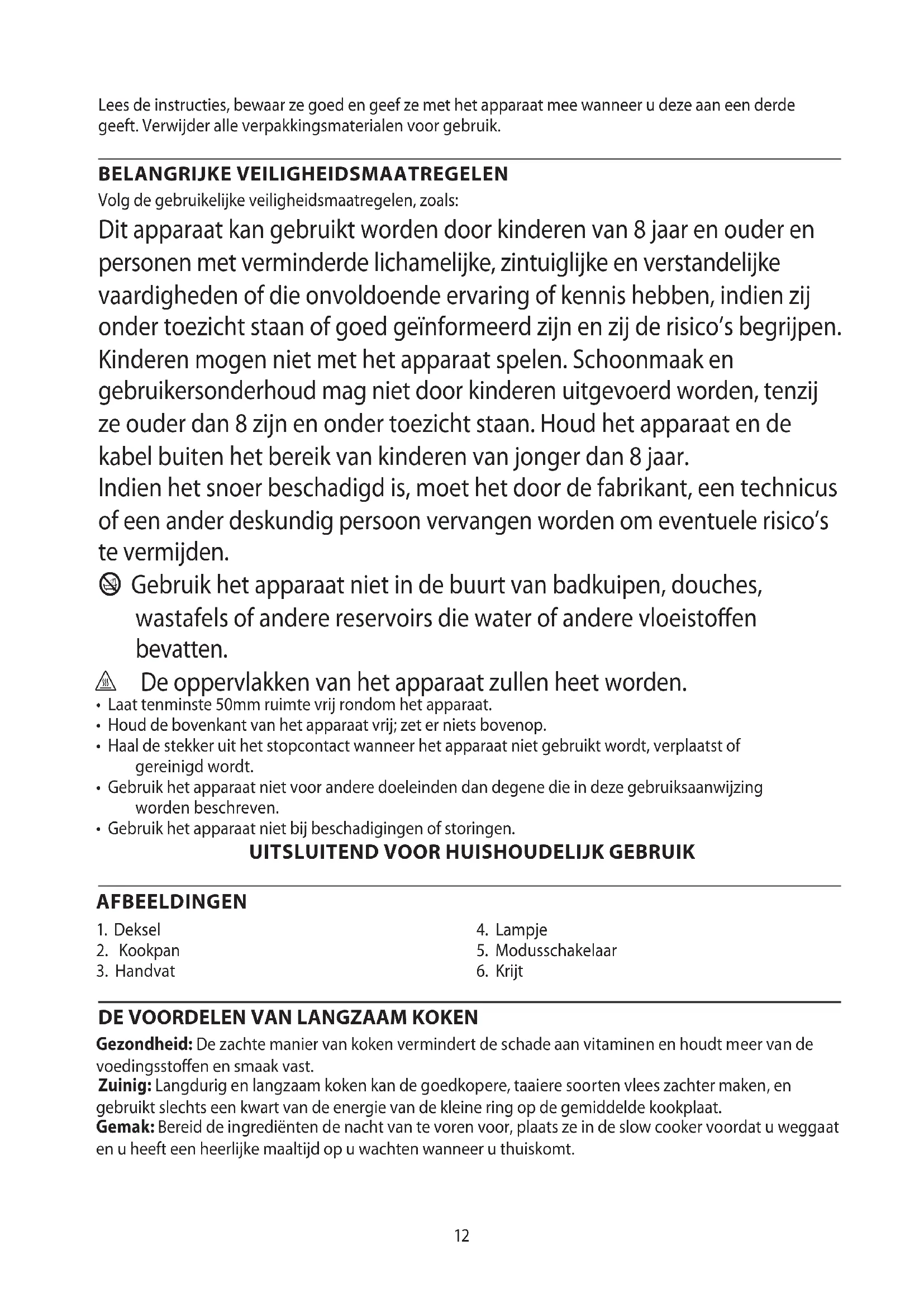 AE12 Lees de instructies, bewaar ze goed en geef ze met het apparaat mee wanneer u deze aan een derde geeft. Verwijder alle verpakkingsmaterialen voor gebruik. BELANGRIJKE VEILIGHEIDSMAATREGELEN Volg de gebruikelijke veiligheidsmaatregelen, zoals: Dit apparaat kan gebruikt worden door kinderen van 8 jaar en ouder en personen met verminderde lichamelijke, zintuiglijke en verstandelijke vaardigheden of die onvoldoende ervaring of kennis hebben, indien zij onder toezicht staan of goed geïnformeerd zijn en zij de risico’s begrijpen. Kinderen mogen niet met het apparaat spelen. Schoonmaak en gebruikersonderhoud mag niet door kinderen uitgevoerd worden, tenzij ze ouder dan 8 zijn en onder toezicht staan. Houd het apparaat en de kabel buiten het bereik van kinderen van jonger dan 8 jaar. Indien het snoer beschadigd is, moet het door de fabrikant, een technicus of een ander deskundig persoon vervangen worden om eventuele risico’s te vermijden. b Gebruik het apparaat niet in de buurt van badkuipen, douches, wastafels of andere reservoirs die water of andere vloeistoen bevatten. ¬ De oppervlakken van het apparaat zullen heet worden.