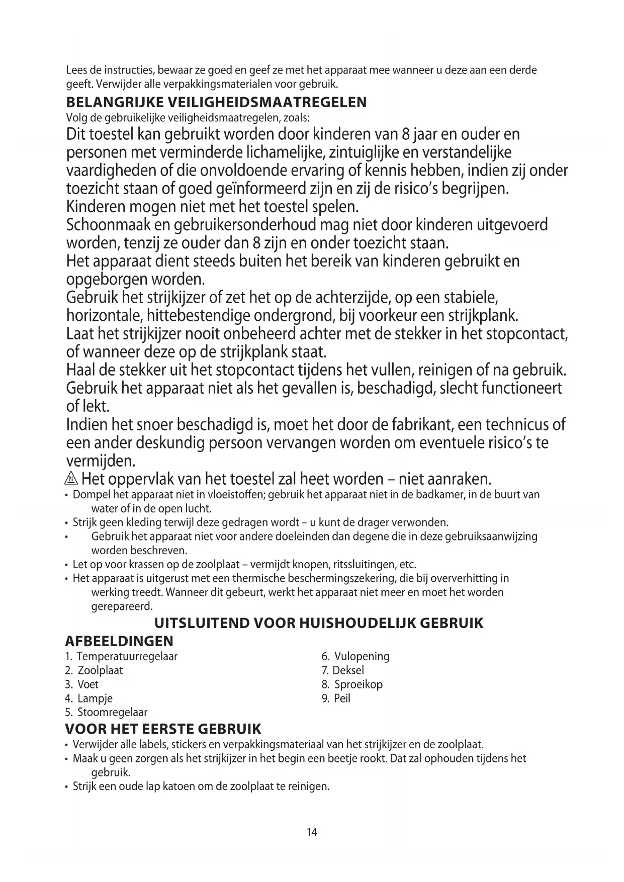 PROTECTION ENVIRONNEMENTALE Afin d’éviter des problèmes environnementaux ou de santé occasionnés par les substances dangereuses contenues dans les appareils électriques et électroniques, les appareils présentant ce symbole ne peuvent pas être éliminés avec les déchets ménagers, mais doivent faire l’objet d’une récupération sélective en vue de leur réutilisation ou recyclage.14 Lees de instructies, bewaar ze goed en geef ze met het apparaat mee wanneer u deze aan een derde geeft. Verwijder alle verpakkingsmaterialen voor gebruik. BELANGRIJKE VEILIGHEIDSMAATREGELEN Volg de gebruikelijke veiligheidsmaatregelen, zoals: Dit toestel kan gebruikt worden door kinderen van 8 jaar en ouder en personen met verminderde lichamelijke, zintuiglijke en verstandelijke vaardigheden of die onvoldoende ervaring of kennis hebben, indien zij onder toezicht staan of goed geïnformeerd zijn en zij de risico’s begrijpen. Kinderen mogen niet met het toestel spelen. Schoonmaak en gebruikersonderhoud mag niet door kinderen uitgevoerd worden, tenzij ze ouder dan 8 zijn en onder toezicht staan. Het apparaat dient steeds buiten het bereik van kinderen gebruikt en opgeborgen worden. Gebruik het strijkijzer of zet het op de achterzijde, op een stabiele, horizontale, hittebestendige ondergrond, bij voorkeur een strijkplank. Laat het strijkijzer nooit onbeheerd achter met de stekker in het stopcontact, of wanneer deze op de strijkplank staat. Haal de stekker uit het stopcontact tijdens het vullen, reinigen of na gebruik. Gebruik het apparaat niet als het gevallen is, beschadigd, slecht functioneert of lekt. Indien het snoer beschadigd is, moet het door de fabrikant, een technicus of een ander deskundig persoon vervangen worden om eventuele risico’s te vermijden. h Het oppervlak van het toestel zal heet worden – niet aanraken.