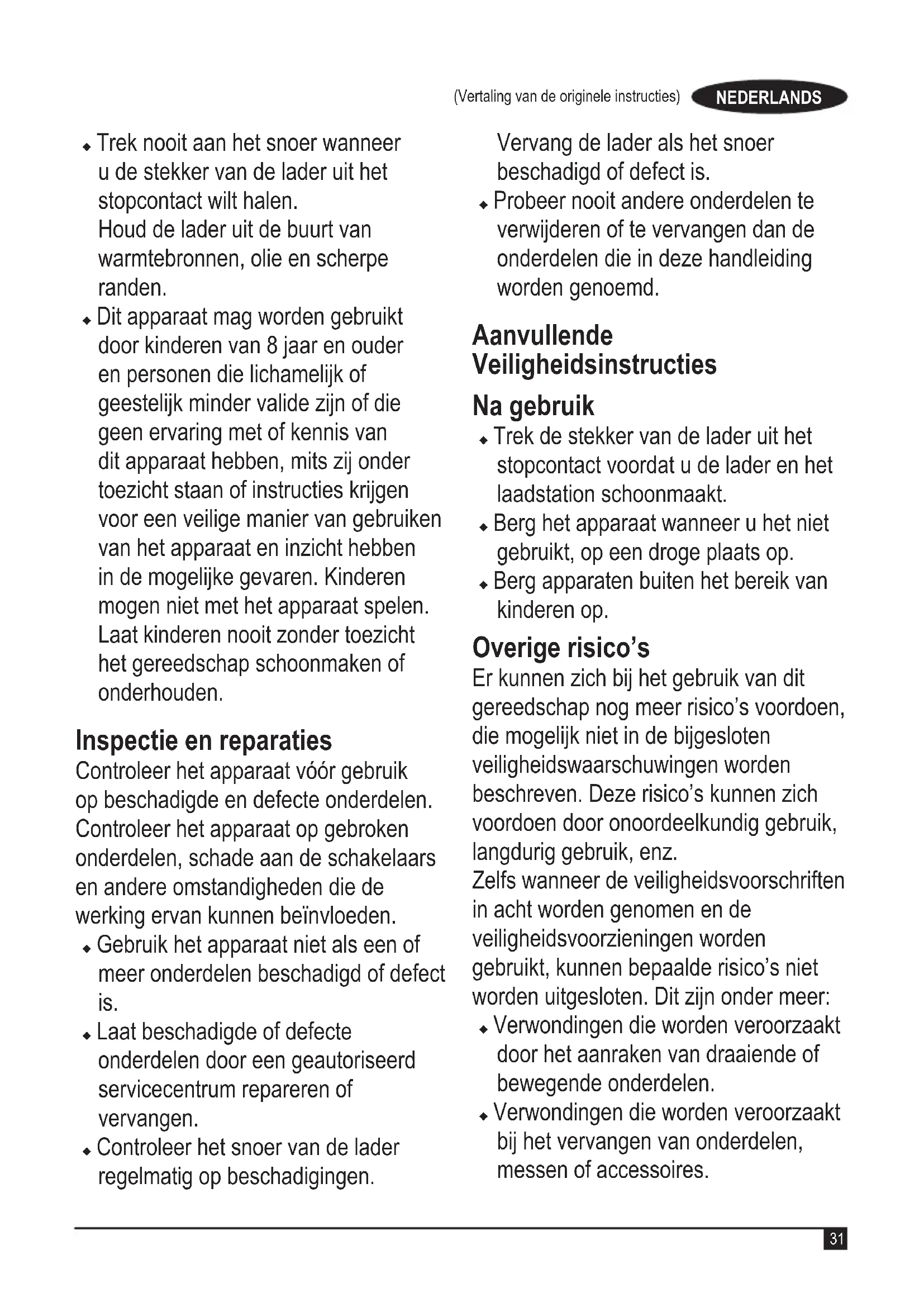 Waarschuwing! Lees alle veiligheidswaarschuwingen en alle instructies. Wanneer de volgende waarschuwingen en voorschriften niet in acht worden genomen, kan dit een elektrische schok, brand of ernstig letsel tot gevolg hebben. u Het bedoeld gebruik wordt beschreven in deze handleiding. Het gebruik van accessoires of hulpstukken of de uitvoering van handelingen anders dan in deze gebruikershandleiding worden aanbevolen, kan een risico van persoonlijk letsel geven. u Bewaar deze handleiding zodat u deze nog eens kunt raadplegen. Het apparaat gebruiken u Gebruik het apparaat niet voor het opzuigen van vloeistoffen of materialen die vlam kunnen vatten. u Gebruik het apparaat niet zonder dat stofzak en/of lters zijn geplaatst. u Gebruik het apparaat niet in de buurt van water. u Dompel het apparaat niet onder in water.31 (Vertaling van de originele instructies) NEDERLANDS u Trek nooit aan het snoer wanneer u de stekker van de lader uit het stopcontact wilt halen. Houd de lader uit de buurt van warmtebronnen, olie en scherpe randen. u Dit apparaat mag worden gebruikt door kinderen van 8 jaar en ouder en personen die lichamelijk of geestelijk minder valide zijn of die geen ervaring met of kennis van dit apparaat hebben, mits zij onder toezicht staan of instructies krijgen voor een veilige manier van gebruiken van het apparaat en inzicht hebben in de mogelijke gevaren. Kinderen mogen niet met het apparaat spelen. Laat kinderen nooit zonder toezicht het gereedschap schoonmaken of onderhouden. Inspectie en reparaties Controleer het apparaat vóór gebruik op beschadigde en defecte onderdelen. Controleer het apparaat op gebroken onderdelen, schade aan de schakelaars en andere omstandigheden die de werking ervan kunnen beïnvloeden. u Gebruik het apparaat niet als een of meer onderdelen beschadigd of defect is. u Laat beschadigde of defecte onderdelen door een geautoriseerd servicecentrum repareren of vervangen. u Controleer het snoer van de lader regelmatig op beschadigingen. Vervang de lader als het snoer beschadigd of defect is. u Probeer nooit andere onderdelen te verwijderen of te vervangen dan de onderdelen die in deze handleiding worden genoemd. Aanvullende Veiligheidsinstructies Na gebruik u Trek de stekker van de lader uit het stopcontact voordat u de lader en het laadstation schoonmaakt. u Berg het apparaat wanneer u het niet gebruikt, op een droge plaats op. u Berg apparaten buiten het bereik van kinderen op. Overige risico’s Er kunnen zich bij het gebruik van dit gereedschap nog meer risico’s voordoen, die mogelijk niet in de bijgesloten veiligheidswaarschuwingen worden beschreven. Deze risico’s kunnen zich voordoen door onoordeelkundig gebruik, langdurig gebruik, enz. Zelfs wanneer de veiligheidsvoorschriften in acht worden genomen en de veiligheidsvoorzieningen worden gebruikt, kunnen bepaalde risico’s niet worden uitgesloten. Dit zijn onder meer: u Verwondingen die worden veroorzaakt door het aanraken van draaiende of bewegende onderdelen. u Verwondingen die worden veroorzaakt bij het vervangen van onderdelen, messen of accessoires.32 (Vertaling van de originele instructies) NEDERLANDS u Verwondingen die worden veroorzaakt door langdurig gebruik van gereedschap. Wanneer u langere periodes met gereedschap werkt, kunt u het beste regelmatig een pauze nemen. u Gehoorbeschadiging.u Gezondheidsrisico’s door het inademen van stof dat vrijkomt tijdens het gebruik van uw gereedschap (bijvoorbeeld: het werken met hout, met name eiken, beuken en MDF). Accu’s en laders Accu’s (kunnen apart worden aangeschaft) u Oplaadbare batterijen kunnen niet worden opgeladen terwijl zij in het apparaat zitten. u Let bij het plaatsen van de batterijen op de juiste polariteit. u Lege batterijen moeten uit het apparaat worden genomen en veilig als afval worden verwerkt. u Als het apparaat wordt opgeborgen en lange tijd niet zal worden gebruikt, is het beter de batterijen eruit te nemen. u De aansluitpunten voor de stroomvoorziening mogen niet kortgesloten worden. u Probeer nooit om welke reden dan ook batterijen open te maken. u Stel de accu niet bloot aan water.u Stel de accu niet bloot aan hitte.u Bewaar de accu niet op locaties waar de temperatuur kan stijgen tot boven 40 °C. u Laad de accu’s alleen op bij een omgevingstemperatuur tussen 10 °C en 40 °C. u Gebruik alleen de lader die bij het gereedschap/apparaat is geleverd. Het gebruik van de verkeerde lader kan een elektrische schok of oververhitting van de accu tot gevolg hebben. u Gooi lege accu’s weg volgens de instructies in het gedeelte “Het milieu beschermen. u Beschadig/vervorm de accu niet, bijv. door er gaten in te boren of erop te slaan, aangezien dit kan leiden tot letsel en brand. u Laad beschadigde accu’s niet op.u Onder extreme omstandigheden kunnen accu’s gaan lekken. Wanneer u merkt dat de accu nat of vochtig is, veeg de vloeistof dan voorzichtig af met een doek. Vermijd huidcontact. u Volg bij contact met huid of ogen onderstaande instructies op. Waarschuwing! De accuvloeistof kan lichamelijk letsel en materiële schade veroorzaken. Bij huidcontact moet u de vloeistof direct afspoelen met water. Raadpleeg uw huisarts als er rode vlekken ontstaan of bij een pijnlijke of geïrriteerde huid. Bij oogcontact moet u de vloeistof direct uitspoelen met water en uw huisarts raadplegen.33 (Vertaling van de originele instructies)NEDERLANDS Laders (kunnen apart worden aangeschaft) De lader is ontworpen voor een bepaalde spanning. Controleer altijd dat de netspanning overeenkomt met de waarde op het typeplaatje en de informatie in de tabel met technische gegevens. Waarschuwing! Probeer nooit de lader te voorzien van een normale netstekker. u Gebruik de lader van BLACK+DECKER alleen voor de accu’s in het apparaat/gereedschap waarbij de lader is geleverd. Andere batterijen kunnen openbarsten, met persoonlijk letsel en materiële schade tot gevolg. u Niet-oplaadbare accu’s mogen nooit worden opgeladen. u Als het netsnoer is bes