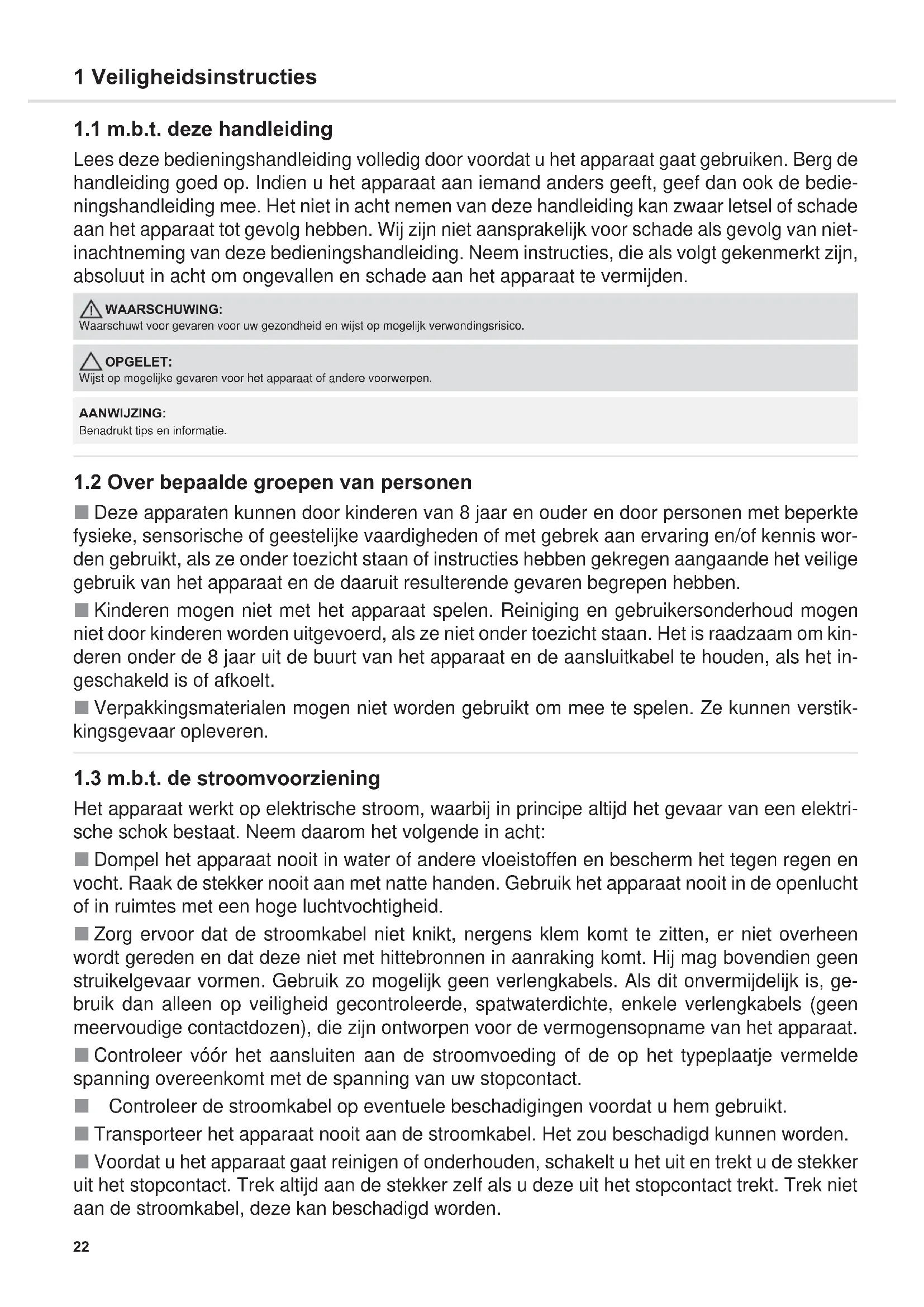 Deze apparaten kunnen door kinderen van 8 jaar en ouder en door personen met beperkte fysieke, sensorische of geestelijke vaardigheden of met gebrek aan ervaring en/of kennis wor- den gebruikt, als ze onder toezicht staan of instructies hebben gekregen aangaande het veilige gebruik van het apparaat en de daaruit resulterende gevaren begrepen hebben. Kinderen mogen niet met het apparaat spelen. Reiniging en gebruikersonderhoud mogen niet door kinderen worden uitgevoerd, als ze niet onder toezicht staan. Het is raadzaam om kin- deren onder de 8 jaar uit de buurt van het apparaat en de aansluitkabel te houden, als het in- geschakeld is of afkoelt. Verpakkingsmaterialen mogen niet worden gebruikt om mee te spelen. Ze kunnen verstik- kingsgevaar opleveren.