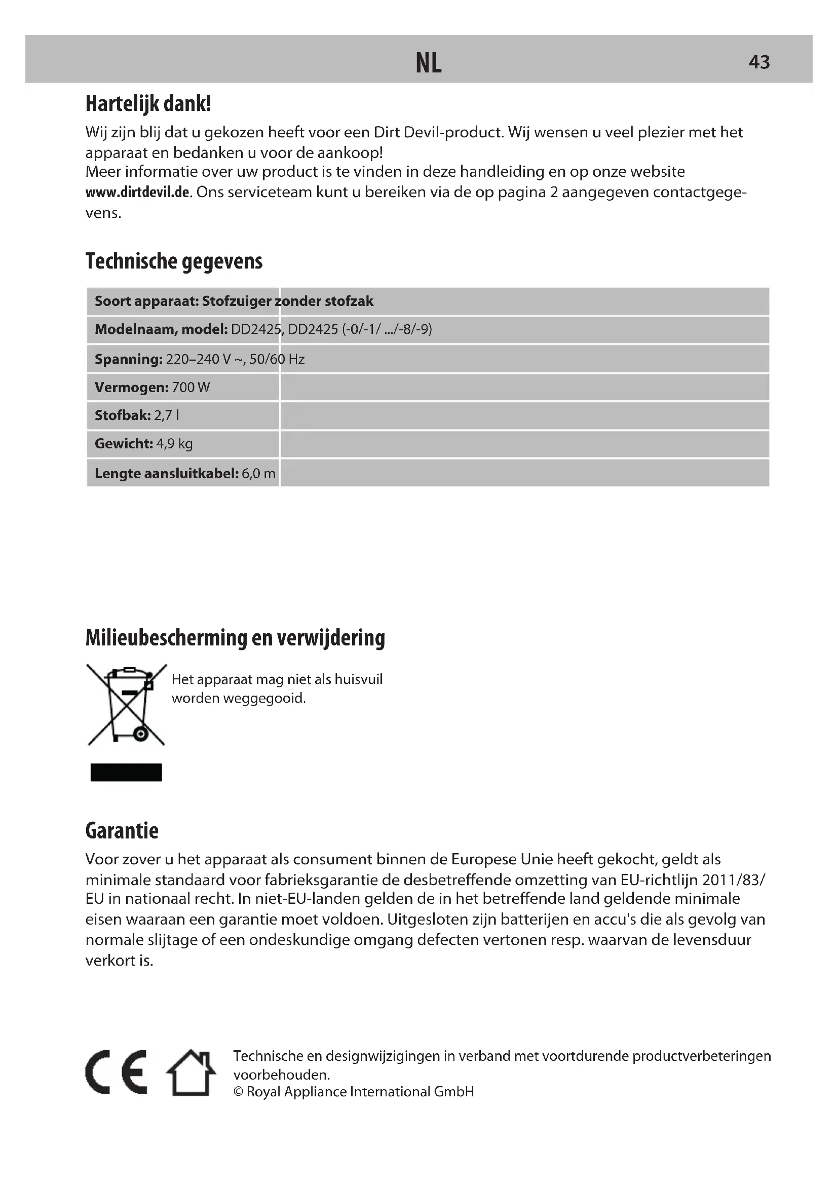PTMilieubescherming en verwijdering Het apparaat mag niet als huisvuil worden weggegooid. Garantie Voor zover u het apparaat als consument binnen de Europese Unie heeft gekocht, geldt als minimale standaard voor fabrieksgarantie de desbetreende omzetting van EU-richtlijn 2011/83/ EU in nationaal recht. In niet-EU-landen gelden de in het betreende land geldende minimale eisen waaraan een garantie moet voldoen. Uitgesloten zijn batterijen en accu's die als gevolg van normale slijtage of een ondeskundige omgang defecten vertonen resp. waarvan de levensduur verkort is. Technische en designwijzigingen in verband met voortdurende productverbeteringen voorbehouden. © Royal Appliance International GmbH Hartelijk dank! Wij zijn blij dat u gekozen heeft voor een Dirt Devil-product. Wij wensen u veel plezier met het apparaat en bedanken u voor de aankoop! Meer informatie over uw product is te vinden in deze handleiding en op onze website www.dirtdevil.de. Ons serviceteam kunt u bereiken via de op pagina 2 aangegeven contactgege- vens. Technische gegevens Soort apparaat: Stofzuiger zonder stofzak Modelnaam, model: DD2425, DD2425 (-0/-1/ .../-8/-9) Spanning: 220–240 V ~, 50/60 Hz Vermogen: 700 W Stofbak: 2,7 l Gewicht: 4,9 kg Lengte aansluitkabel: 6,0 m